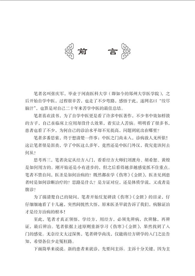 ????张庆军,男,1995年毕业于河南医科大学(现名为郑大医学院)。自幼熟读中医经典著作,对《黄帝内经》《伤寒论》《金匮要略》《温病条辨》等中医经典理论体系的代表著作颇有自己独到的见解和心得。从事临床工作多年,临证诊疗经验非常丰富。主张中医不能脱离民间,经常走访民间高人,收集民间偏方验方,且常年行医于民间。并结合众家所长,融会贯通,逐渐总结形成自己的一套理论体系,并且对伤寒学尤其有精妙的见解。