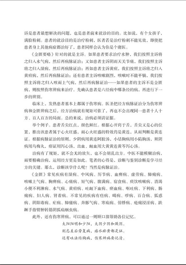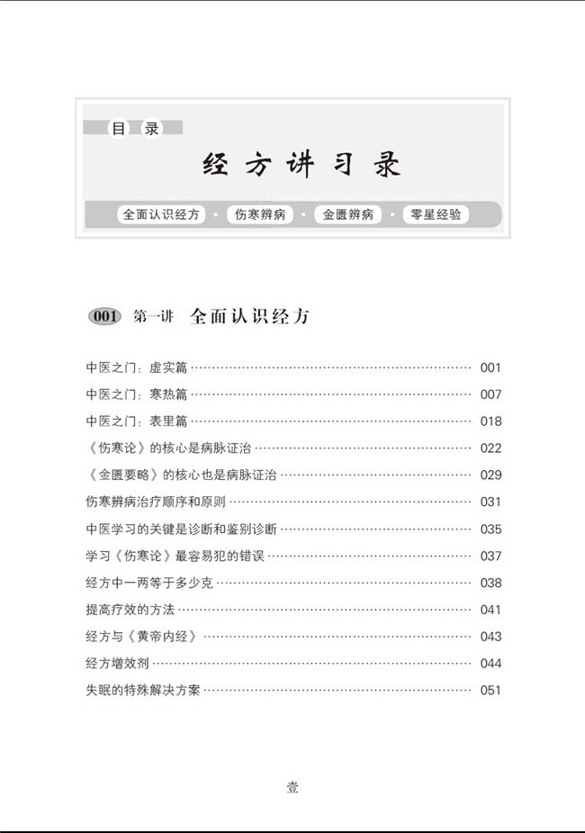 全面认识经方轻轻地为您推开中医的大门之虚实篇第二节 ???轻轻地为您推开中医的大门之寒热篇第三节 ???轻轻地为您推开中医的大门之表里篇第四节 ??《伤寒论》的核心是病脉证治第五节 ??《金匮要略》的核心也是病脉证治第六节 ???伤寒辨病治疗顺序和原则第七节 ???中医学习的关键是诊断和鉴别诊断第八节 ???学习《伤寒论》Z容易犯的错误第九节 ???经方里一两等于多少克第十节 ???提高疗效的方法第十一节 ???经方与《黄帝内经》第十二节 ???经方增效剂第十三节 ???失眠的特殊解决方案第二章 ?伤寒辨病太阳病病脉证治第二节 ????阳明病病脉证治第三节 ???少阳病病脉证治第四节 ???太阴病病脉证治第五节 ???少阴病病脉证治第六节 ???厥阴病病脉证治第七节 ???霍乱病及阴阳易差后劳复病病脉证治第八节 ???阴阳易差后劳复病病脉证治第三章 ?金匮辨病腑经络先后病病脉证治第二节 ???痉湿暍病病脉证治第三节 ???百合狐惑阴阳毒病病脉证治第四节 ?????疟病中风历节病病脉证治第五节 ???血痹虚劳病病脉证治第六节 ???肺痿肺痈咳嗽上气病病脉证治第七节 ???奔豚气病病脉证治第八节 ???胸痹心痛短气病病脉证治第九节 ???腹满寒疝宿食病病脉证治第十节 ???五脏风寒积聚病病脉证治第十一节 ???痰饮咳嗽病病脉证治第十二节 ???消渴小便不利淋病病脉证治第十三节 ???水气病病脉证治第十四节 ???黄疸病病脉证治第十五节 ???惊悸吐衄下血胸满瘀血病病脉证治第十六节 ???呕吐哕下利病病脉证治第十七节 ???疮痈肠痈浸淫病病脉证治第十八节 ???趺蹶手指臂肿转筋阴狐疝蛔虫病病脉证治第十九节 ???妇人妊娠病病脉证治第二十节 ???妇人产后病病脉证治第二十一节 ????妇人杂病病脉证治第四章 ?零星经验1.病人嗜睡为哪般2.常见的咽炎类型3.从临床学经方4.当归芍药散治再障5.低血压的解决6.都是大意惹的祸7.关于哮喘的思考8.鸡蛋汤治疗输液后呃逆,体温低9.脚癣的治疗10.经方部位辨证应用11.囊肿的治疗12.卵巢囊肿的治疗13.生长痛的治疗14.湿热是什么15.胃病治疗16.血液病治验回忆录过敏性紫癜17.疑难病治疗秘诀18.Z可笑的用药19.治癌经验点滴