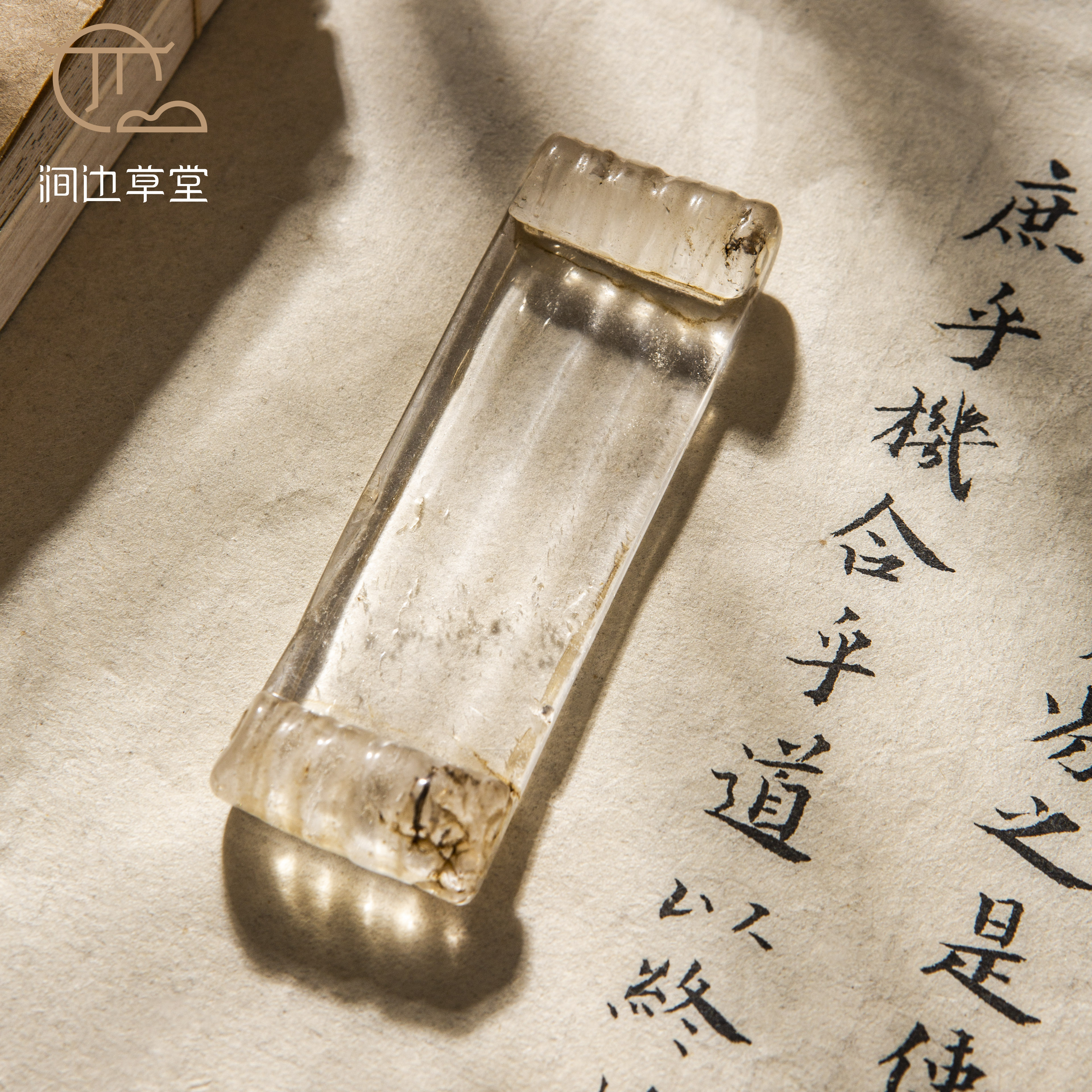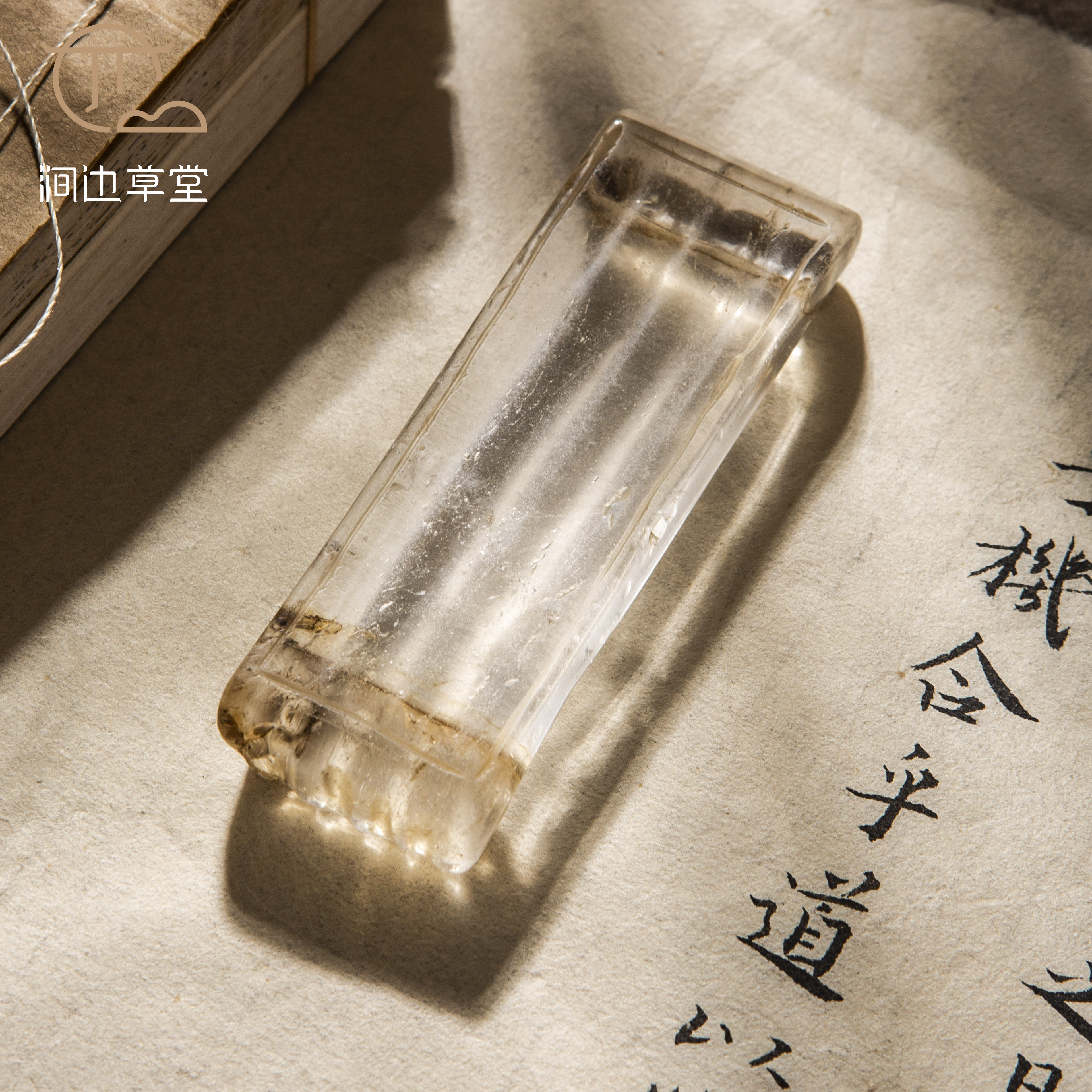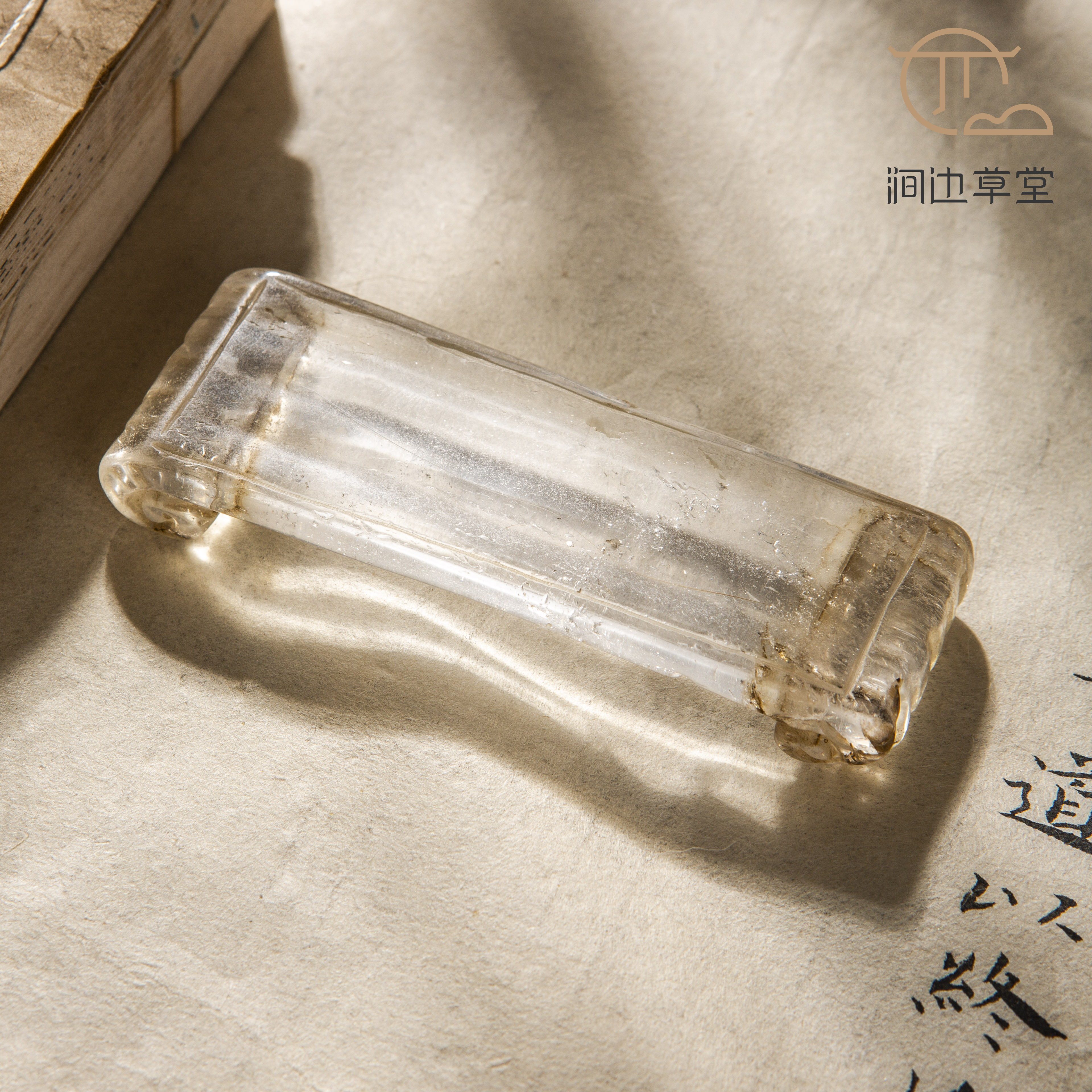 清代水晶墨床,为百年前旧物,器型制式下卷式,雅趣别致,沉稳大方。此墨床床面有笔槽,亦可当笔床使用,一床两用,可见古人之巧思。墨床材质为水晶,材质上乘,做工尤为精细,实属难得。