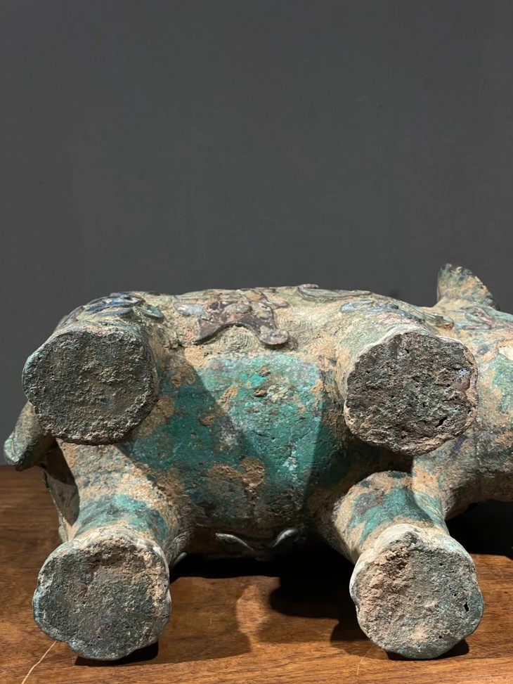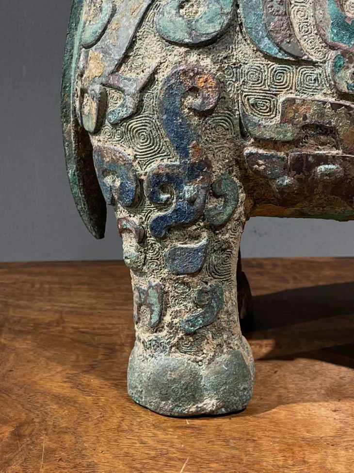 此青铜龙凤饕餮纹大象尊,如图所示,除表面正常轻微磨损与磕碰外,保存完好,表面因长年未使用与清理,稍微积累污垢与铜锈,可以依个人喜好轻微搽拭,回复青铜色皮与包浆皮壳之光泽。