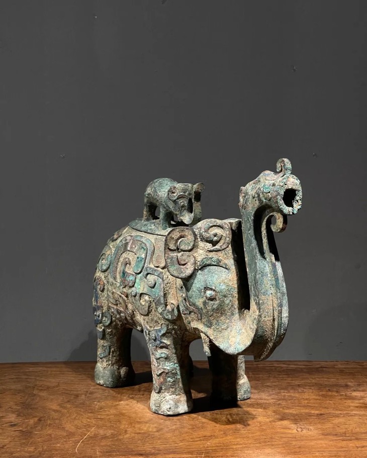 这是一件仿商代古青铜器风格的青铜龙凤饕餮纹大象尊,满布土沁铜绿锈蚀斑的古青铜器皮壳,象鼻高举四足鼎立的仿生大象形青铜尊,环绕器身深浮雕商代古青铜器龙凤饕餮与大象纹饰,象背开椭圆口,配以象钮器盖,整体古青铜器风格造型与精緻纹饰,以及自然土沁锈蚀皮壳典雅高贵、纹饰精美华丽,高古气韵十足,是难得一见的青铜象型尊,是依湖南省出土,是依循现藏于湖南省博物馆的商代青铜象尊所制作的仿古青铜器佳作。