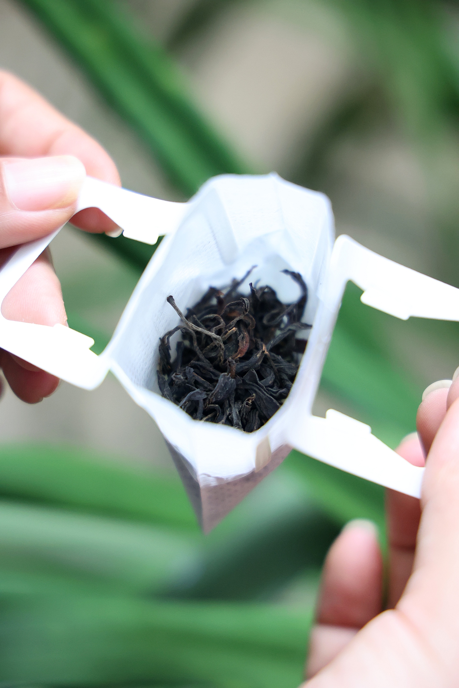 挂耳茶:撕开挂耳顶部封条,一眼可见干净完整的普洱芽叶,不掺杂碎料。