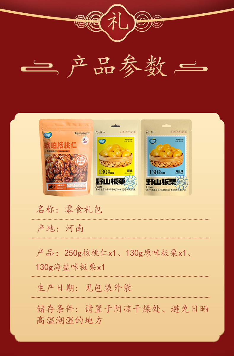 | 【品名】鸾趣原味/海盐味板栗/琥珀核桃仁 【规格】 原味板栗130g*2袋 海盐味板栗130g*2袋 琥珀核桃仁250g*2袋 原味板栗+海盐味板栗+琥珀核桃仁各1袋 【生产日期】 板栗12个月 琥珀核桃仁180天 【产地】洛阳 【发货地】洛阳 【发货快递】圆通 【不发货区域】新疆、西藏、港澳台地区不发货 【发货时效】48小时,节假日顺延 |