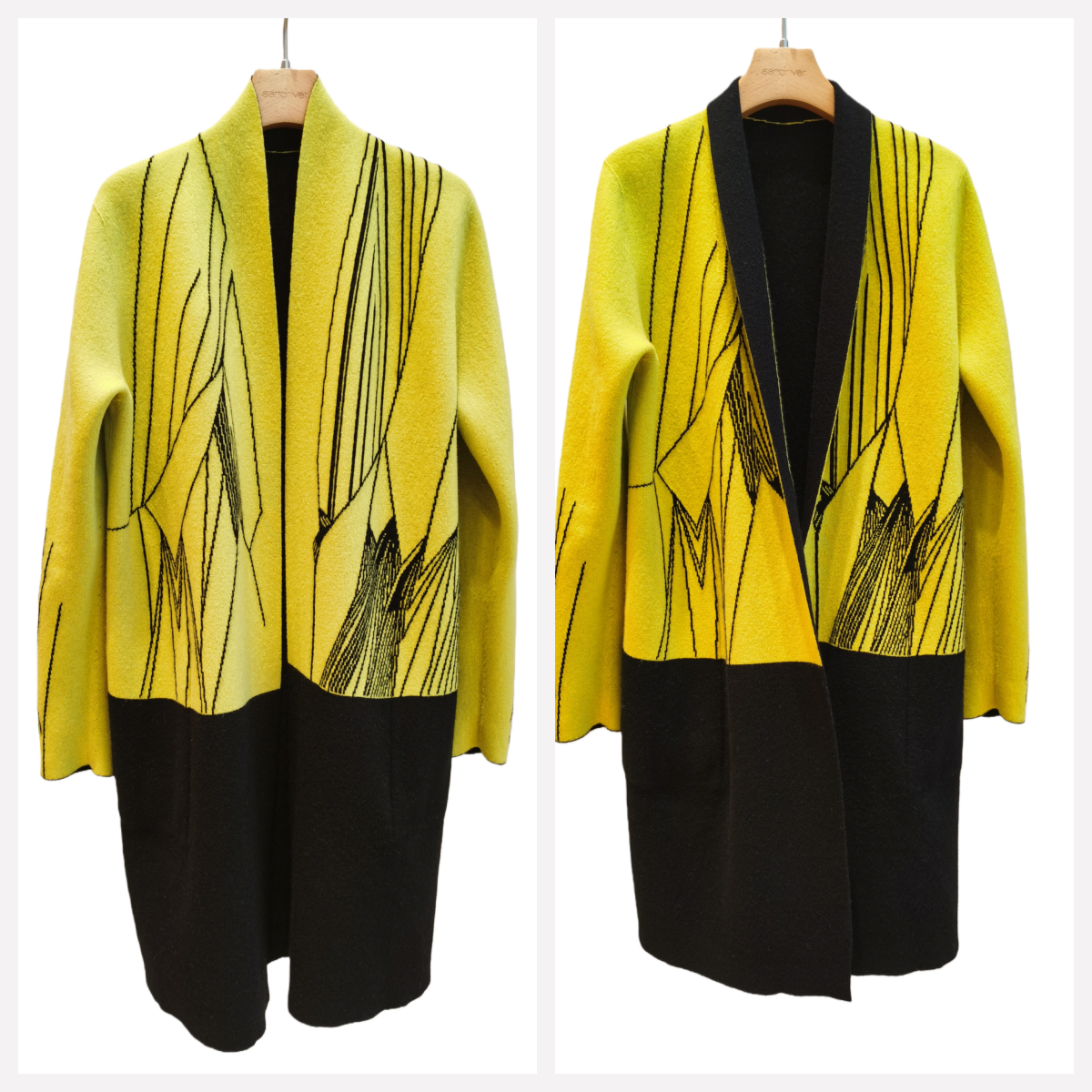 大衣采用双面可穿设计,一面黑色主色调含蓄雅致,另一面黄色调鲜明张扬,仿佛同时拥有两件气质迥异的外套,可根据心情与场合自由转换。