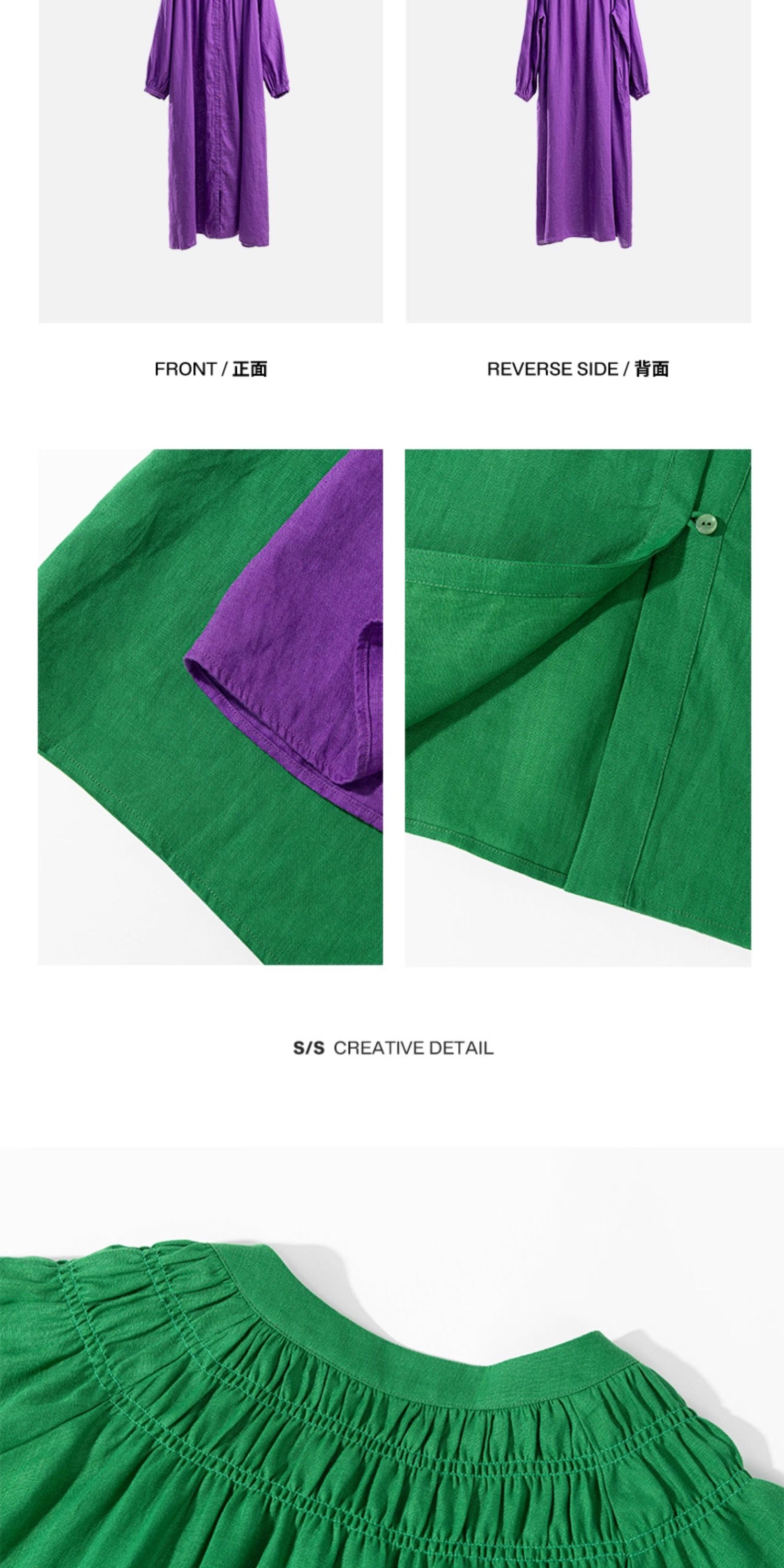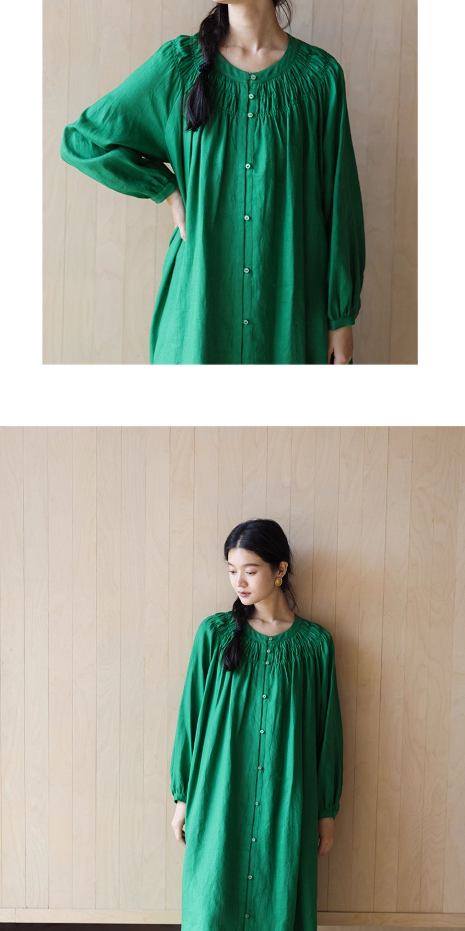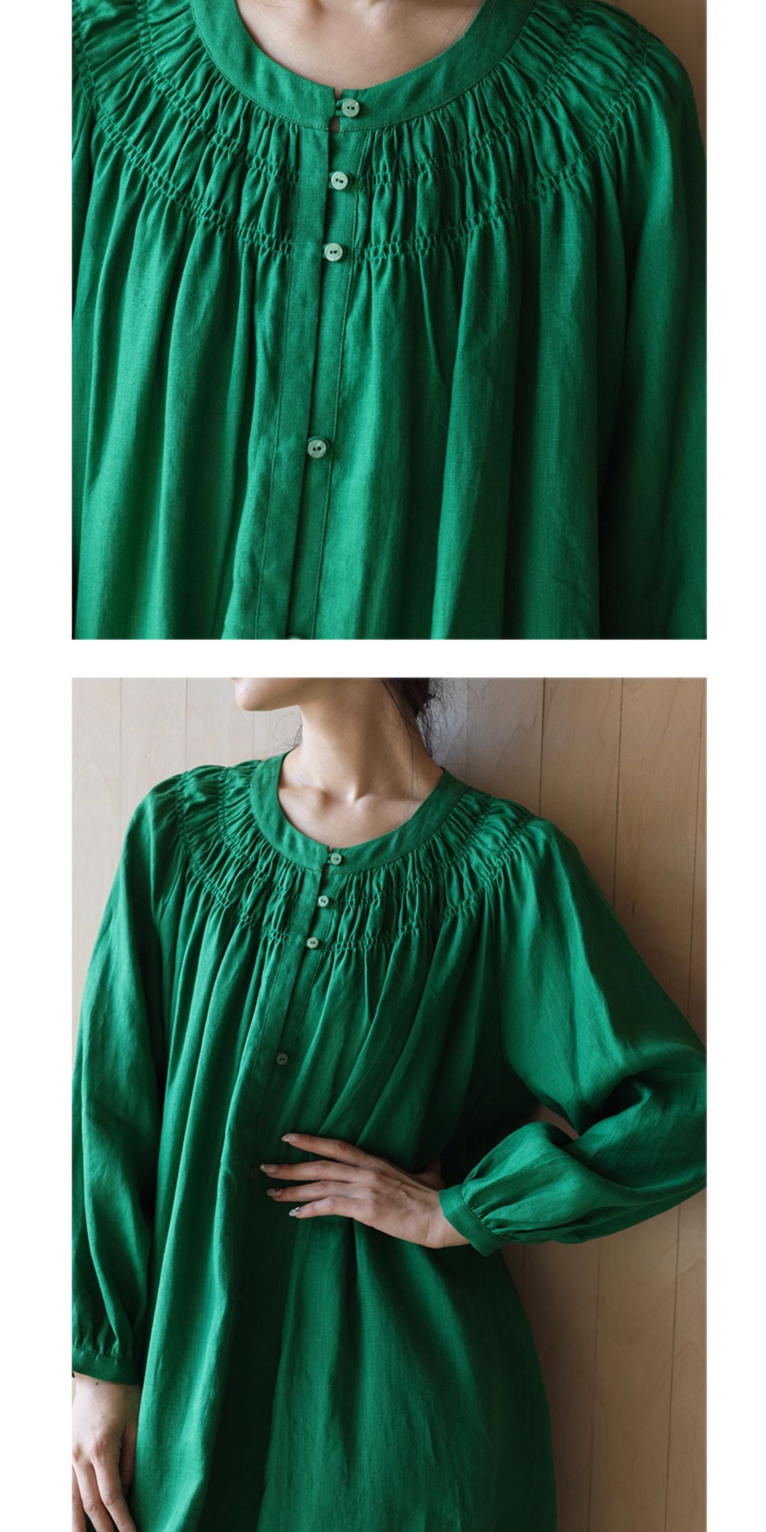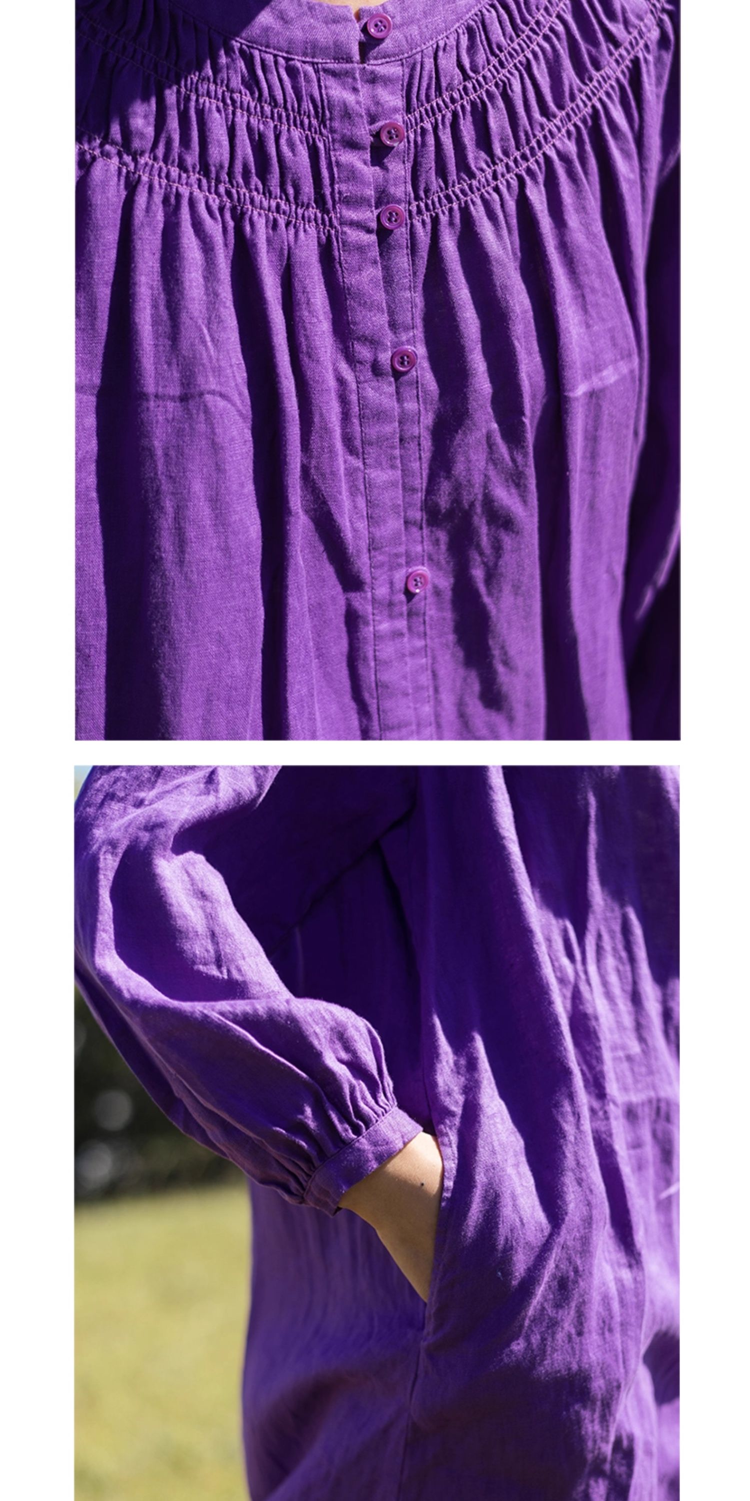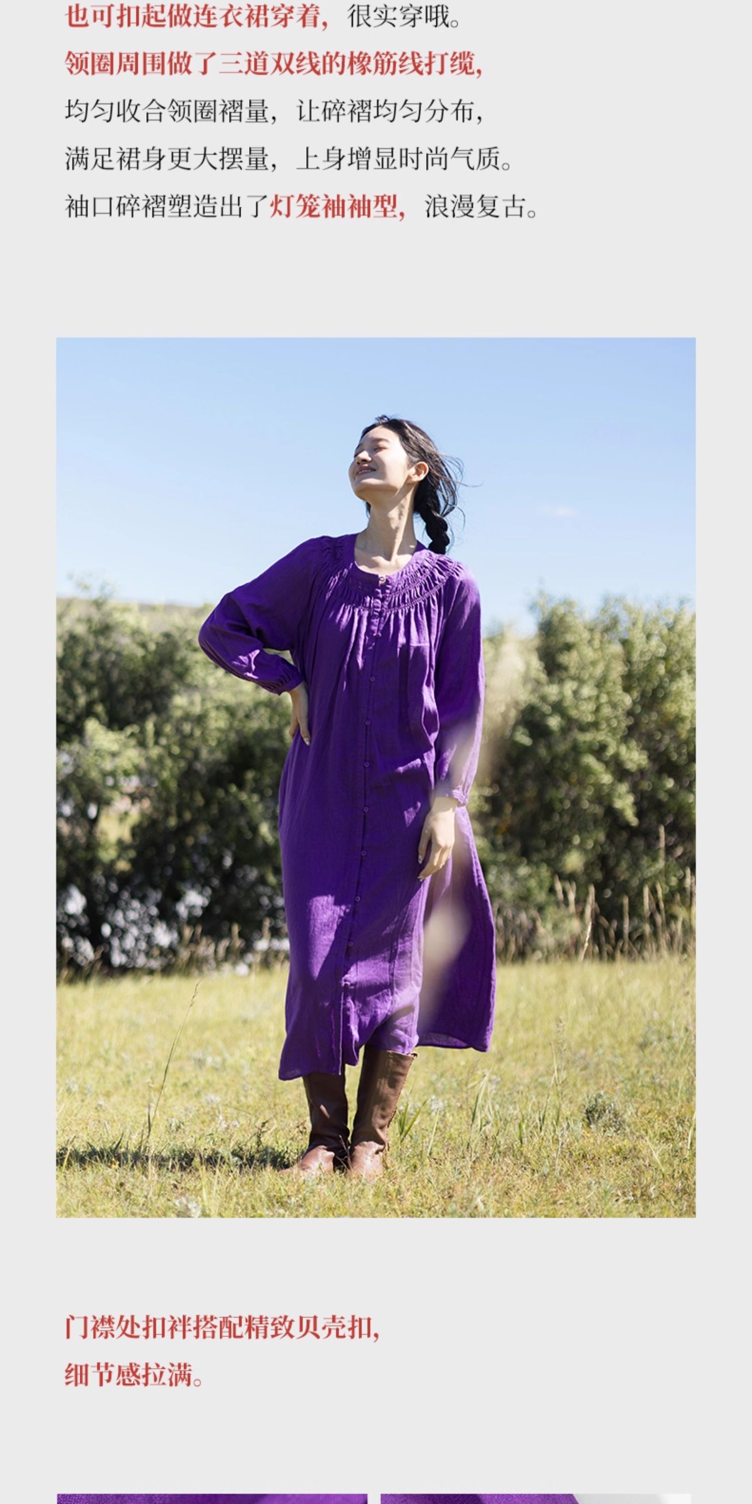 绽放697朵/纯亚麻慵懒感复古领口打揽灯笼宽松开门襟长袖连衣裙女