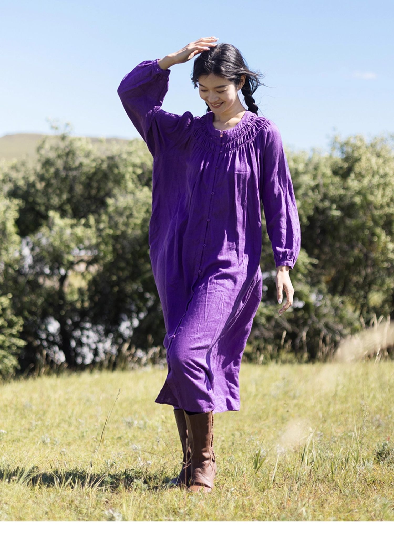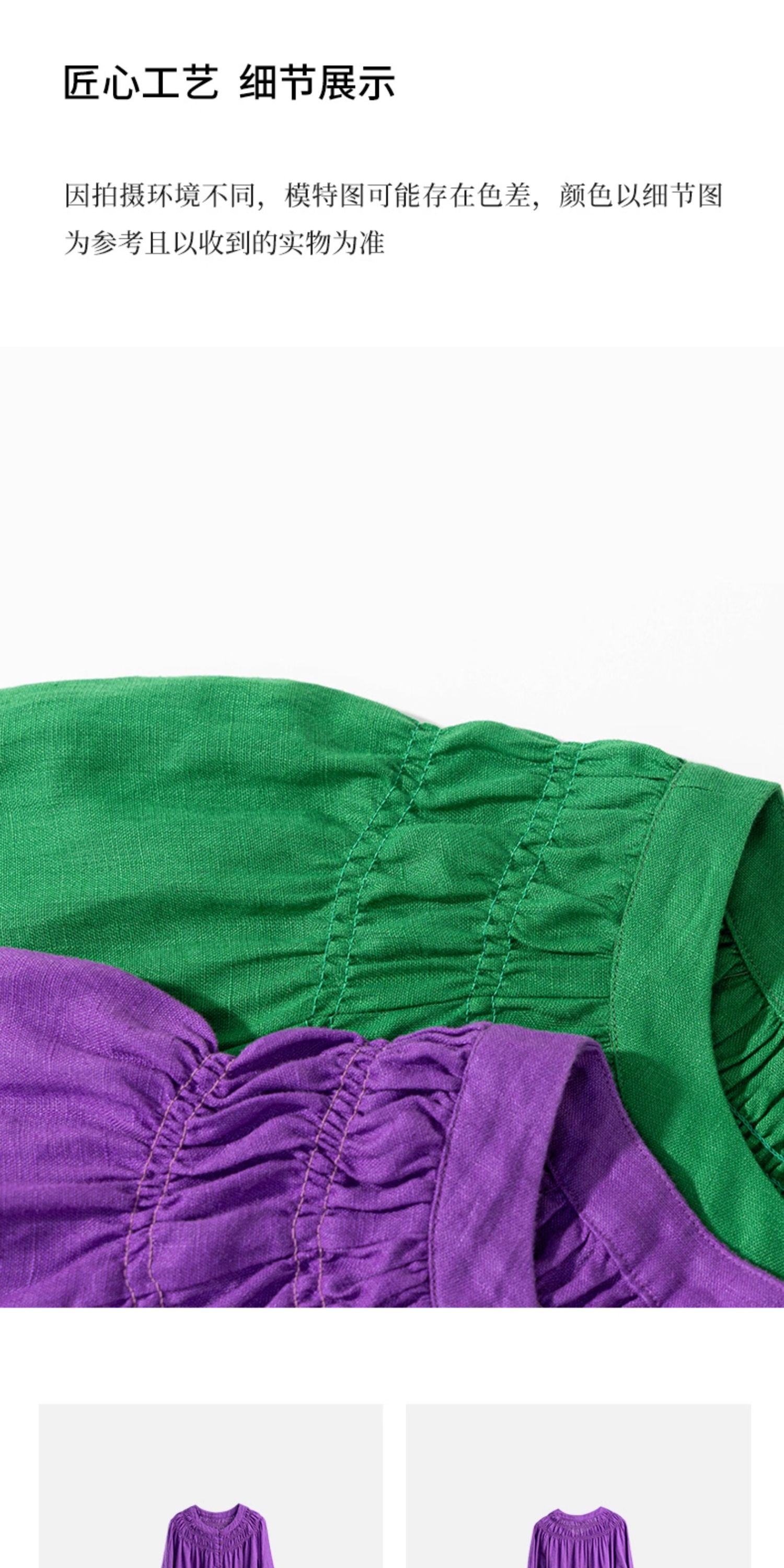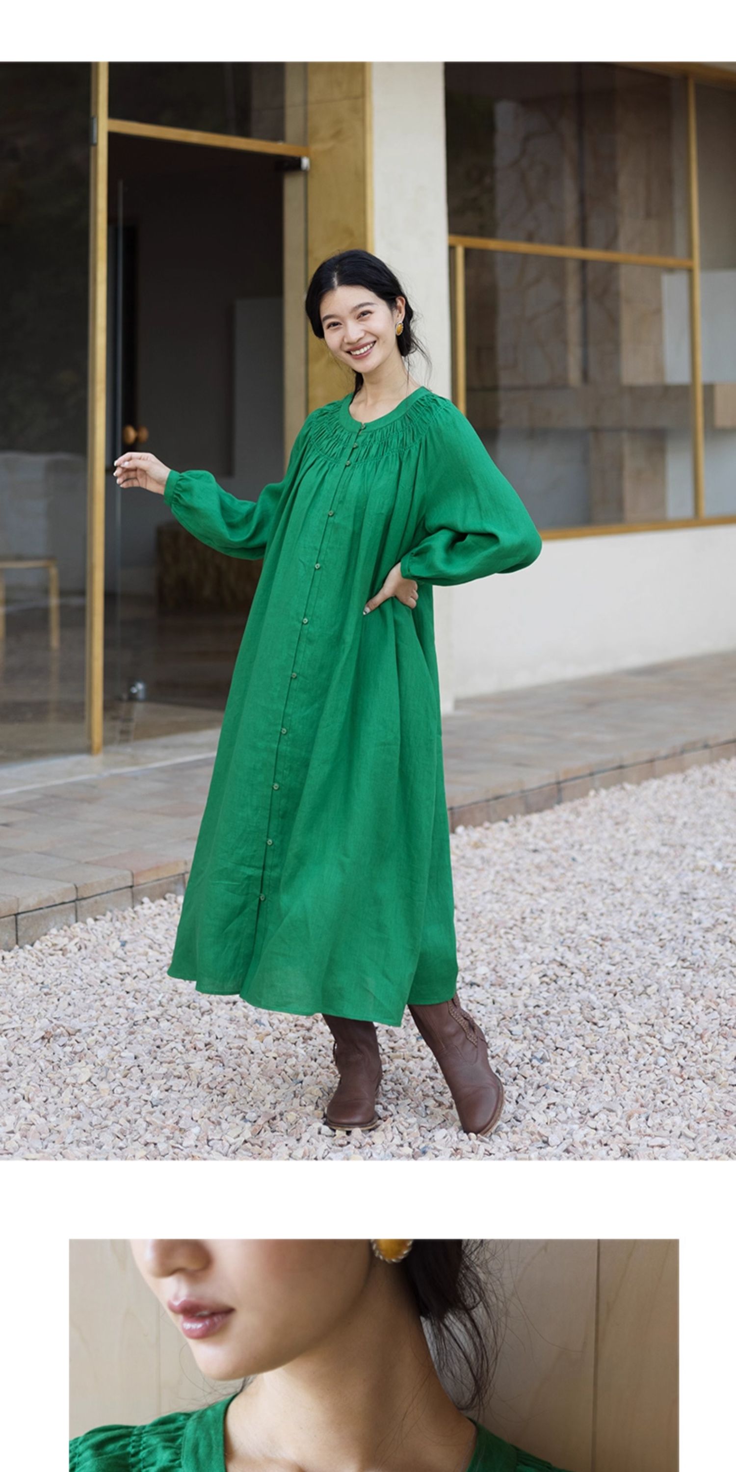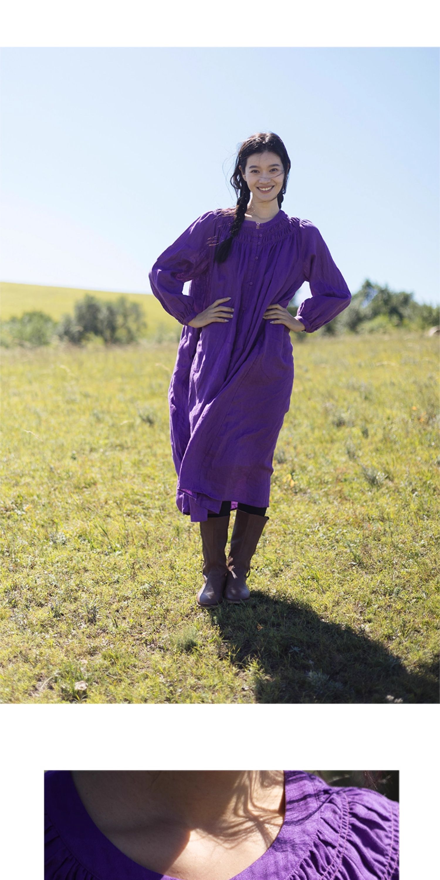 绽放697朵/纯亚麻慵懒感复古领口打揽灯笼宽松开门襟长袖连衣裙女