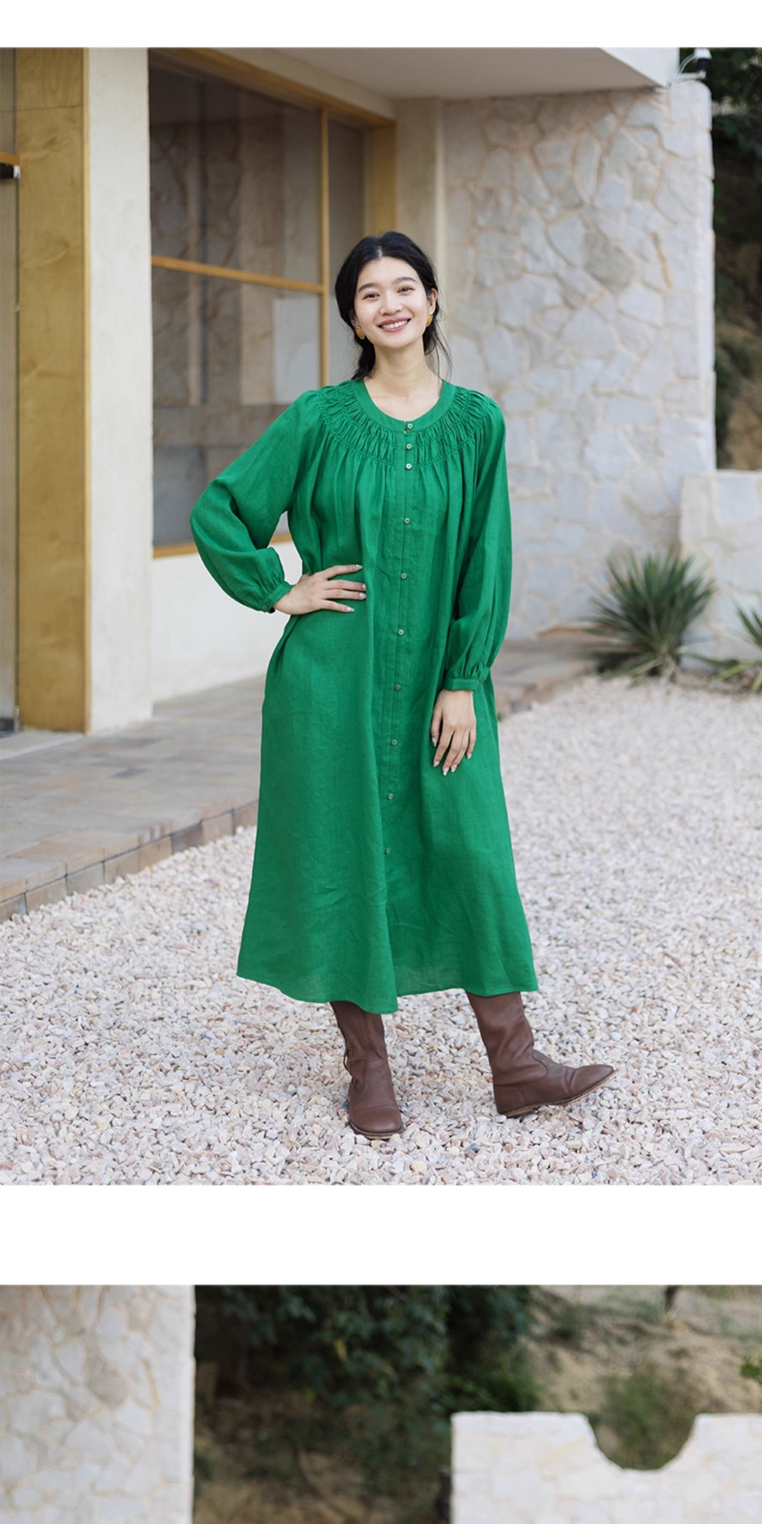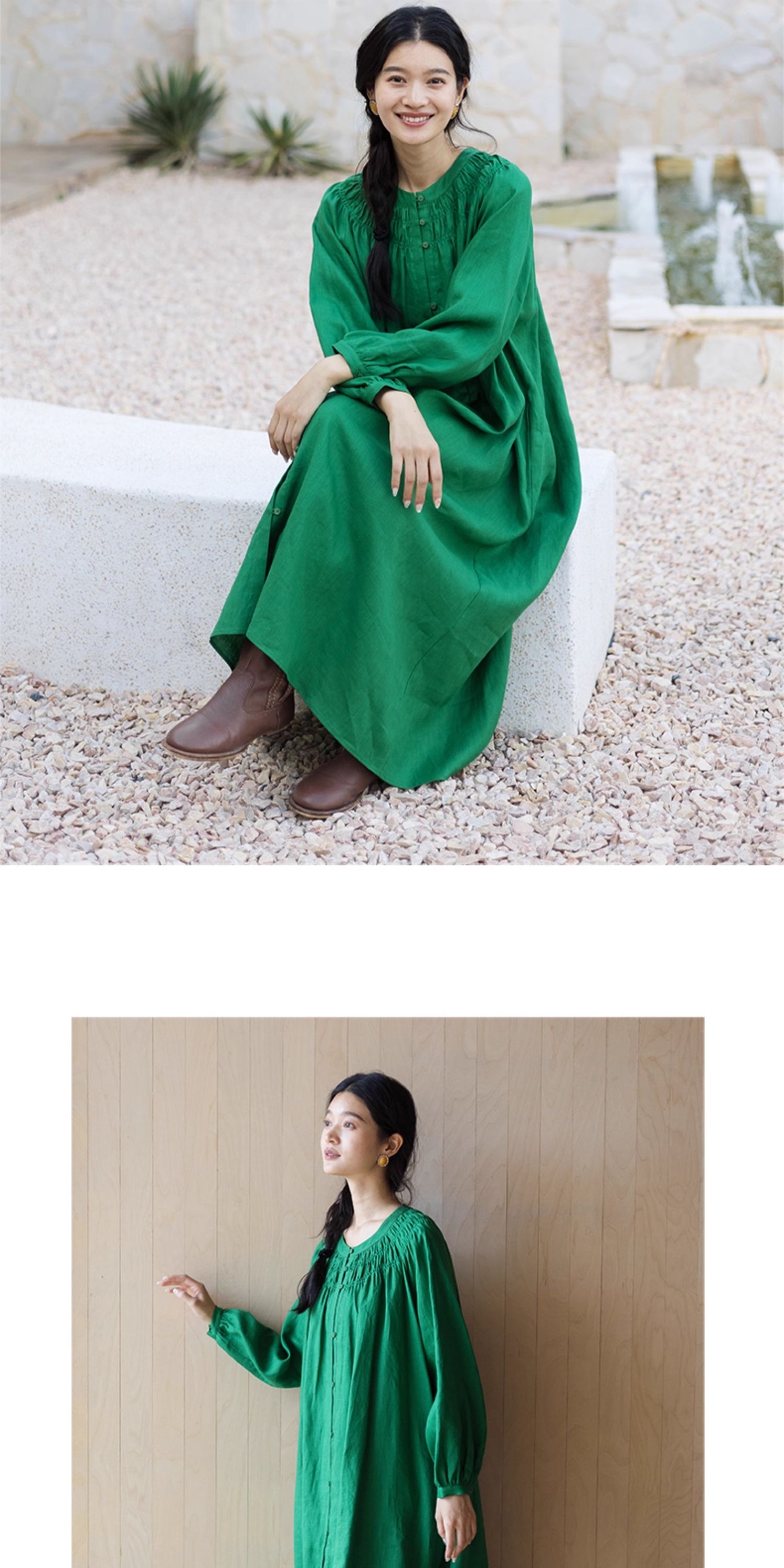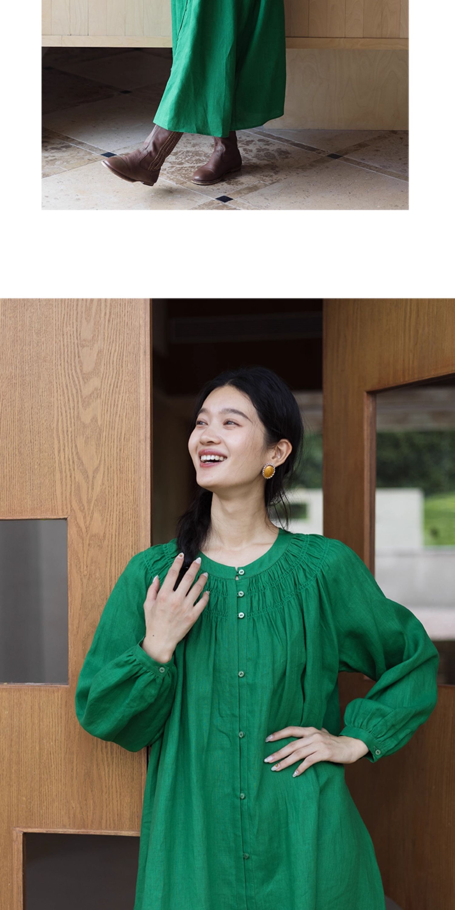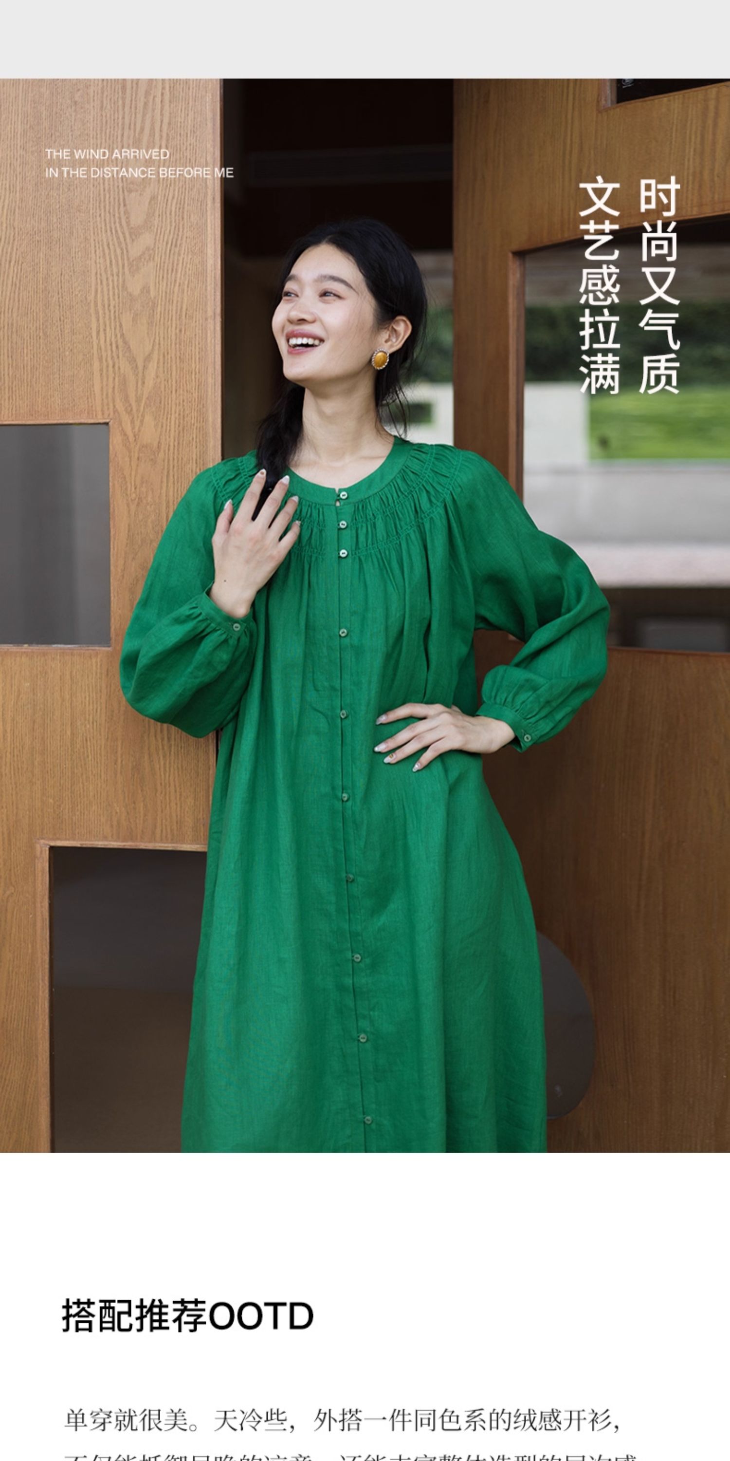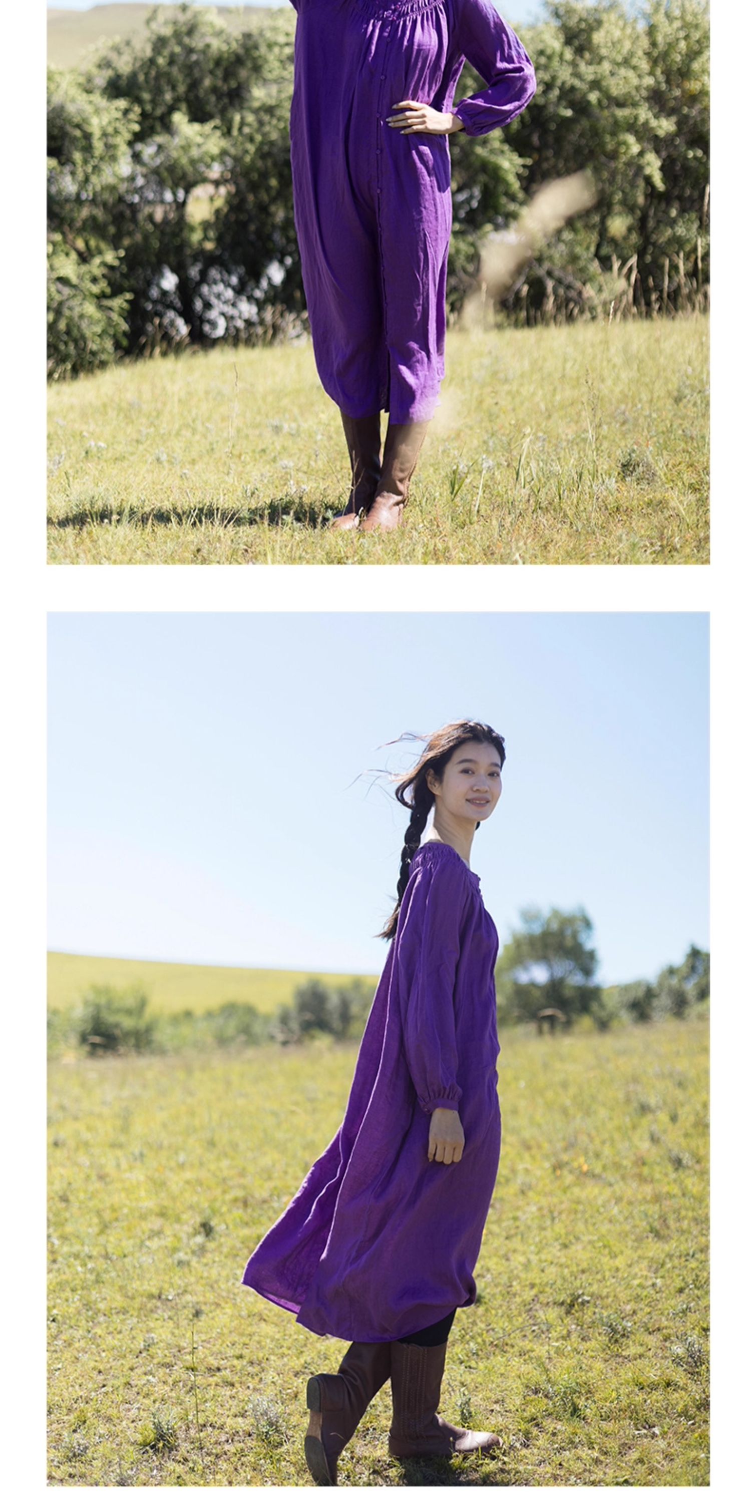 绽放697朵/纯亚麻慵懒感复古领口打揽灯笼宽松开门襟长袖连衣裙女