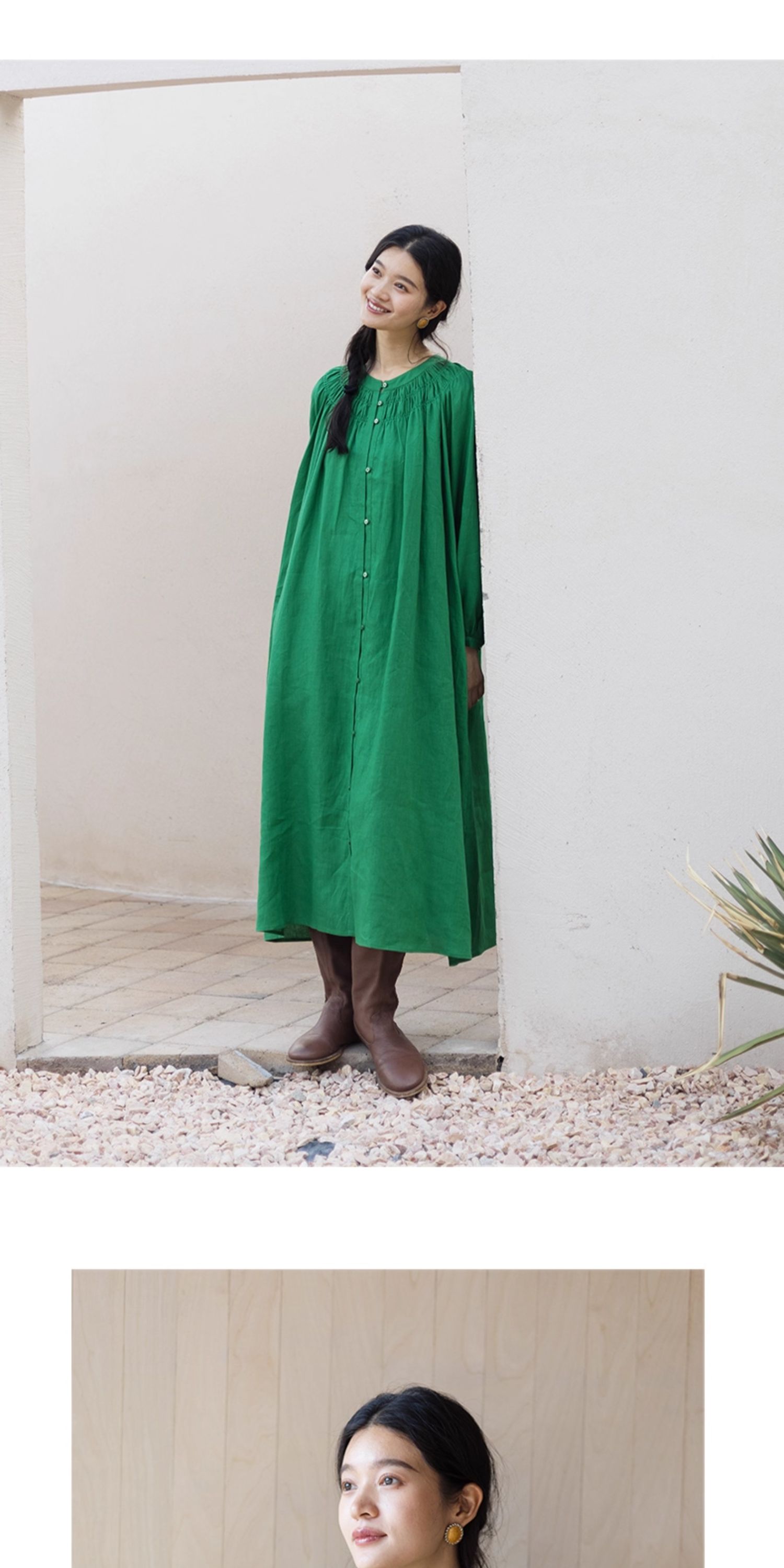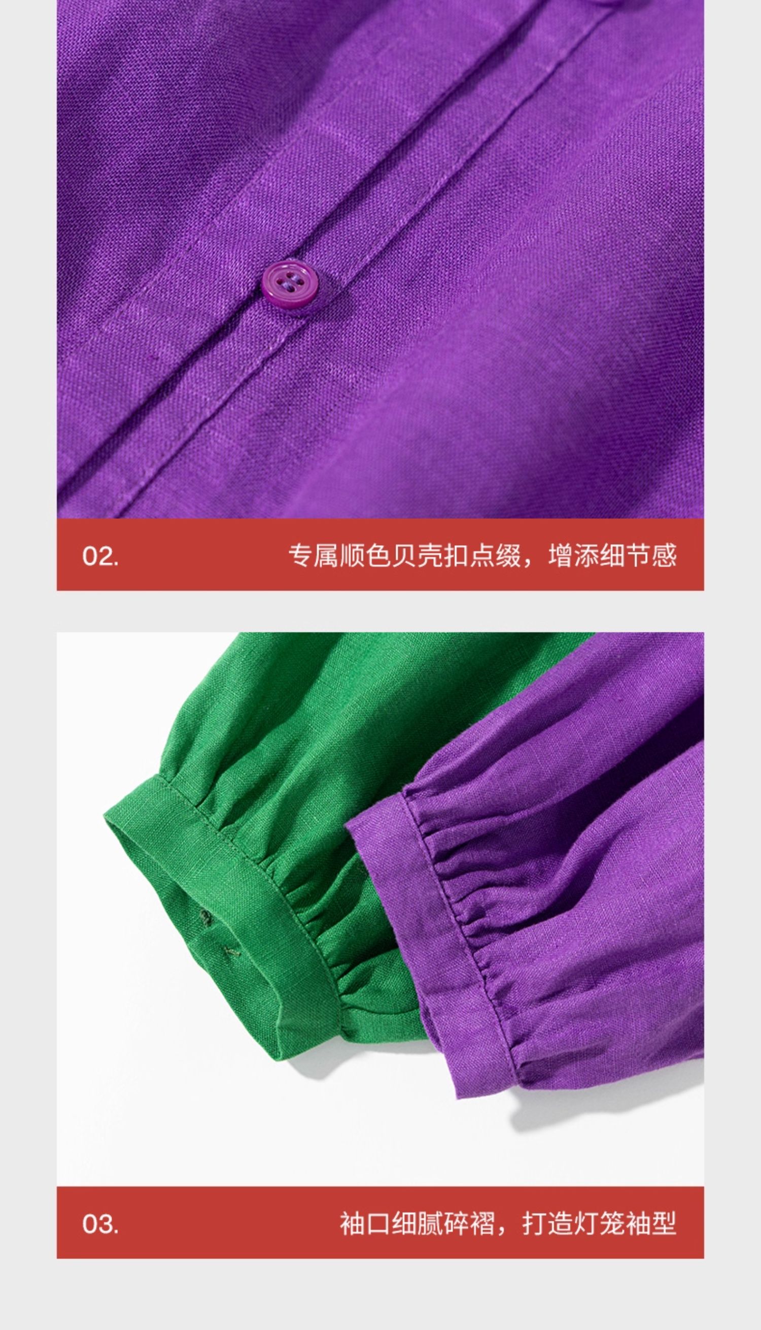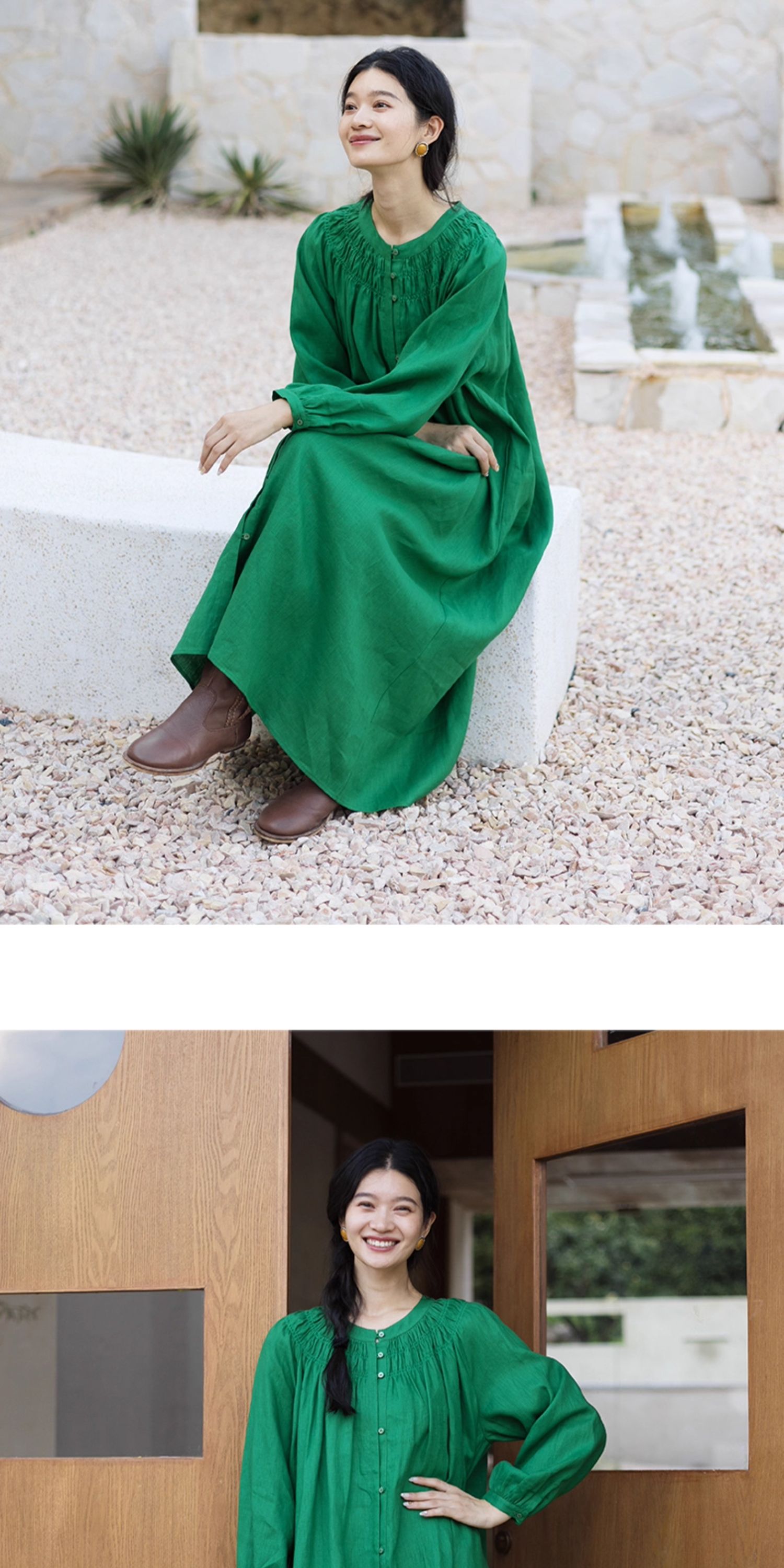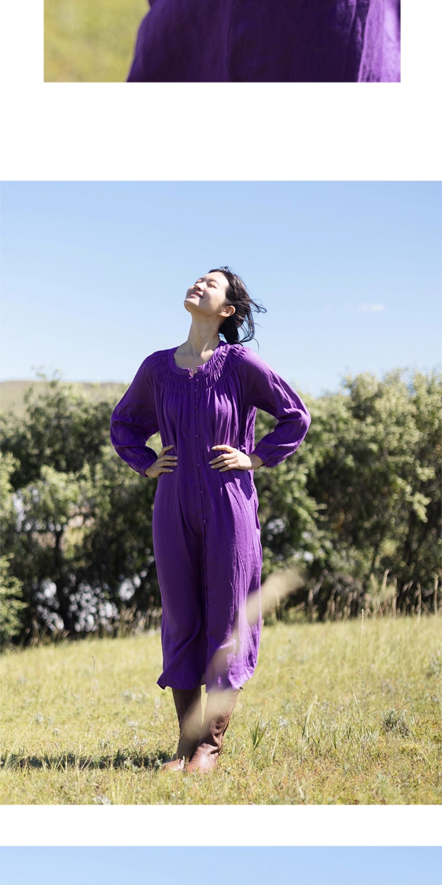 绽放697朵/纯亚麻慵懒感复古领口打揽灯笼宽松开门襟长袖连衣裙女