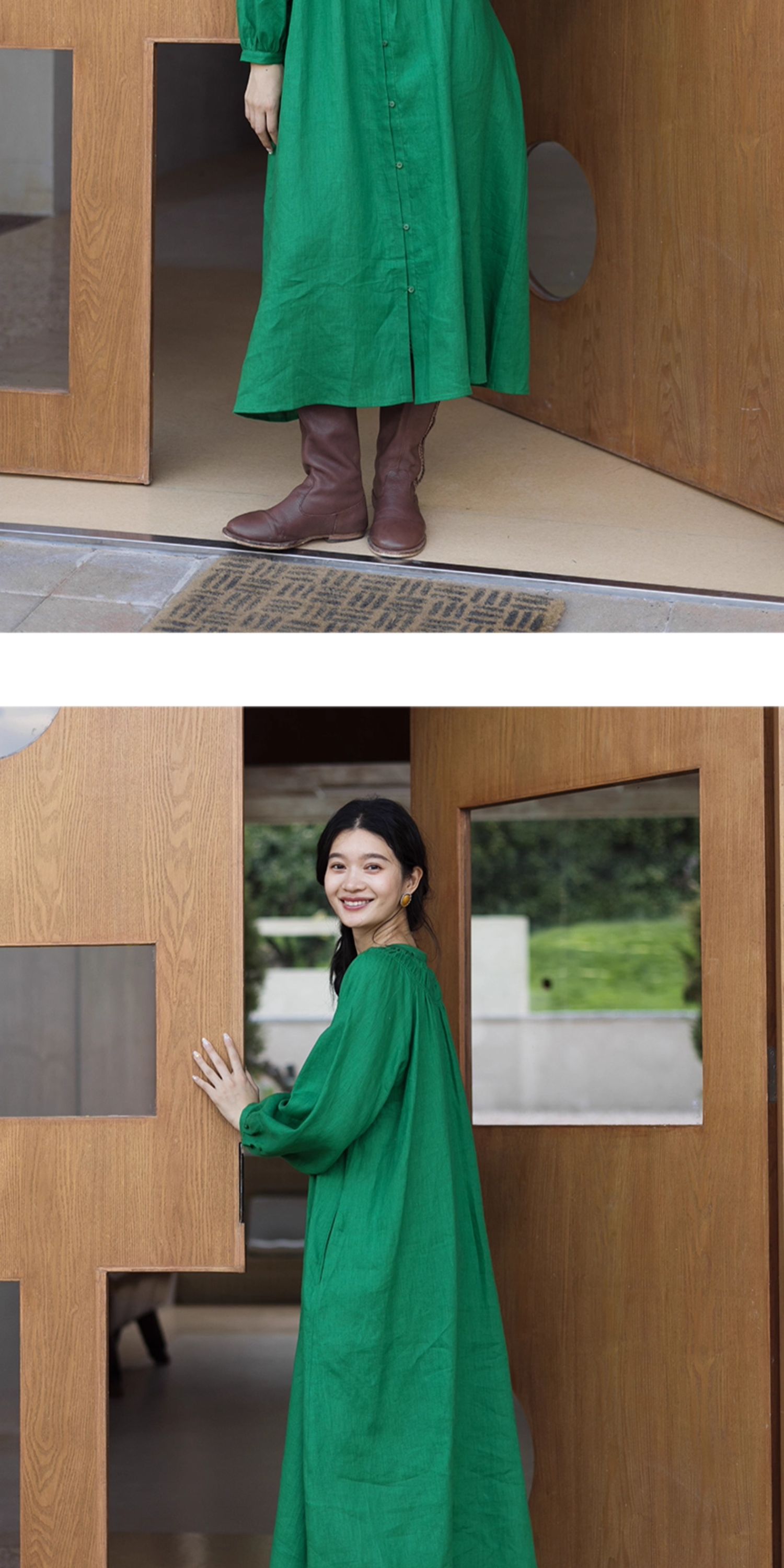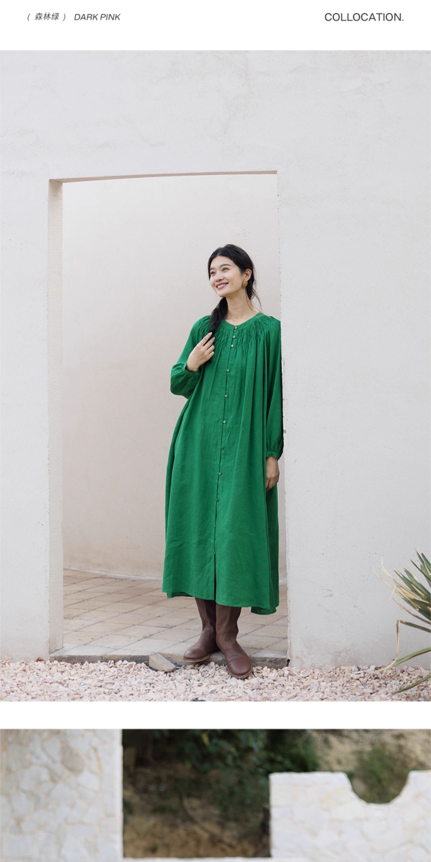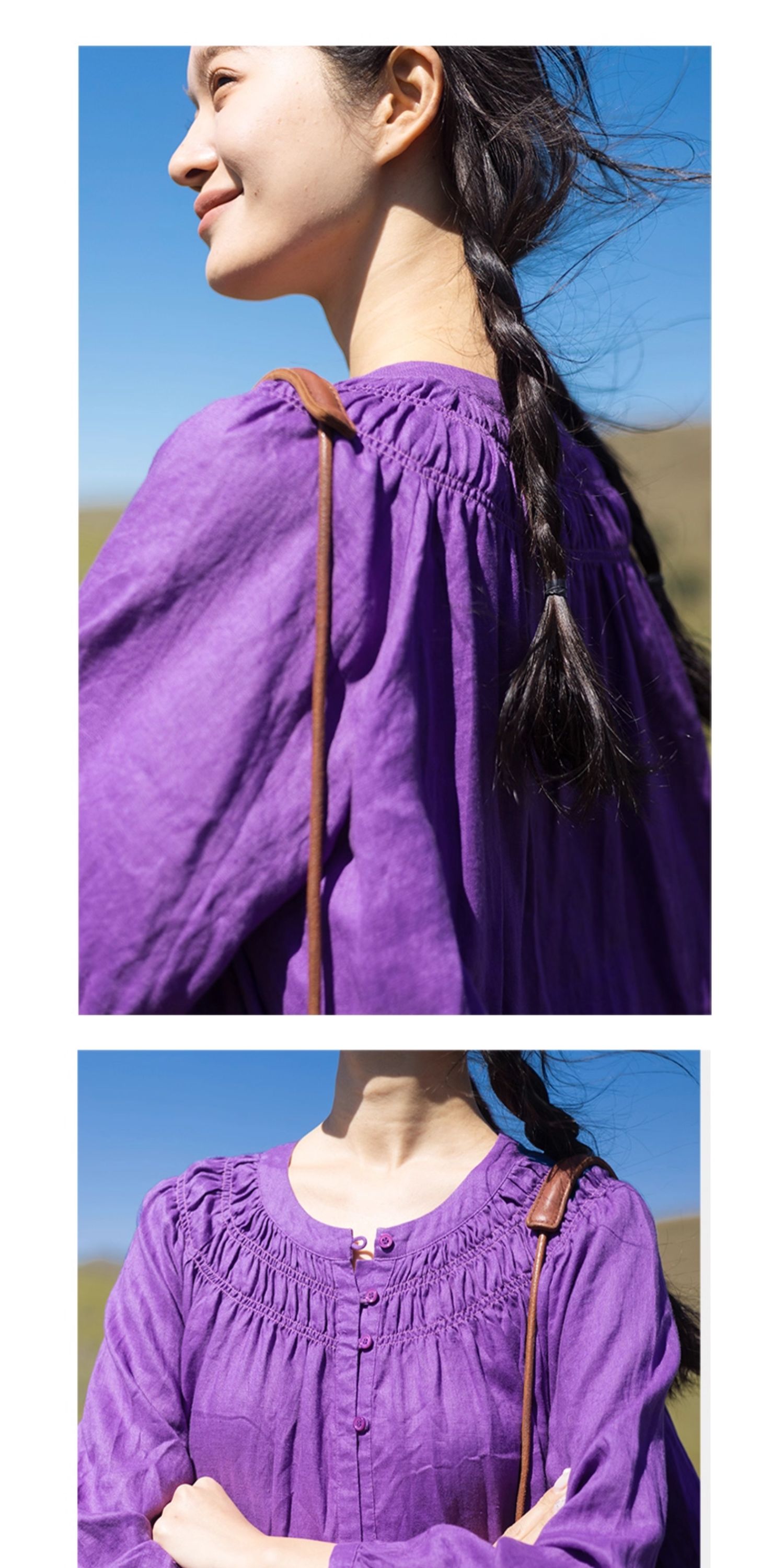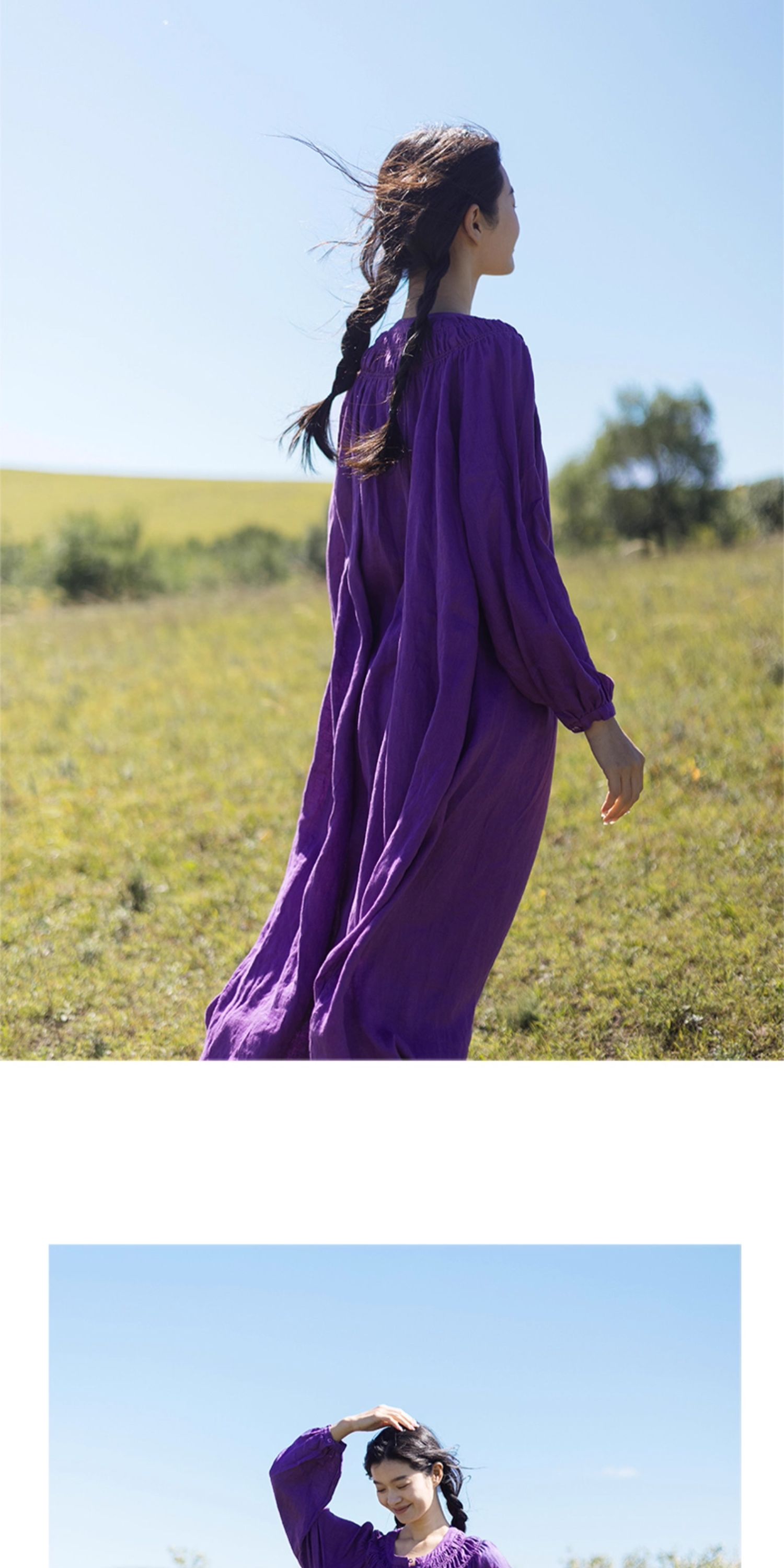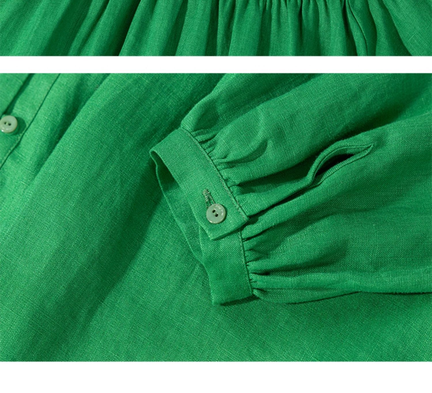 绽放697朵/纯亚麻慵懒感复古领口打揽灯笼宽松开门襟长袖连衣裙女
