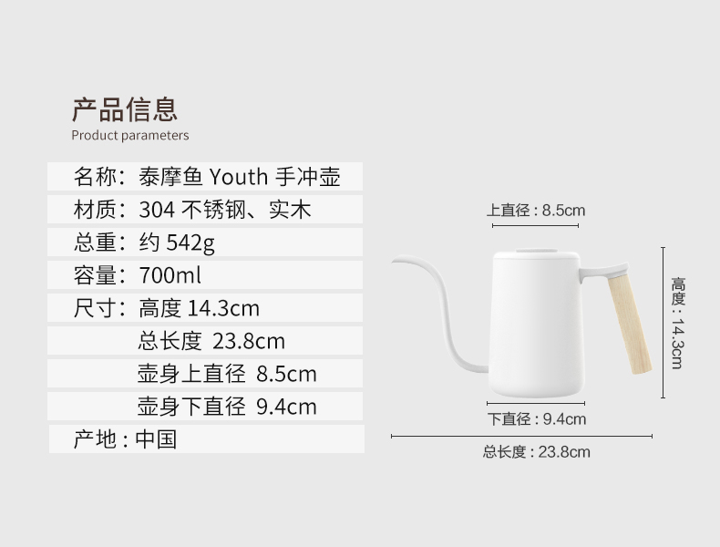 泰摩 鱼Youth手冲细嘴咖啡壶 304不锈钢滴漏式家用挂耳咖啡长嘴壶