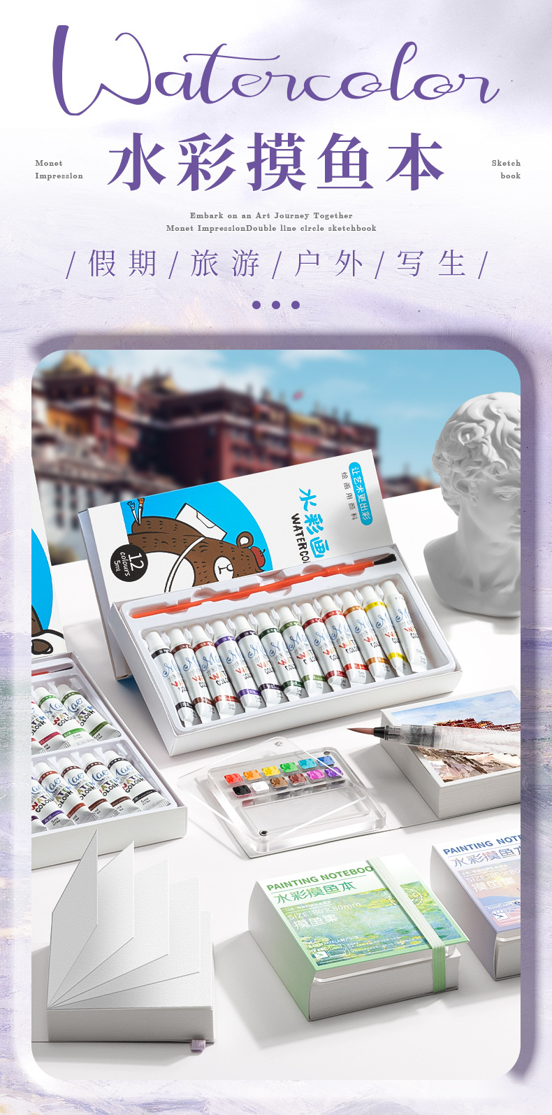 【水彩摸鱼本❗️绘画创意更随心】迷你水彩绘画本,「假期/旅游/户外/写生」外出携带便捷,旅行写生画画本,便携加厚美术颜料,开学季空白可撕摸鱼本子L