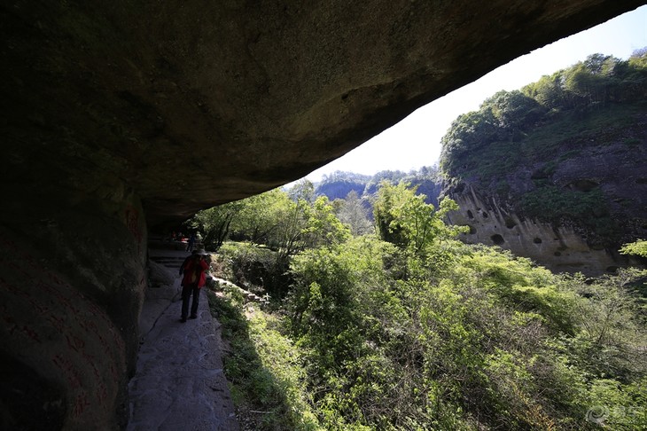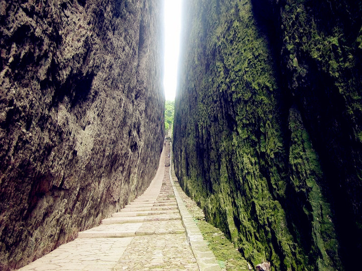 在武夷山群峰南端、二曲溪南面的一个幽邃的峡谷里,有一段绵长的山岩叫灵岩,其下覆盖了 3 个相邻的岩洞:左边的是伏羲洞,中间的是风洞,右边的是灵洞。三洞之上有一条微微向内弯曲似手写体"一"字形的岩罅,全国少见的井谷奇观一线天即为此,岩罅长 178米,最宽处才 1 米左右,最窄处仅 50 厘米,起自灵岩左端伏羲洞的洞顶,中经风洞的洞顶,止于灵洞右端灵岩后壁之外。