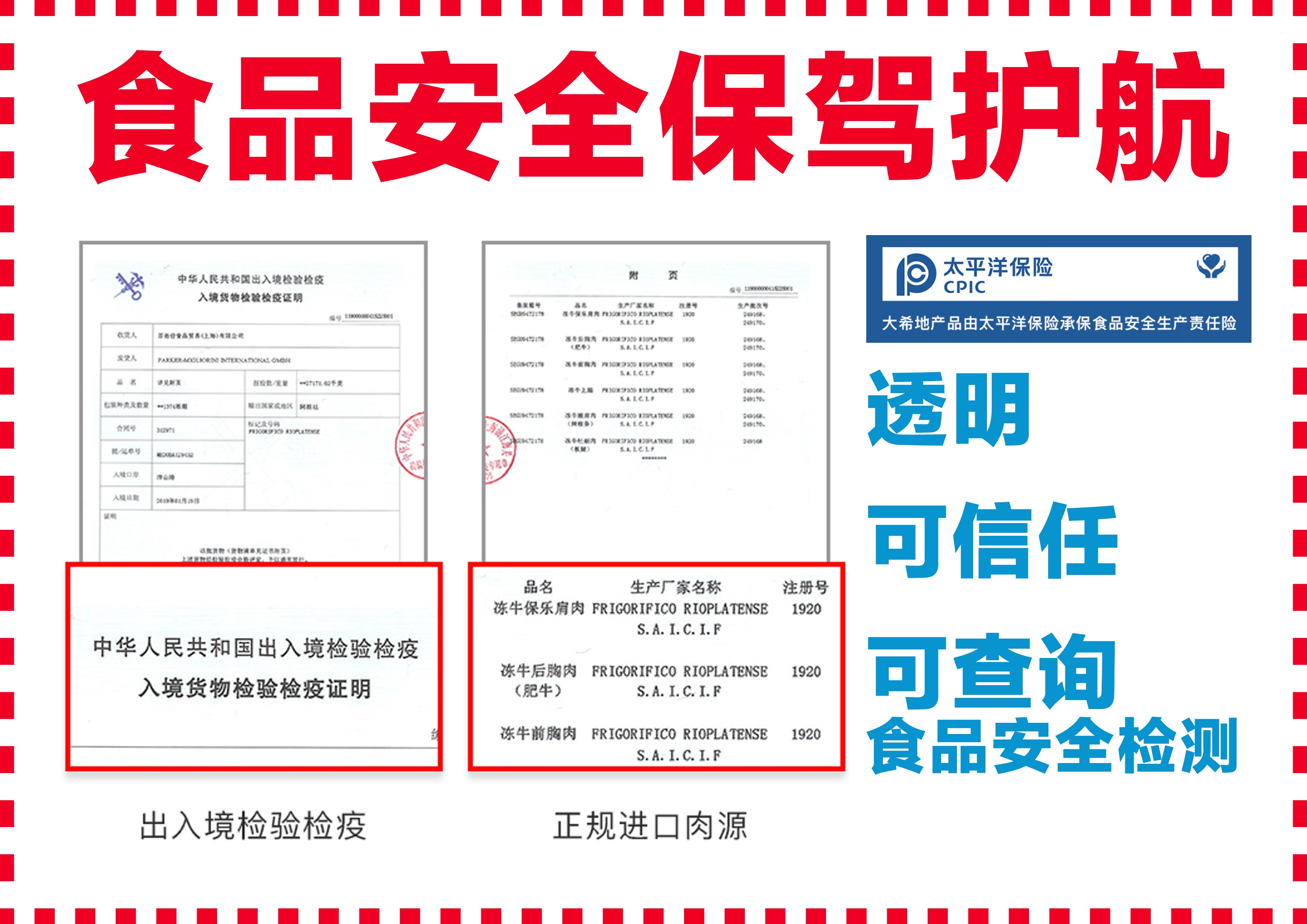 大希地在产品质量和原料采购方面进行严格把关确保食品安全,目前合作的牛肉,水产,酱料,包装等供应商主要均为国内大型上市公司或国有企业;另外所有牛肉,肉源覆盖澳洲,乌拉圭,新西兰等国际顶级产地,每批次原料都经受了海关严格的进口检验检疫,并有检验记录留存