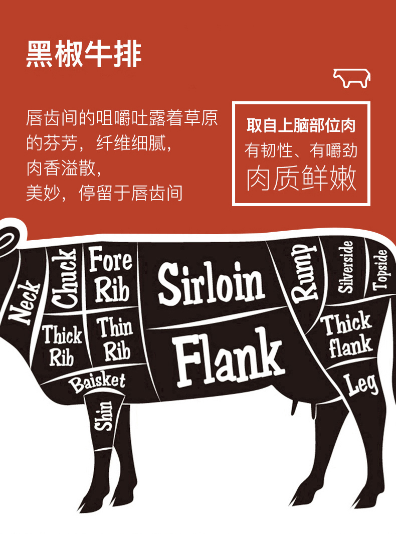 套餐里这2款黑椒牛排,精选进口草饲牛肉上脑部位肉,将完整的大块牛肉进行精修,去除筋膜和多余脂肪,入味调理,最后再切片而成,工厂无菌化生产加工,全程可追溯,保证高品质,超高性价比的入门款牛排,免去你回家还要腌制的费事过程。