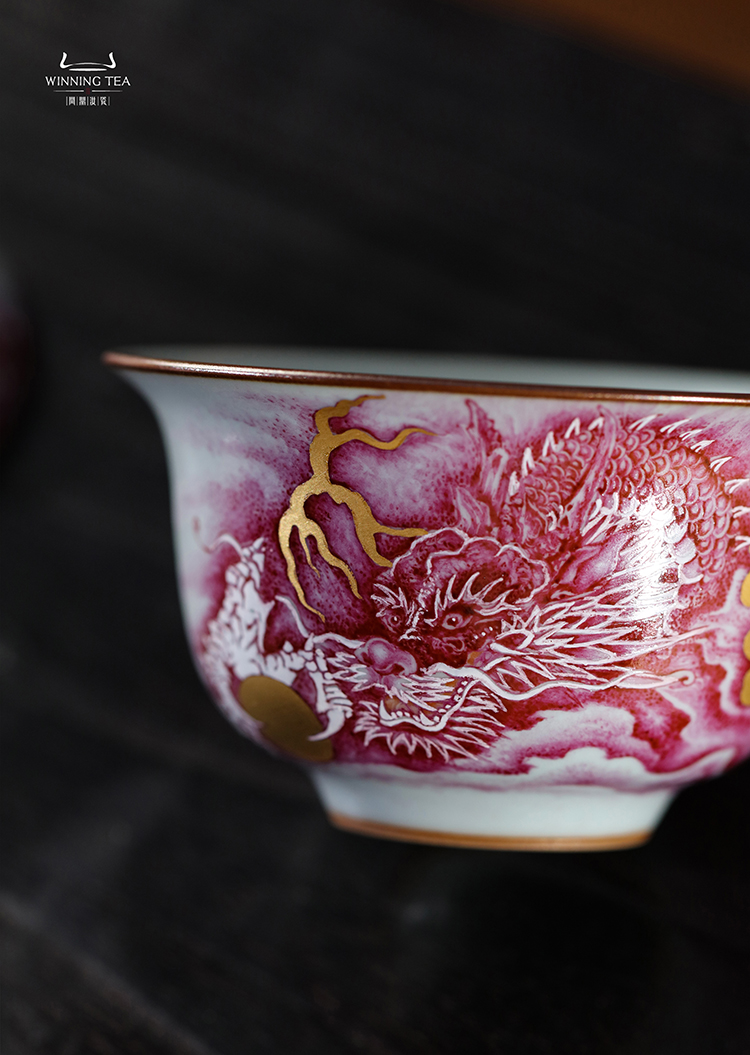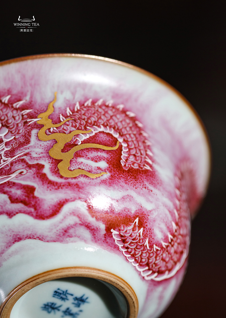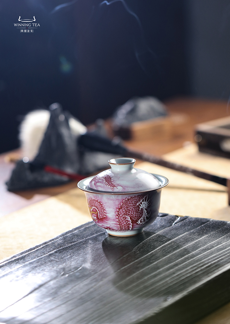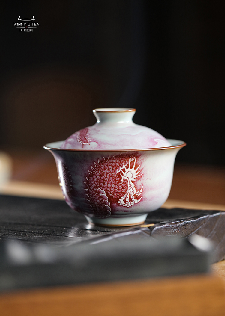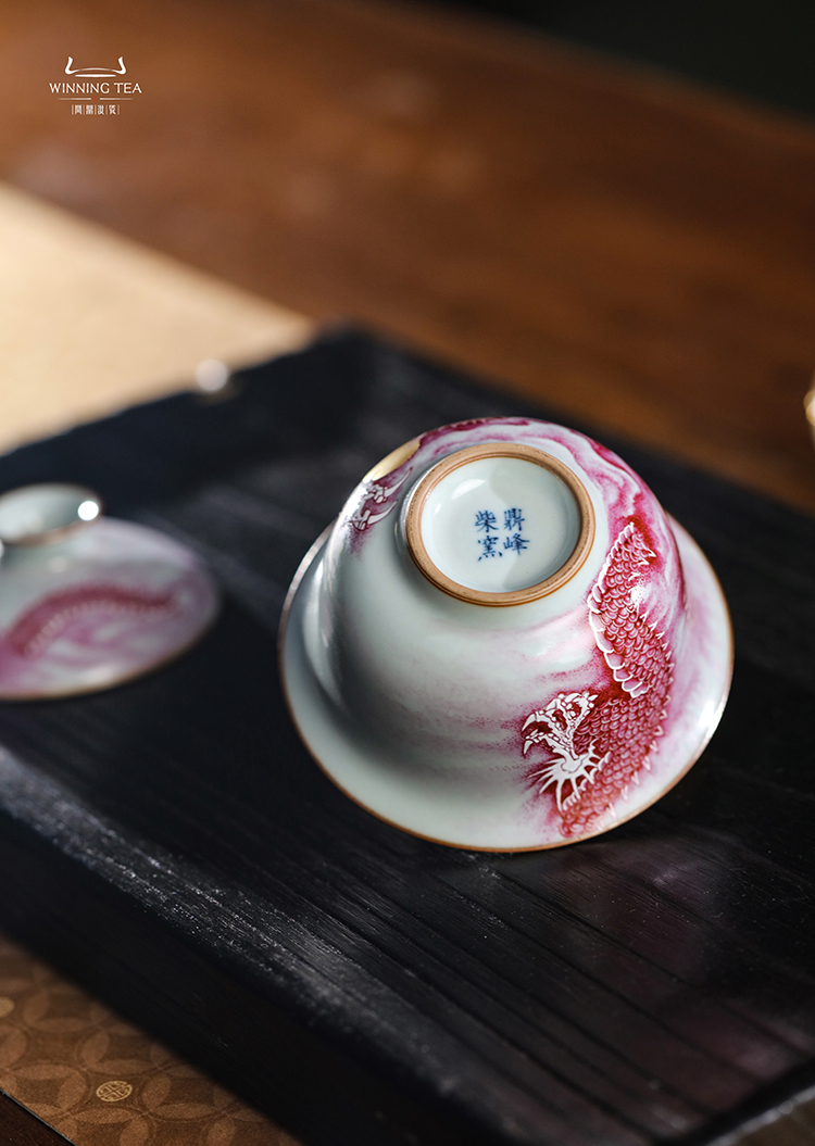 问鼎汝瓷鼎峰柴窑青蒿二才盖碗(矾红龙纹)