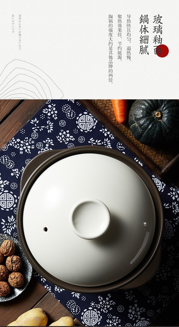 1玻璃釉面:导热快且均匀,退热慢,聚热效果佳,节约能源。玻璃釉面,锅体细腻,特有玻璃质瓷釉 易清洁好打理。锅身由陶土和进口高岭土制成,高岭土可塑性强,硬度大,烧制后的锅体更坚固耐用。