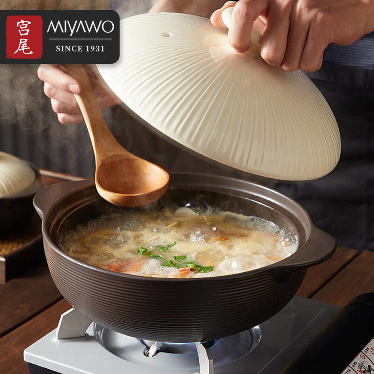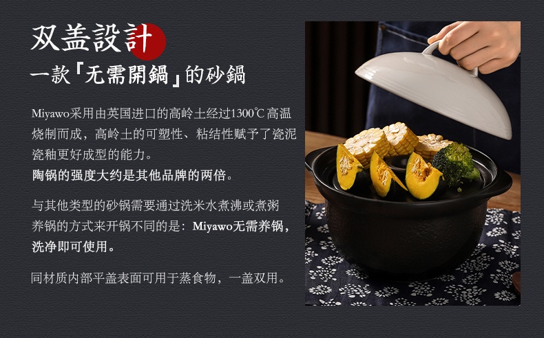 2.MIYAWO宫尾的陶土锅不需要开锅养锅,洗净即可使用。 普通沙锅土锅需要煮粥开锅养锅,养护很繁琐。锅盖及锅体的玻璃釉面平滑细致无毛孔,不同于普通砂锅需要通过洗米水煮沸或煮粥养锅的方式来开锅。