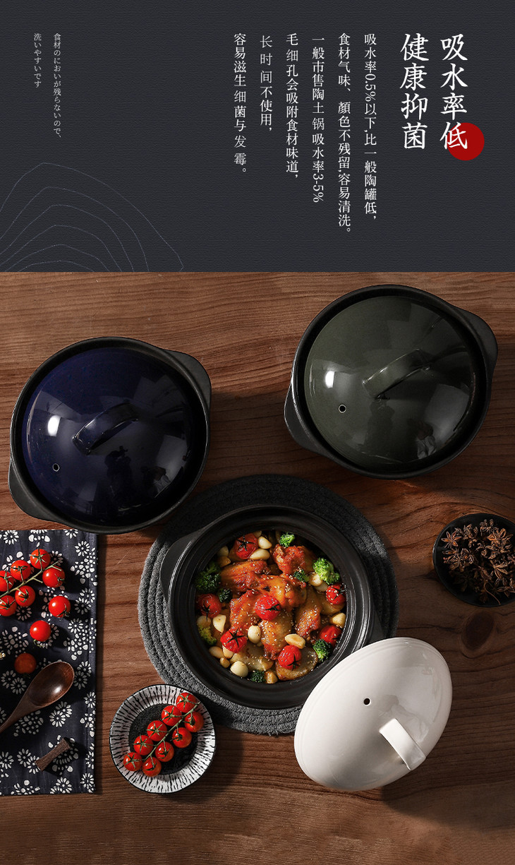 3气味不残留:吸水率0.5%以下,食材气味不残留容易清洗;一般市售陶土锅吸水率3-5%,毛细孔会吸附食材味道,长时间不使用,容易滋生细菌与发霉。