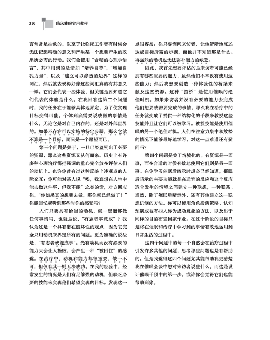 从个人阅读体验的角度,我强烈建议即使不从事催眠工作的临床实践者如有条件也可以读一读这本书,从广义上,催眠不只是一种技术、一种取向,更是一种临床的工作的视角与思路——理解如何培育改变可以发生的信念,如何放大资源,整合新的观点、视角和体验,减轻对痛苦的关注,这或许是每个临床从业者都值得拥有的。
