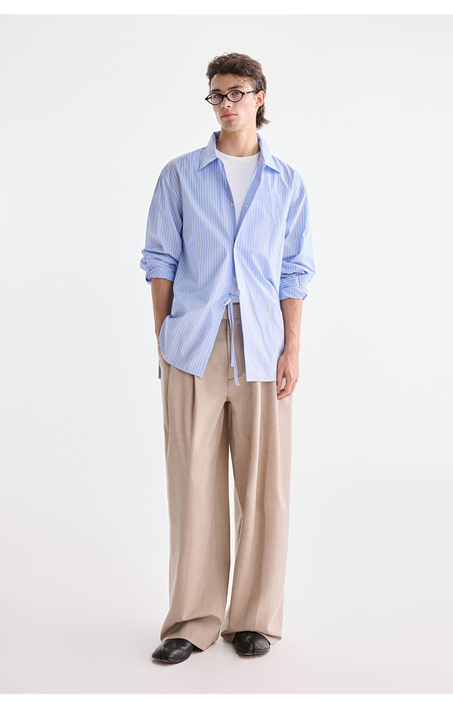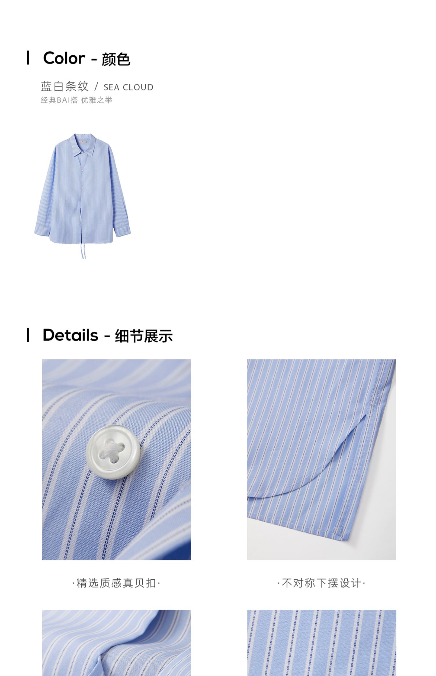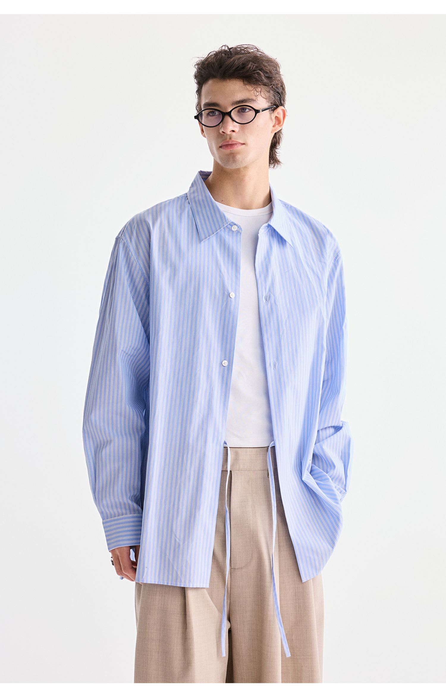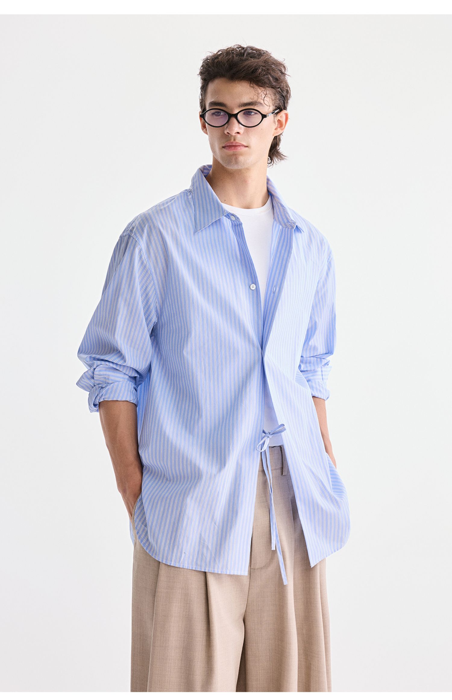 棉仓3621004004-【浪漫雅趣】腰间系带优雅蓝白条纹长袖衬衫