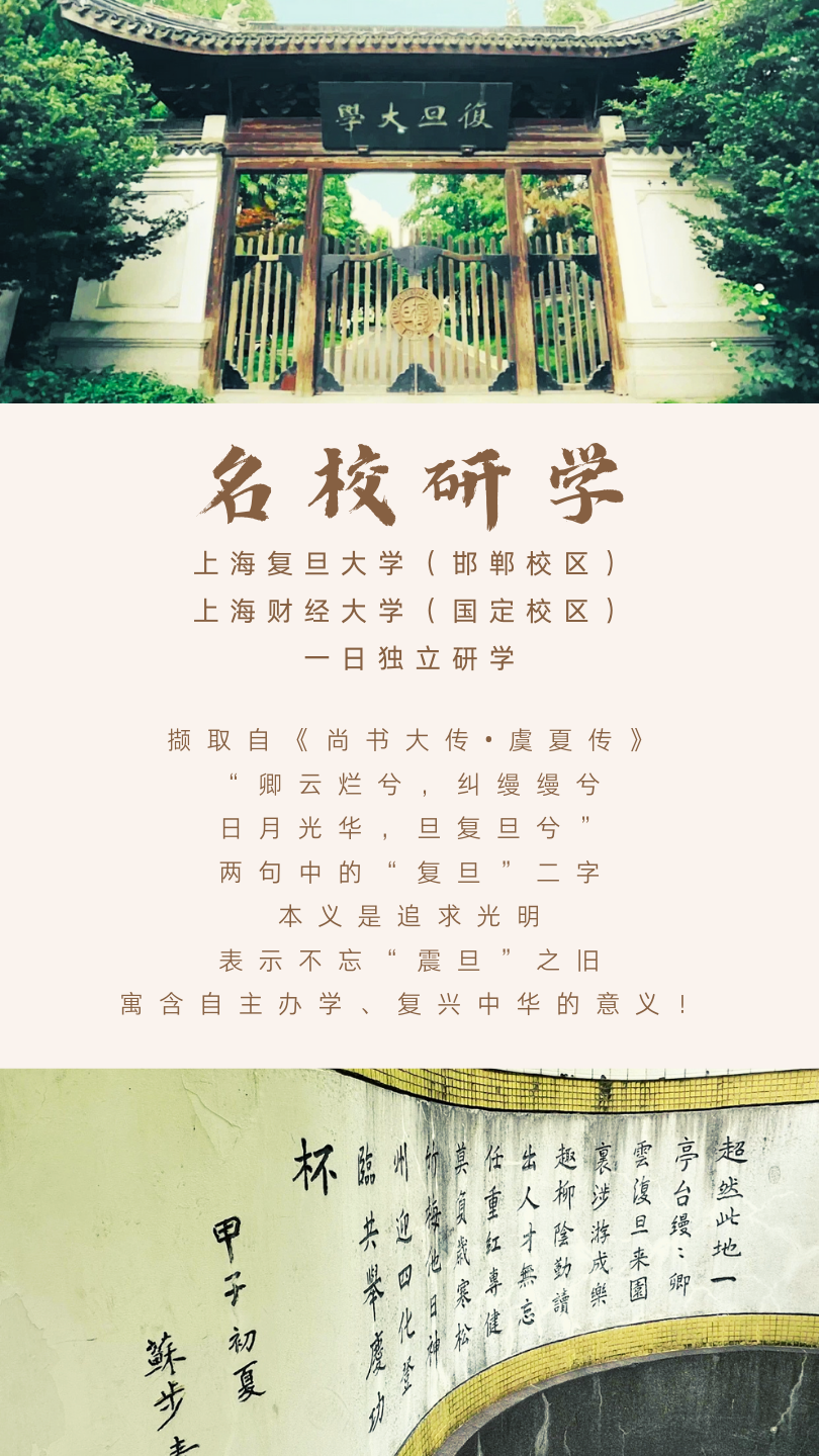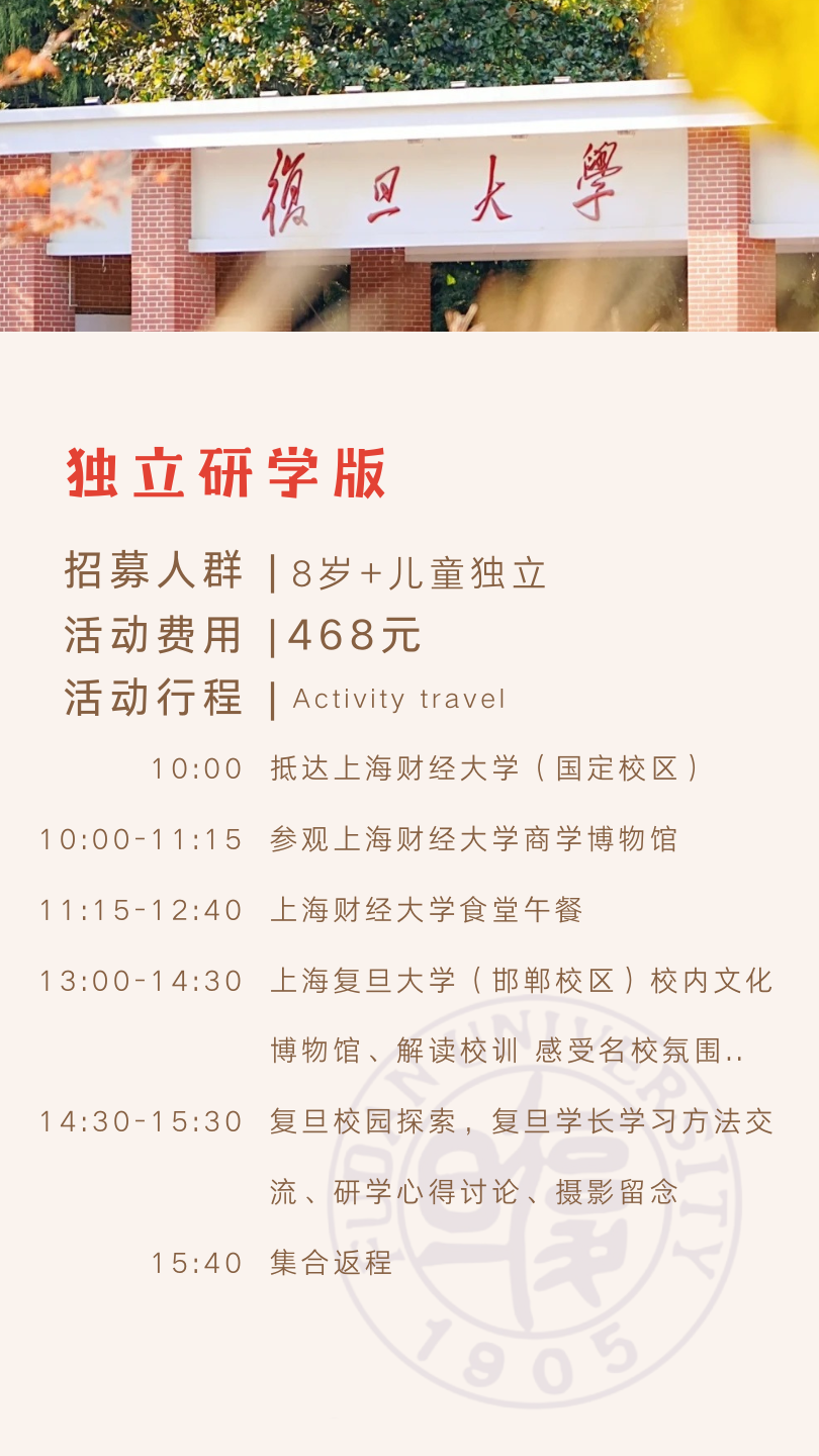 备份双校:孩子志·名校游学 独立营 | 上海复旦大学+上海财经大学 11、12月 名校儿童独立研学营,8岁+,领队1:6全程陪护【会员价】参观校园、文化博物馆,学长交流..
