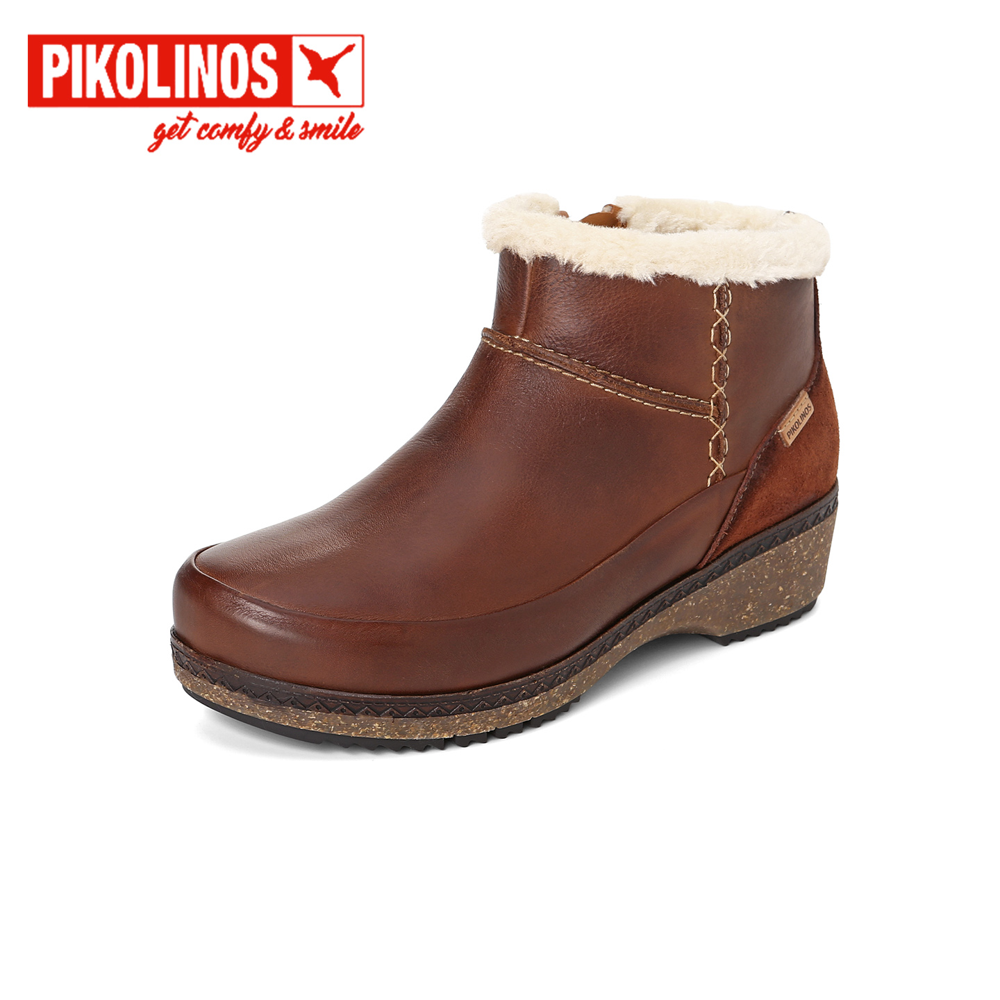【云粉节】BF楼Pikolinos派高雁冬季牛皮圆头平跟侧拉链纯色短毛靴PA250110.吊牌价2780