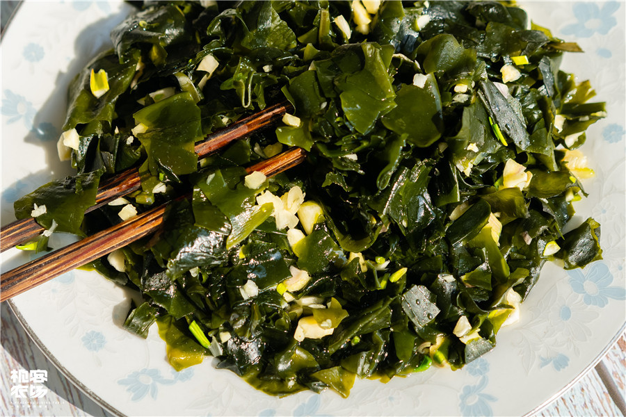 2.然后将裙带菜捞出,将水沥干点,准备几个蒜瓣切成蒜末加入到裙带菜中。