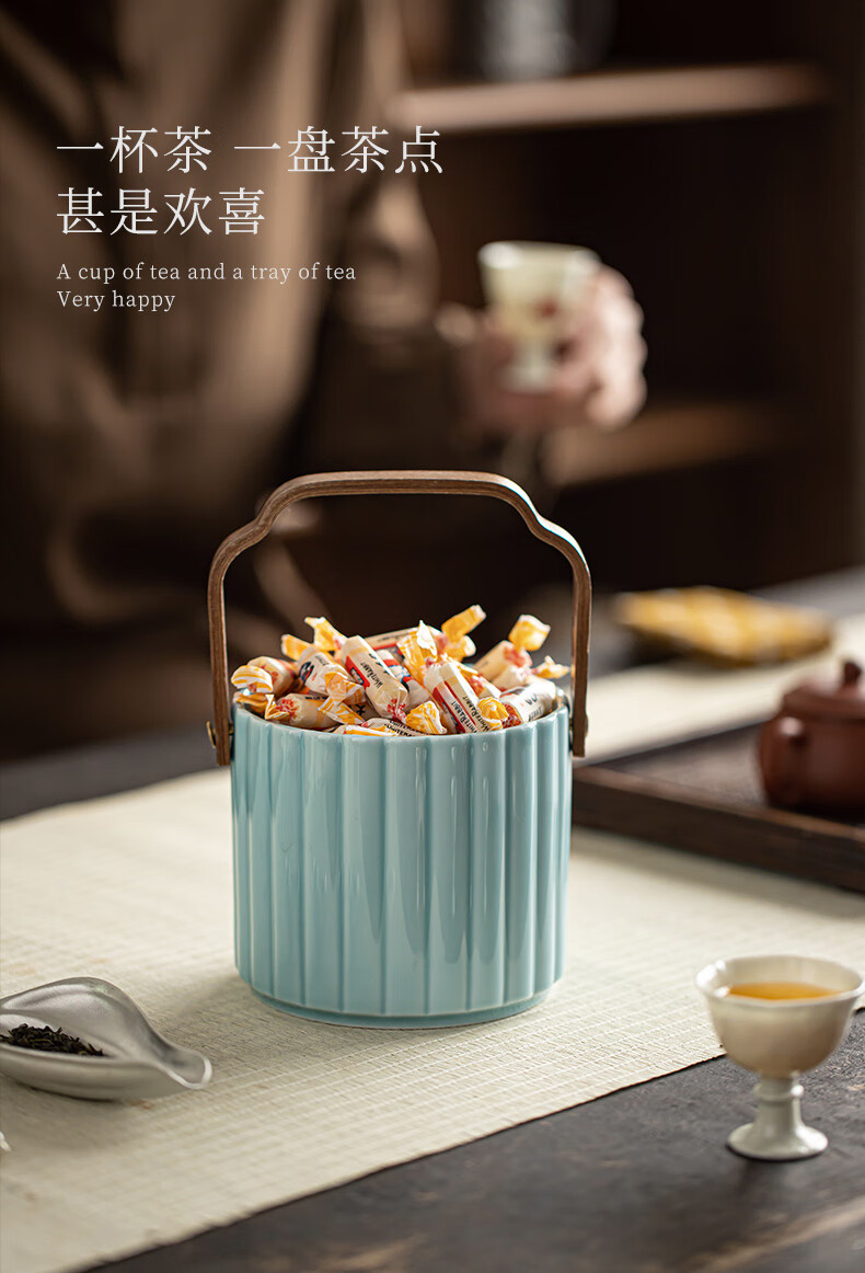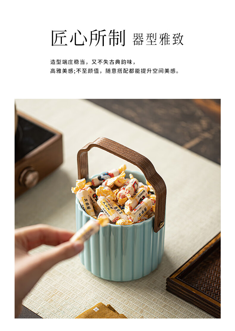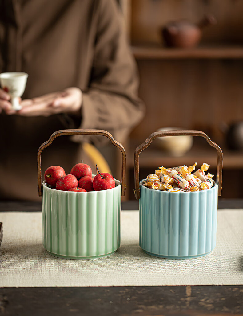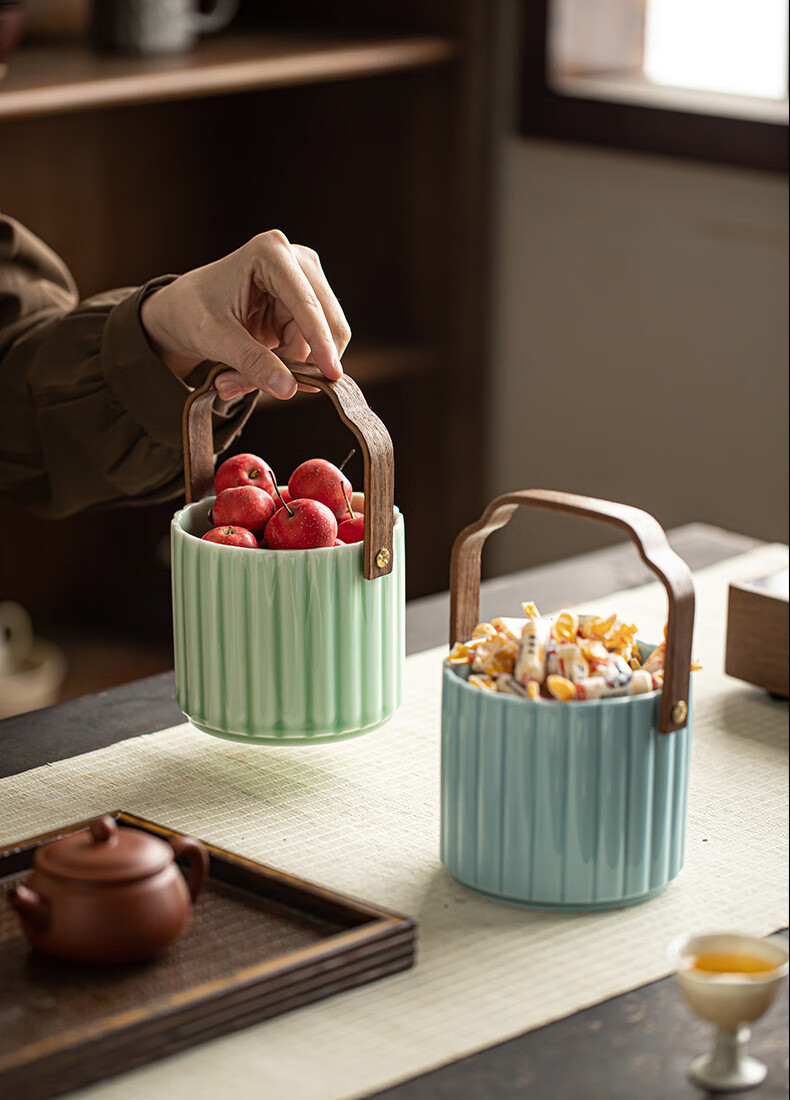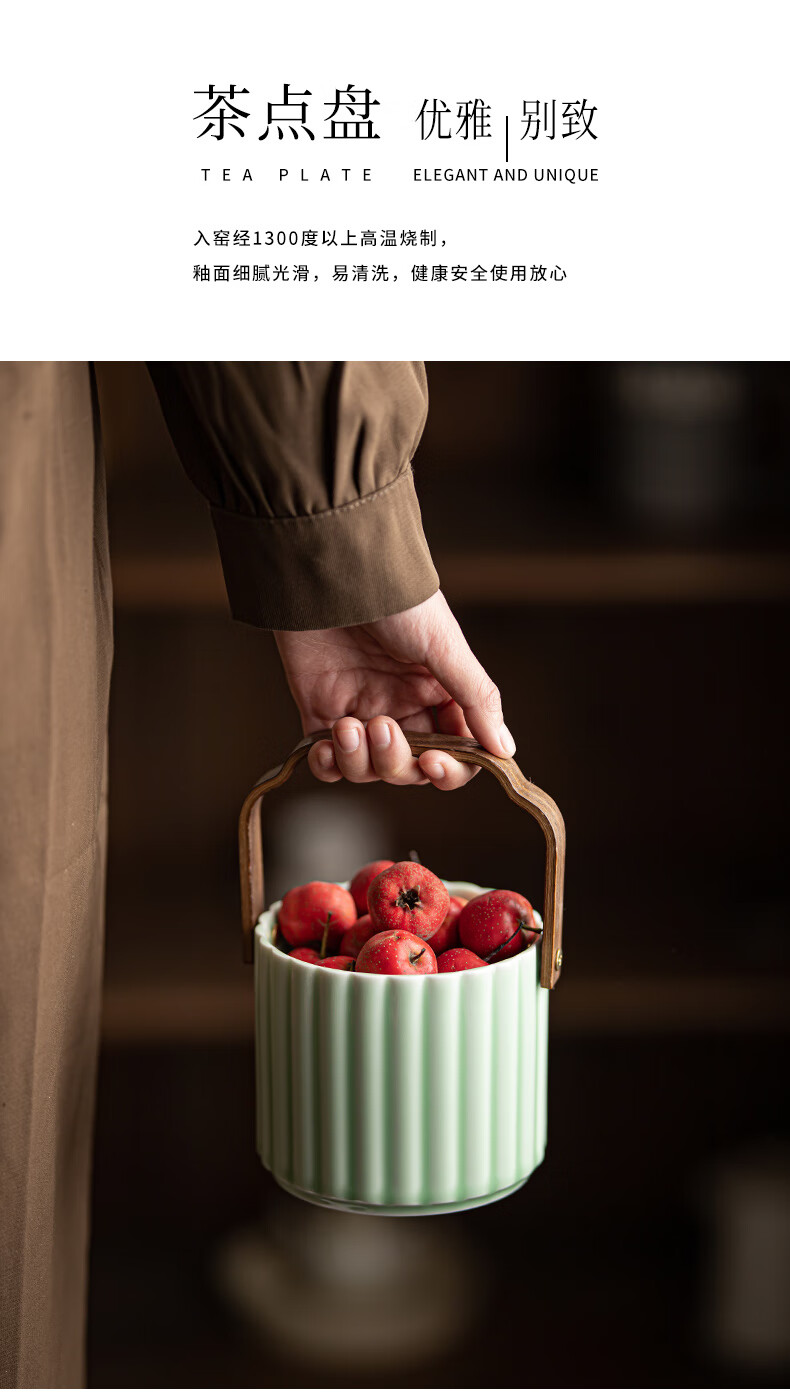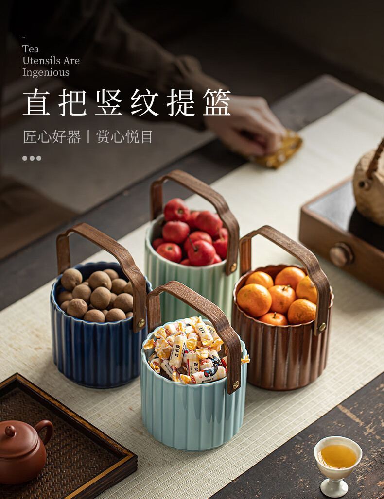 【直把竖纹提篮】陶瓷复古手提果盘家用零食糖果盒精致高端轻奢坚果水果篮点心盘子