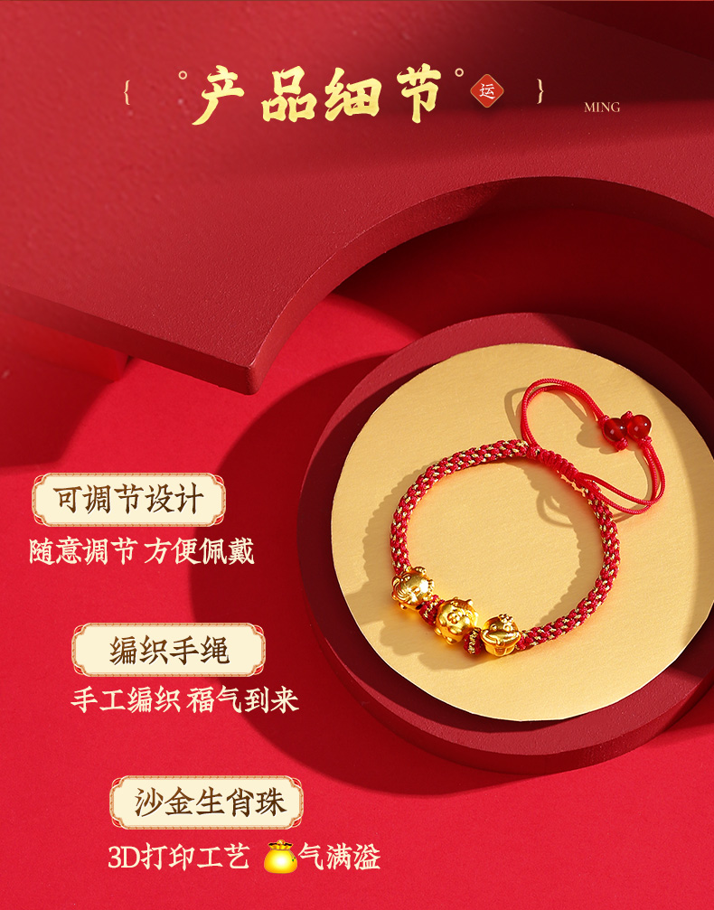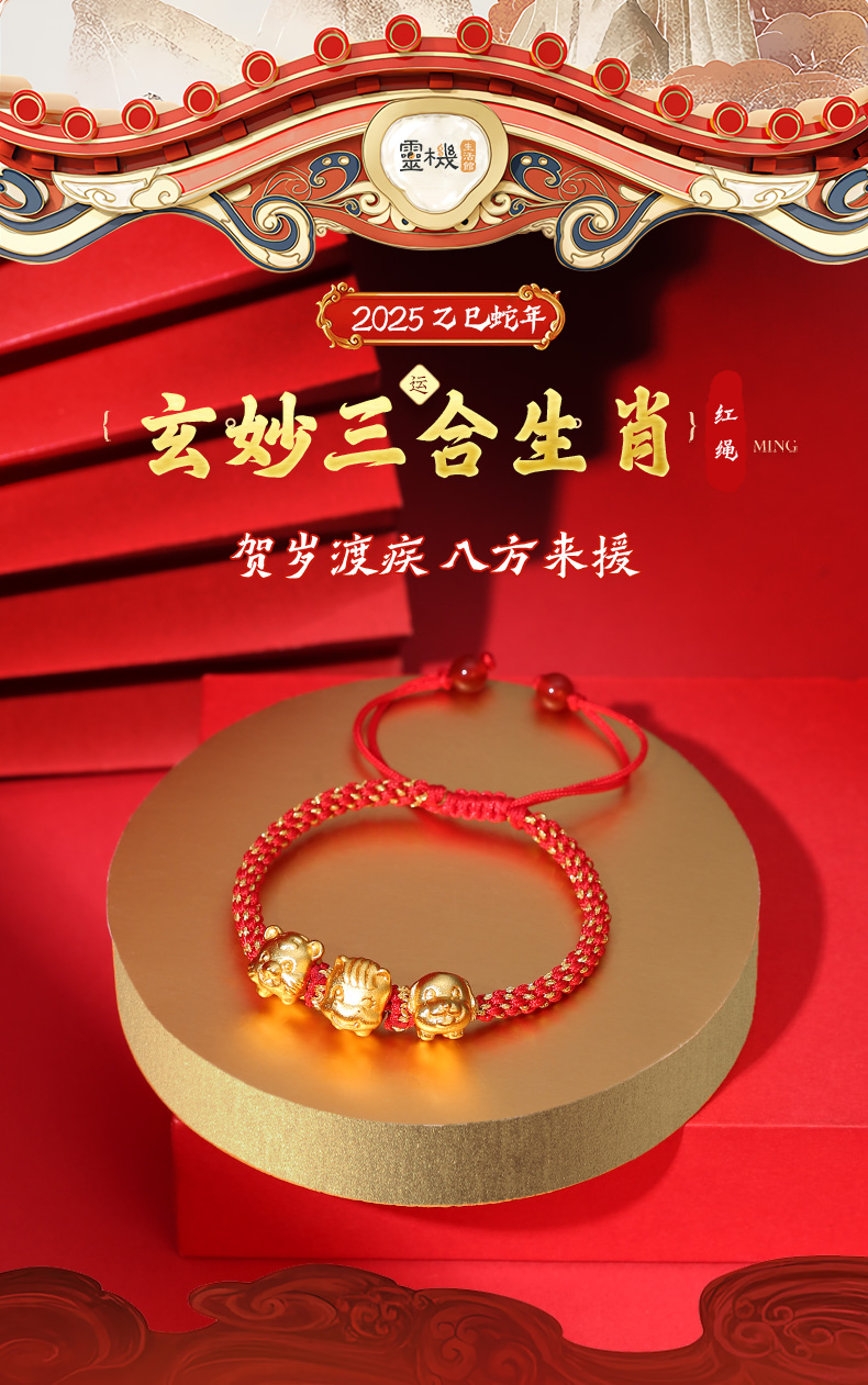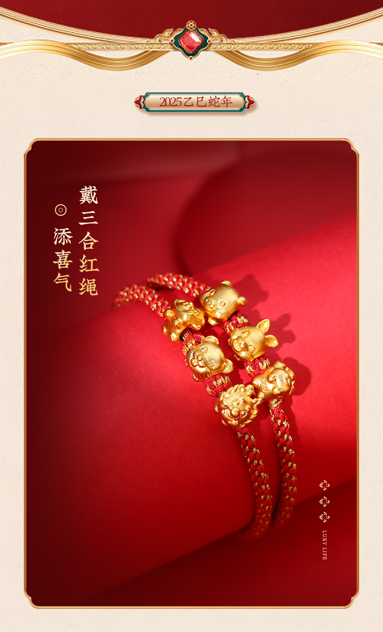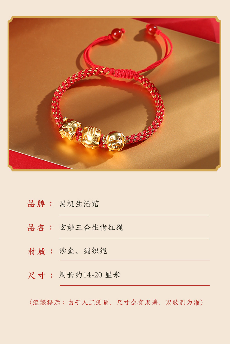 灵机吉品 2025乙巳蛇年玄妙三合红绳沙金手链 十二生肖蛇猪虎猴
