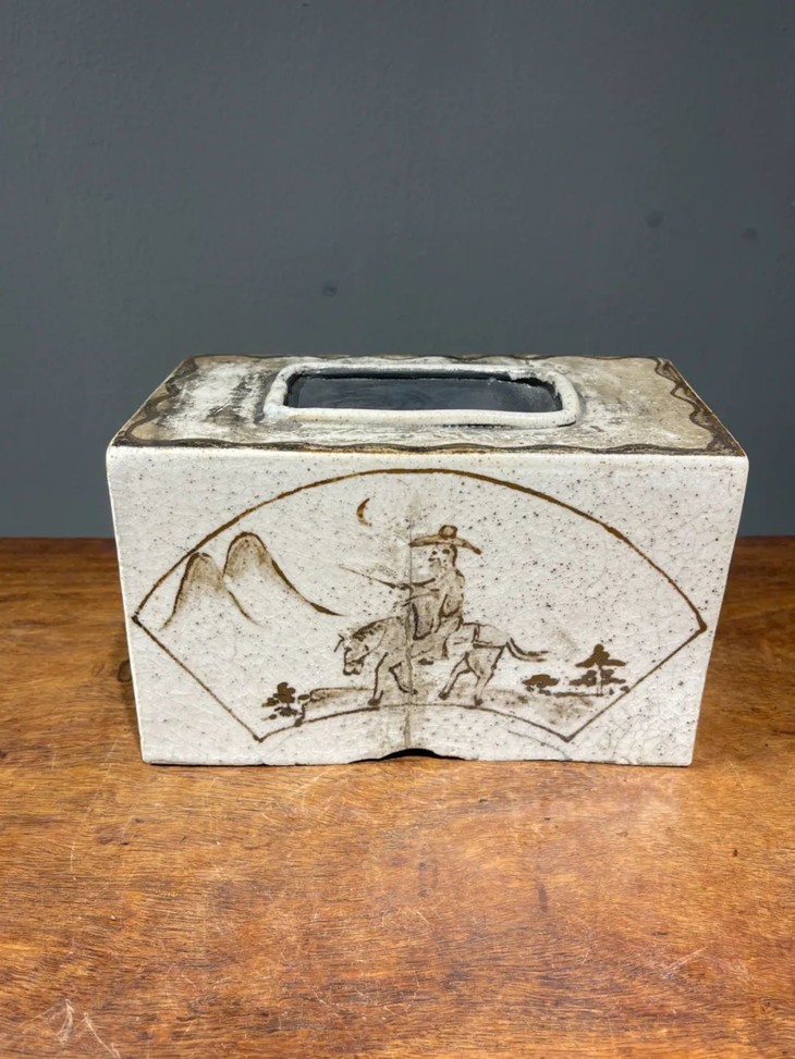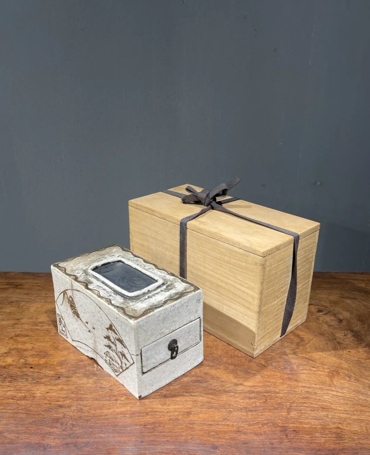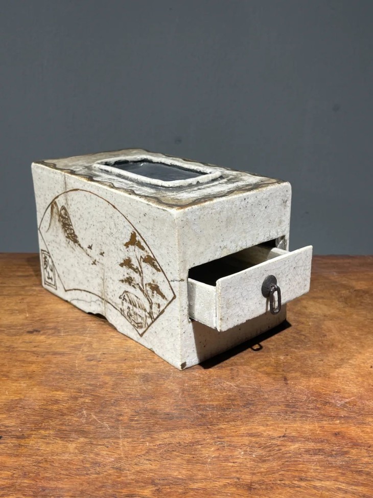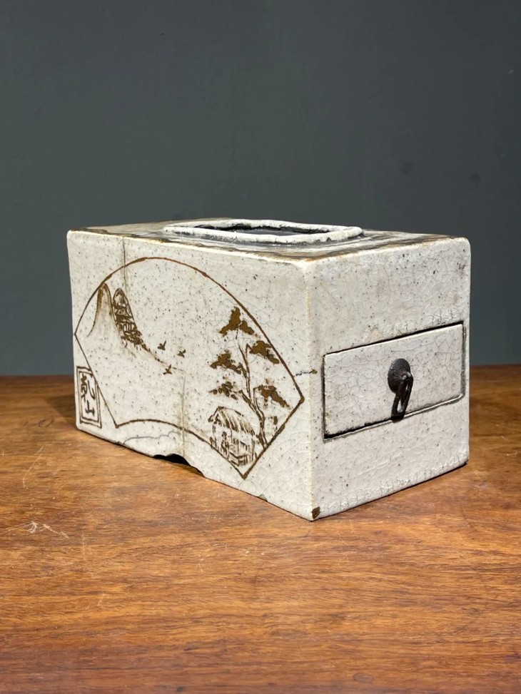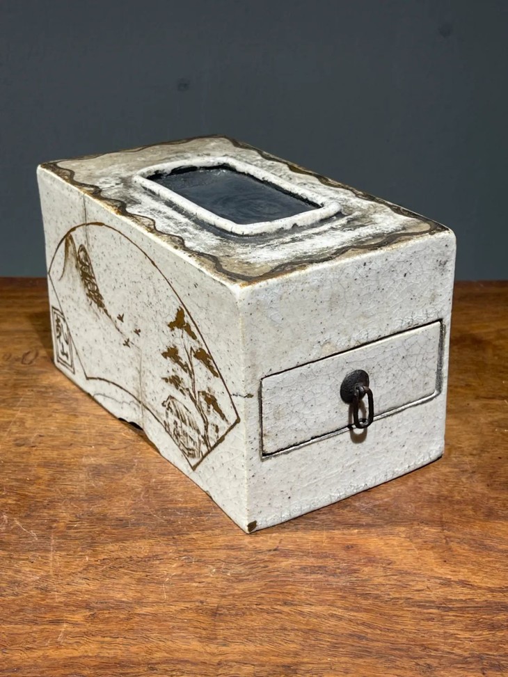 此日本白瓷褐绘山水高仕名家款硯台箱,尺寸大,造型典雅高贵,绘画颇具名家雅趣,传承大师风范,仍然保存于前藏家量身定制的收藏木箱中,是一经历代藏家珍藏多年的经典日本陶瓷名品。
