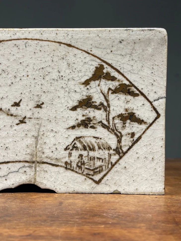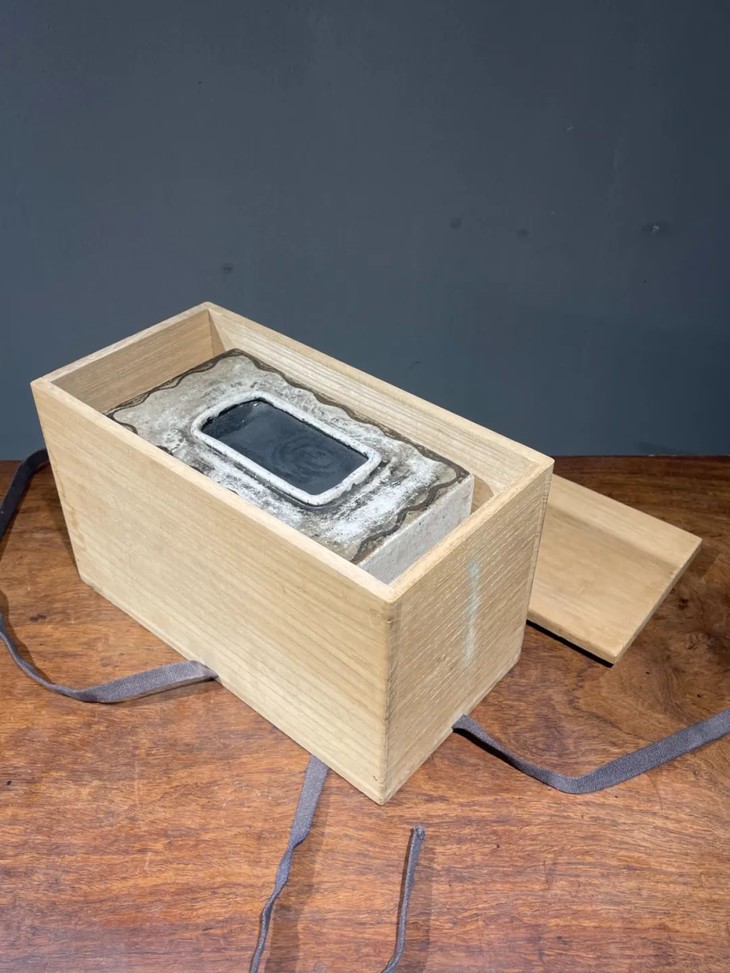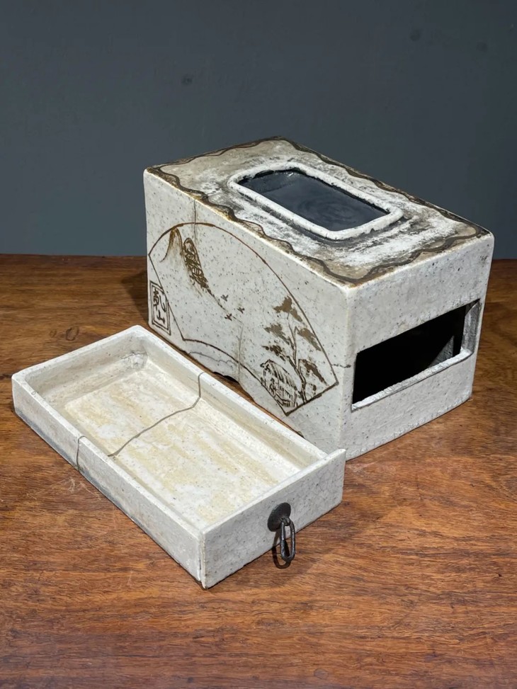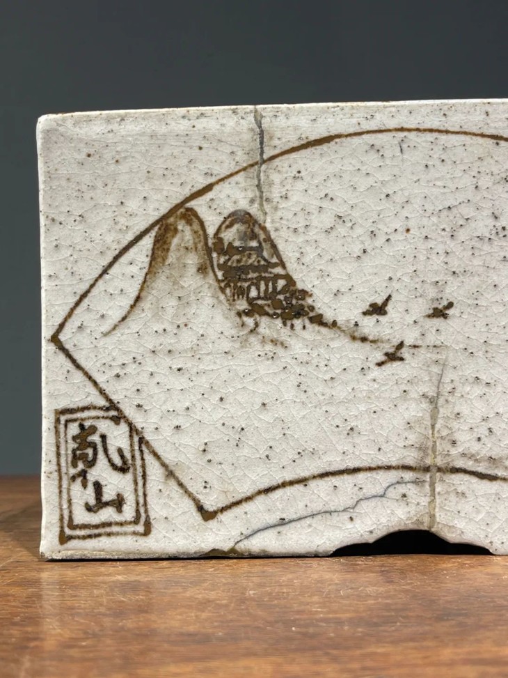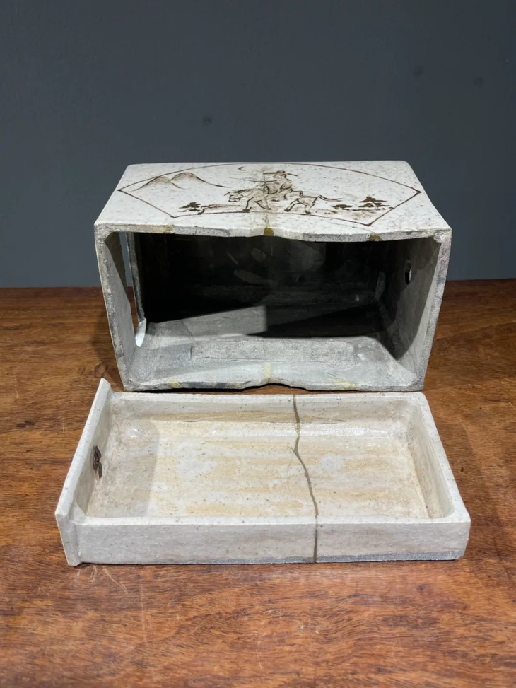 此日本白瓷褐绘山水高仕名家款硯台箱,尺寸大,造型典雅高贵,绘画颇具名家雅趣,传承大师风范,仍然保存于前藏家量身定制的收藏木箱中,是一经历代藏家珍藏多年的经典日本陶瓷名品。