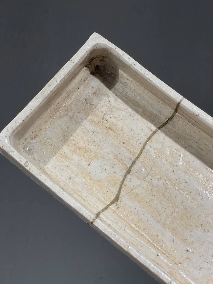 此白瓷褐绘山水高仕名家款硯台箱,如图所示,瓷箱外壁的几处裂痕,以及抽屉断裂处以传统金缮工艺修复,除此以外保存完好,保留于前藏家量身定制的收藏木箱中,整体典雅贵气。