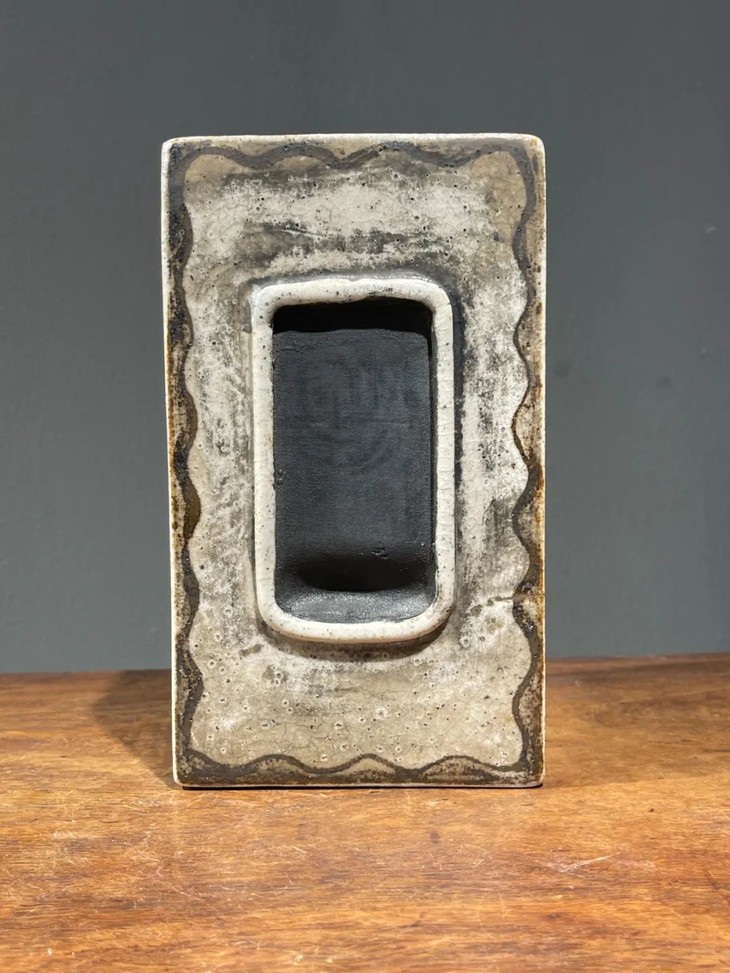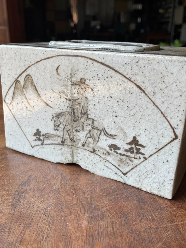 这是一件日本重要著名陶瓷绘画艺术家“尾形乾山”款的白瓷褐绘山水高仕名家款硯台箱,长方箱造型典雅,上方是硯台,左右兩侧褐绘山水画与高仕骑驴图,前侧一可抽拉的抽屉,山水图侧书名款”乾山”,所指的是京都绘瓷名家尾形乾山(1663~1743),乾山是日本江户时期的画家与漆艺大名家尾形光琳之弟,接受京都大陶艺家野野村仁清彩绘陶艺的影响,注重雅趣,形成风格,备受后人模仿。晚年往江户开设陶窑。绘画学其兄光琳,此乾山款彩绘瓶应是明治时代之京烧匠人仿乾山风格的佳作。