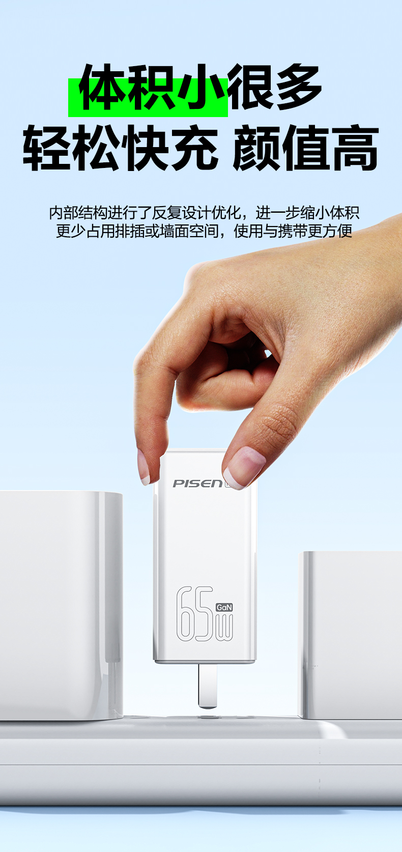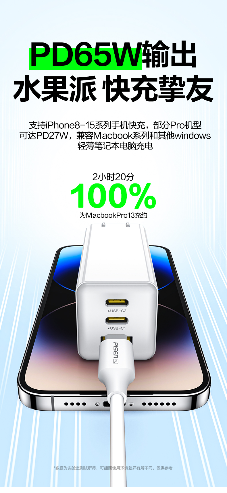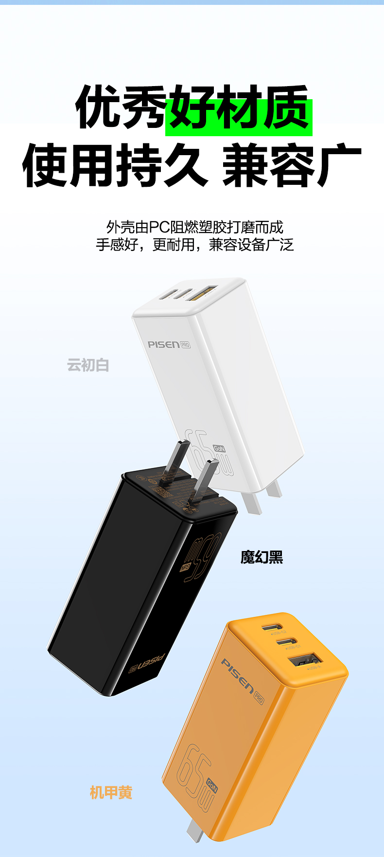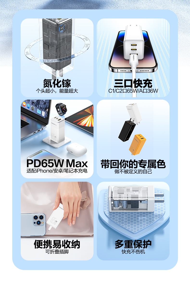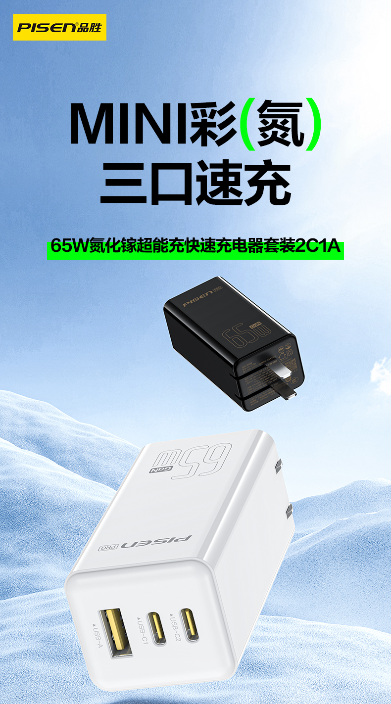 品胜 65W氮化镓超能充快速充电器2C1A 双Type-C口+USB接口 支持苹果PD快充笔记本快充