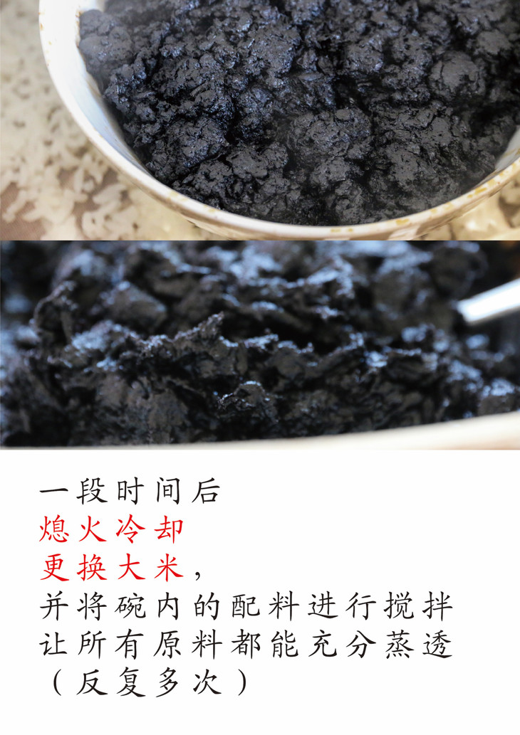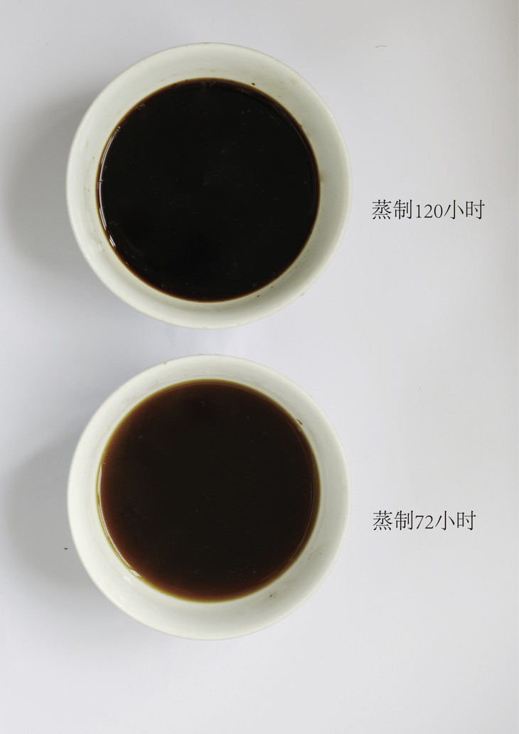 相比市场的同类产品,我们做过蒸72个小时的,膏体也基本转黑了,但是膏会相对湿润一些,吃起来也是淡淡的酸苦味里还保留轻微的桂圆肉的一点甜味,但是目前蒸了120个小时的玉灵膏就不再吃得出来桂圆肉的甜味,已经完全转化成淡淡的酸苦回甘的味道。整个膏体黑亮如碳,泡水会浮现一层膏脂。