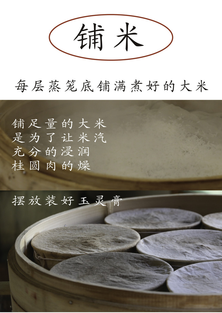 蒸玉灵膏的大米我们是定的云南返乡青年生态种植的老品种稻谷来家里自己碾米,蒸玉灵膏时是把煮过的大米铺满每一层蒸笼底,这样剁细的桂圆肉就能跟碗底的大米在蒸制的过程里随着蒸汽相互更充分的融合、润燥,中途还要换3次大米,这样出来的膏体就不容易上火。