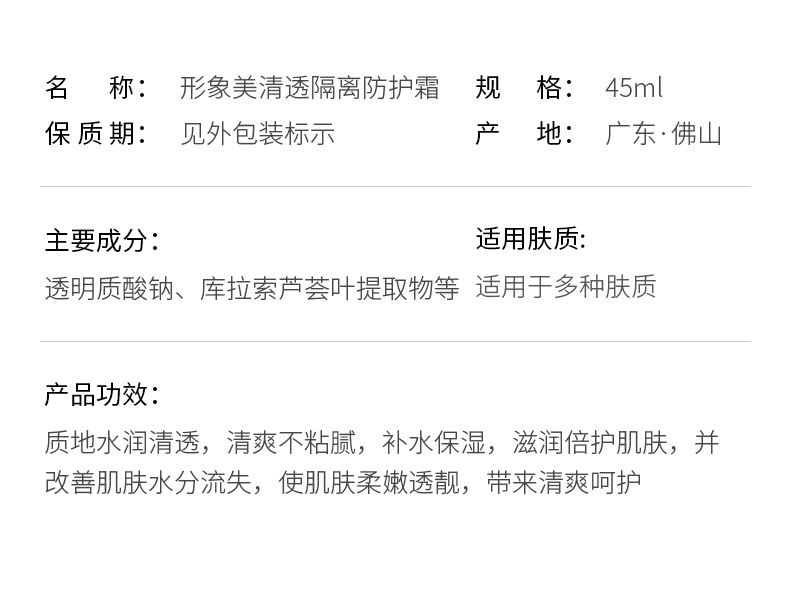 【美妆个护 国庆优惠 买3送2】形象美清透隔离防护霜 清爽轻薄滋润补水保湿柔亮透嫩面部护肤品