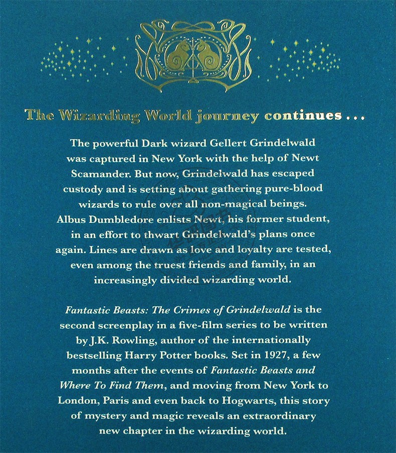 Fantastic Beasts: The Crimes of Grindelwald is the second screenplay in a five-film series to be written by J.K. Rowling, author of the internationally bestselling Harry Potter books. Set in 1927, a few months after the events of Fantastic Beasts and Where To Find Them, and moving from New York to London, Paris and even back to Hogwarts, this story of mystery and magic reveals an extraordinary new chapter in the wizarding world. Illustrated with stunning line art from MinaLima with some surprising nods to the Harry Potter stories that will delight fans of both the books and films.