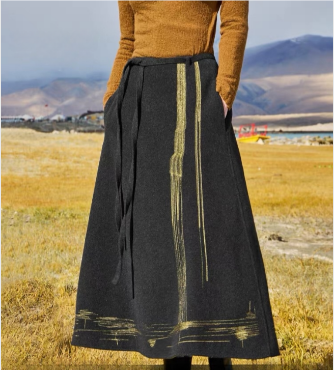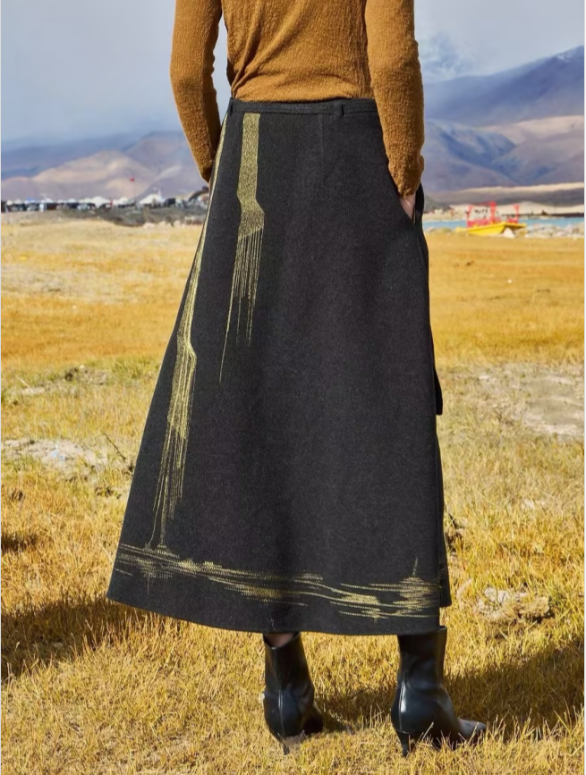 伯妮斯茵 | 新中式国风 金线水墨刺绣半身裙 系带大摆毛呢长裙 秋冬气质禅意裙 HJ3B62