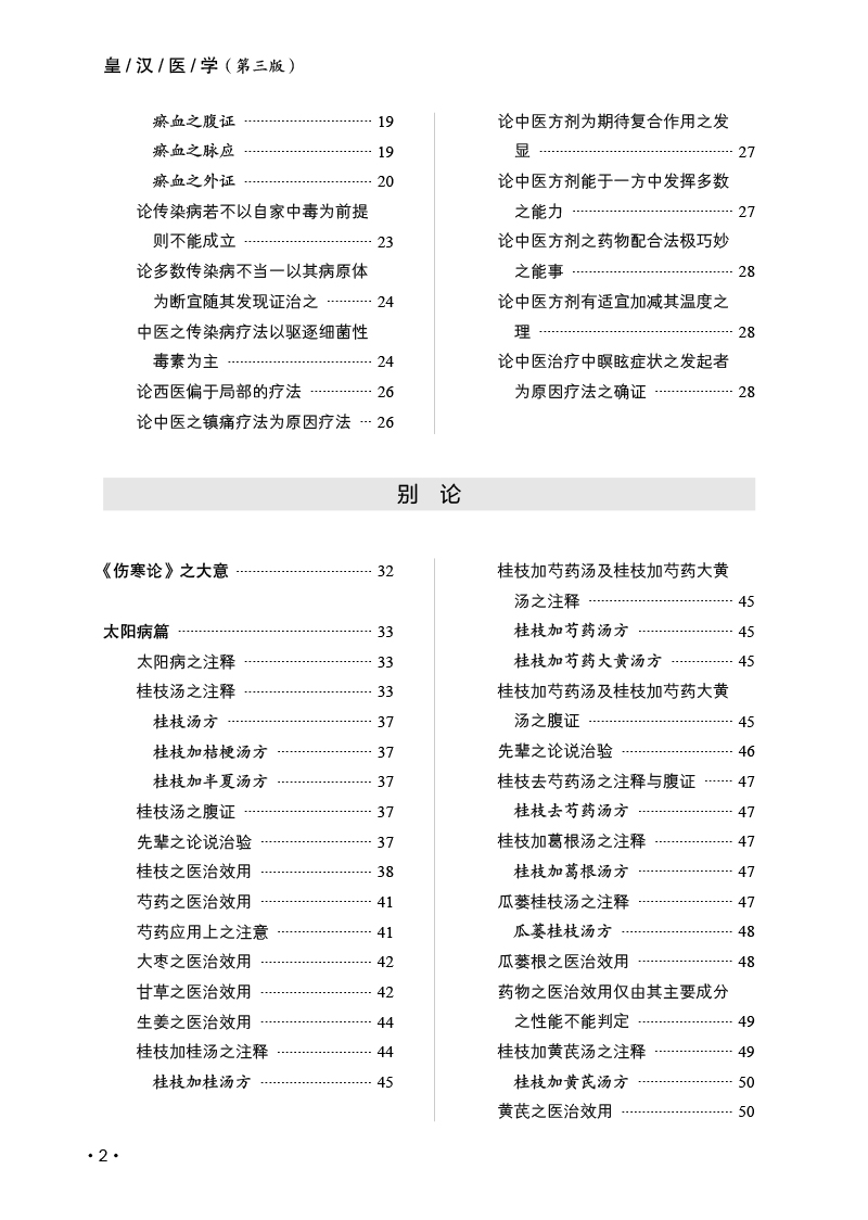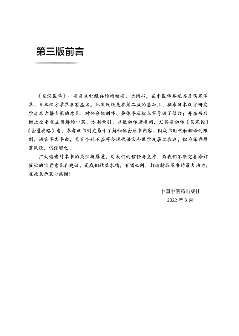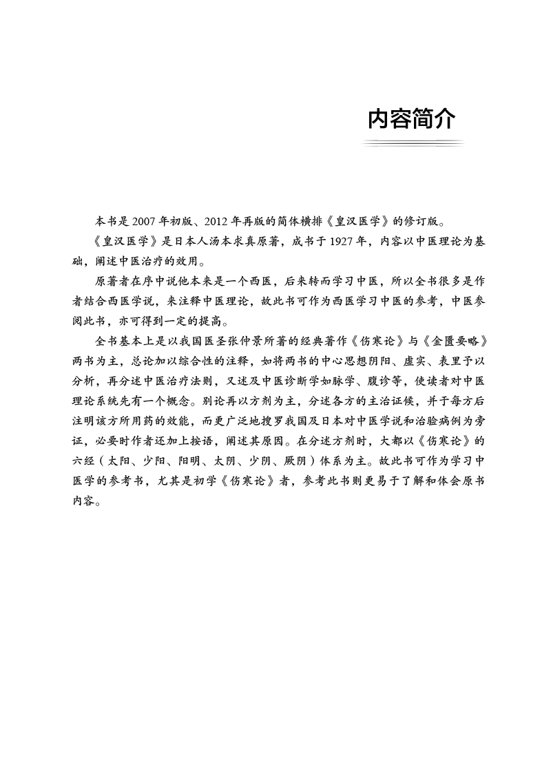 《皇汉医学》基本上是以我国医圣张仲景所著的经典著作《伤寒论》与《金匮要略》两书为主,首先加以综合性的注释,如将两书的中心思想阴阳、虚实、表里予以分析,再分述中医治疗法则,又述及中医诊断学如脉学、腹诊等,使读者对中医理论系统先有一个概念。后部再以方剂为主,分述各方的主治证候,并于每方后注明该方所用药的效能,而更广泛地搜罗我国及日本对中医学说和治验病例为旁证,必要时作者还加上按语,阐述其原因。在分述方剂时,大都以《伤寒论》的六经(太阳、少阳、阳明、太阴、少阴、厥阴) 体系为主。故此书可为学习中医学的参考书,尤其是初学《伤寒论》者,参考此书则更易于了解和体会原书内容。