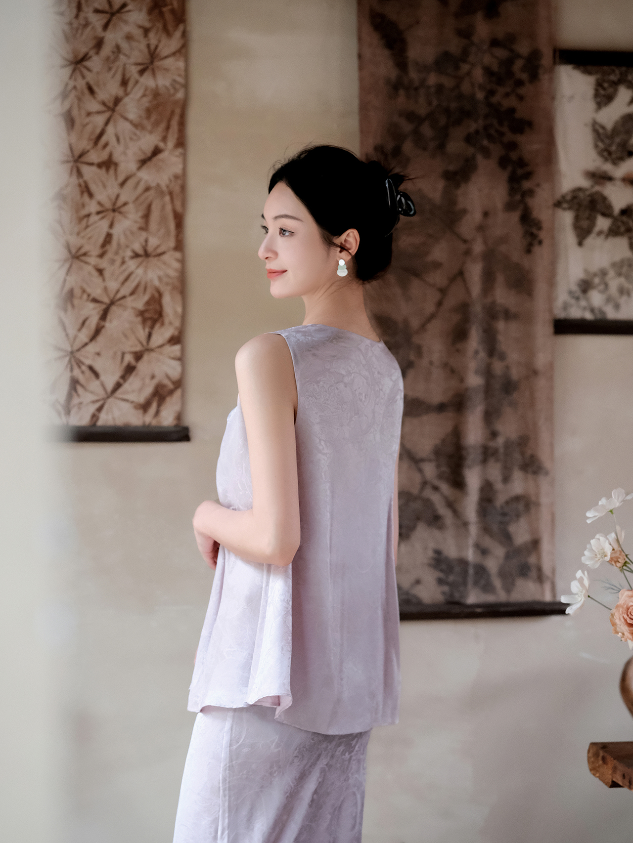 盛唐牡丹 | 粉色蝶恋花/紫色喜鹊缠枝真丝提花褶皱上衣