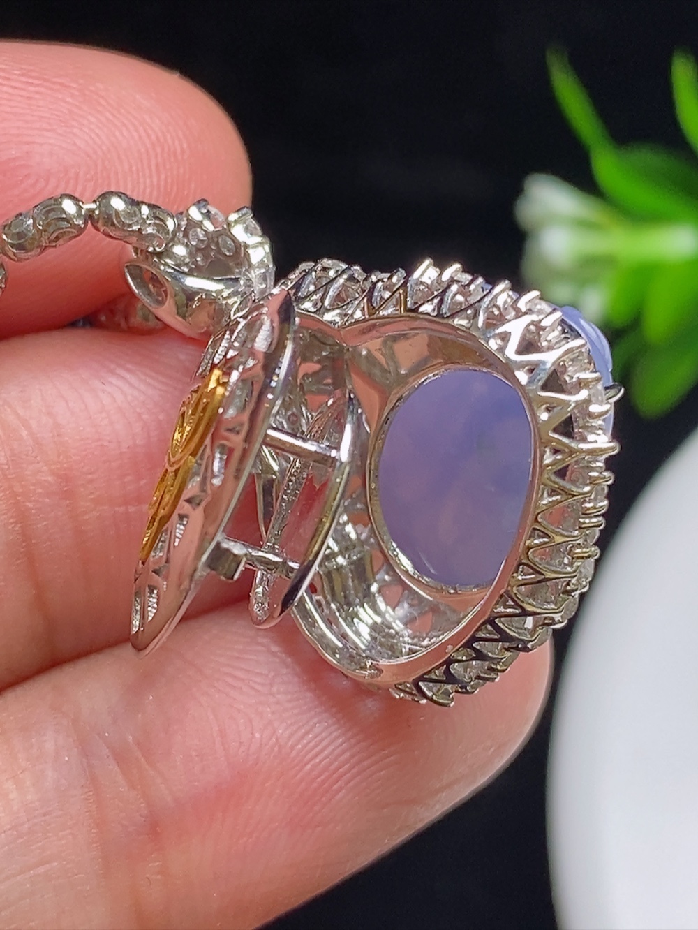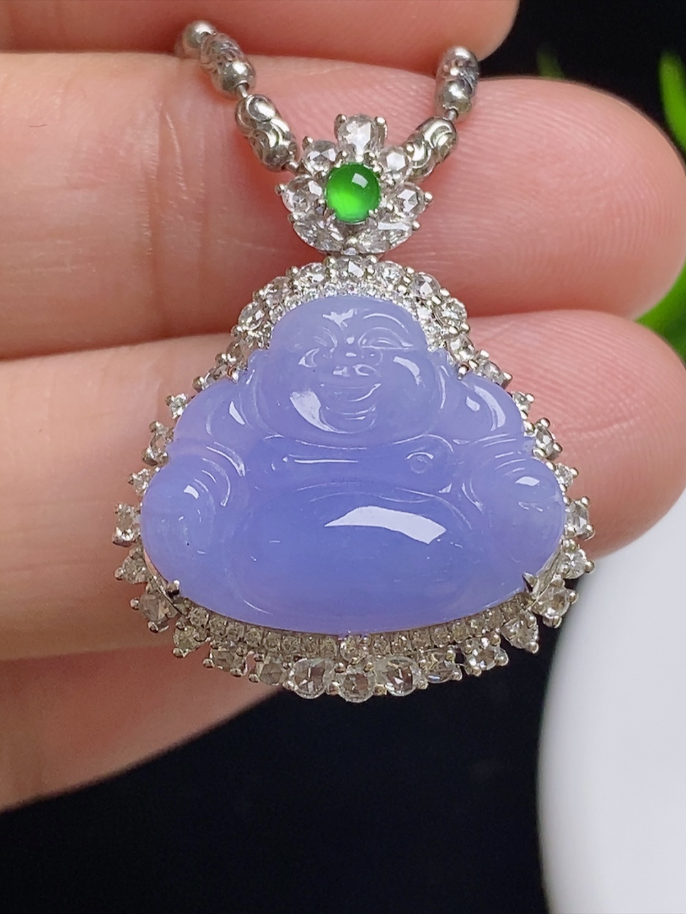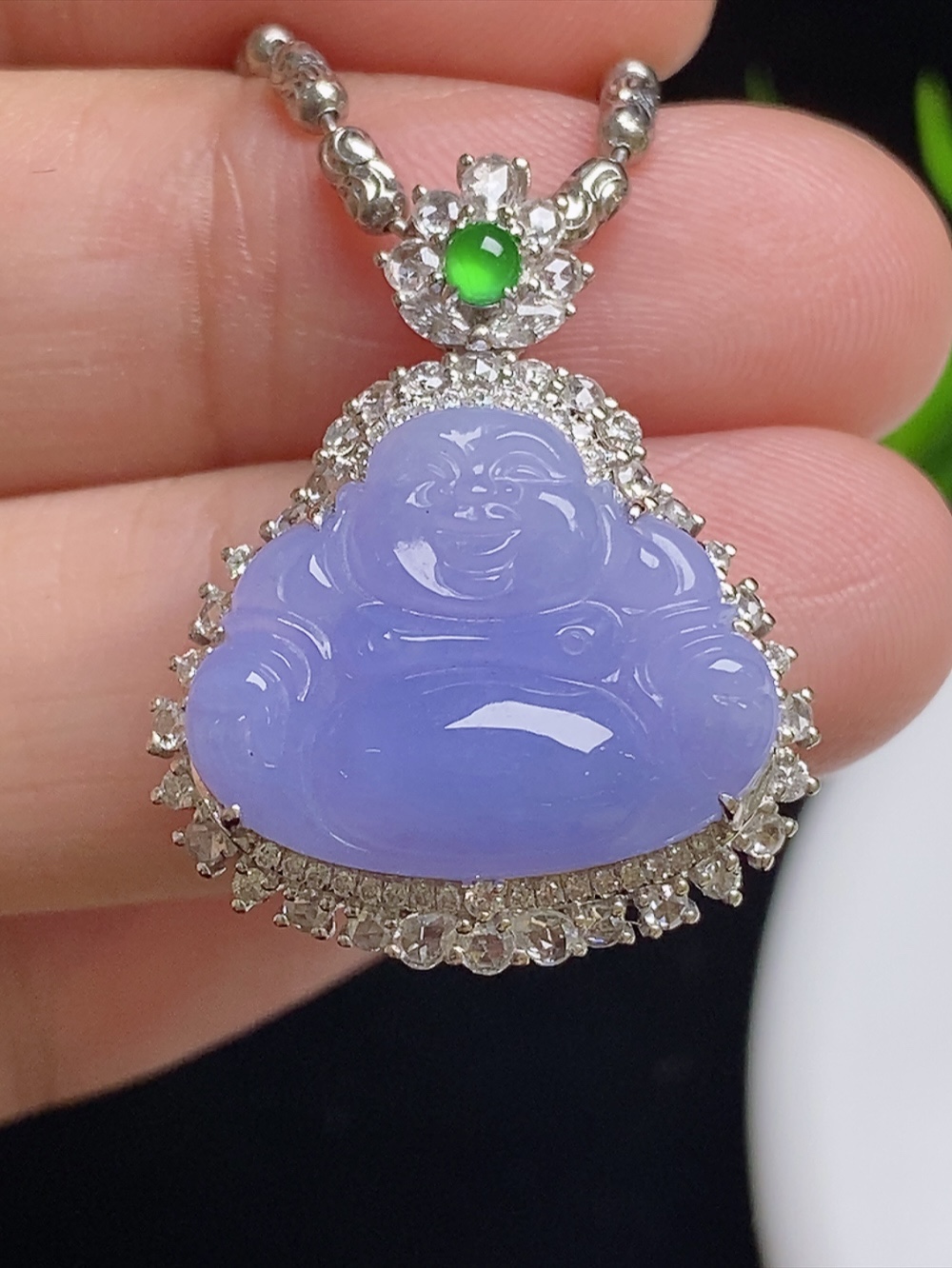 547112 高冰紫罗兰佛公 饱满,通透水润,玉质细腻,翠色鲜艳,18k金奢华钻石镶嵌 裸石尺寸:17.7-14.1-3.7mm约 超值价:32880