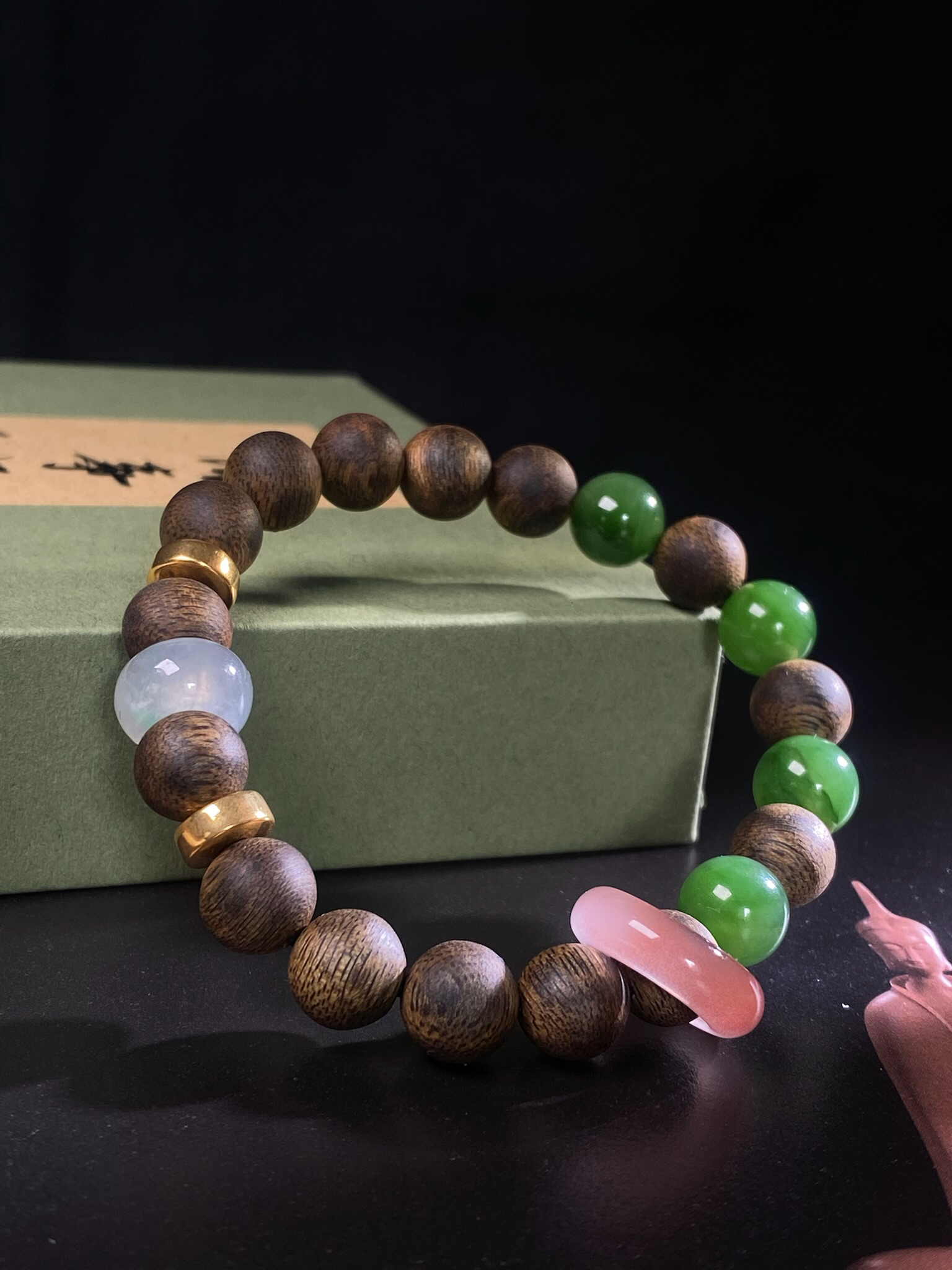 沉香DIY圆珠手串碧玉南红跑环,天然沉香圆珠约10mm,2颗18K金隔片,4颗菠菜绿碧玉圆珠,1颗冰种翡翠算盘珠,还有一个冰飘南红跑环,款式古朴又时尚又个性
