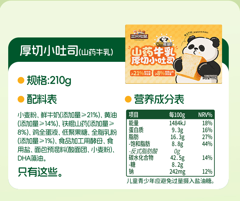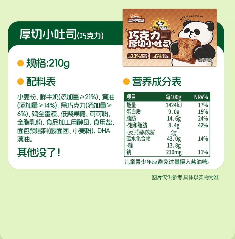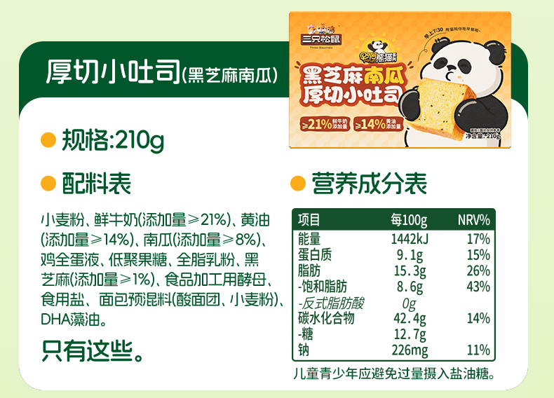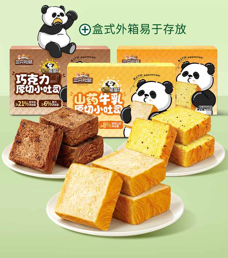 三只松鼠 三只松鼠 早啊熊猫-三款厚切小吐司300g 黄油添加≥14% 短保21天-fx