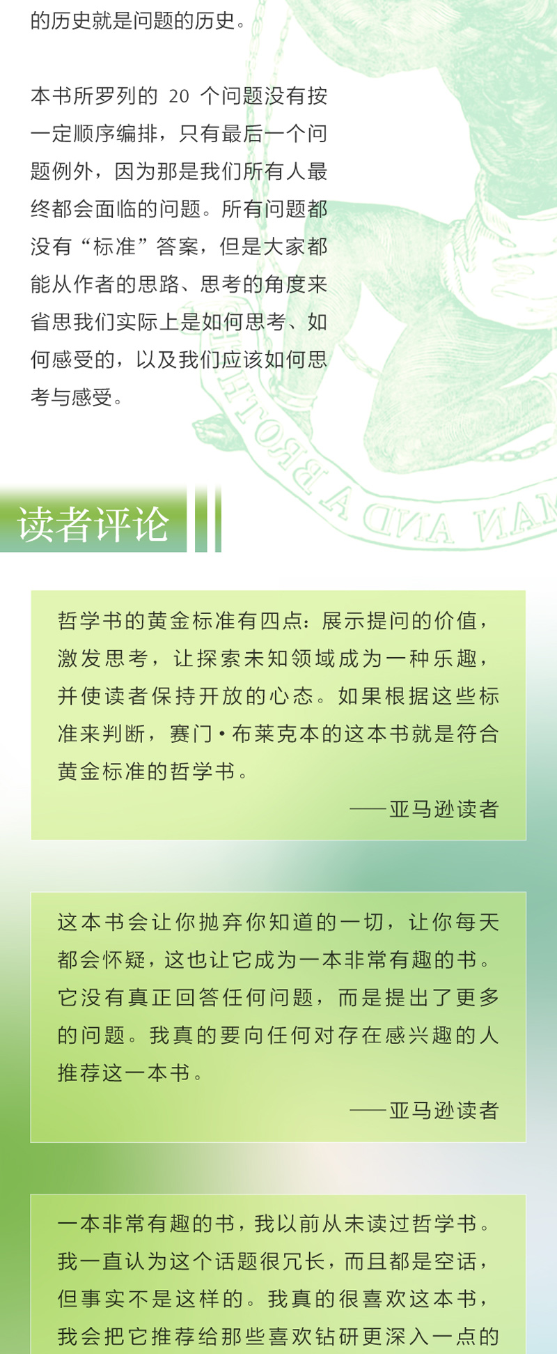 书中所罗列的20个问题没有按一定顺序编排,只有后一个问题例外,因为那是我们所有人终都会面临的问题。每个问题的相关讨论都是各自独立的,所以读者可以挑自己感兴趣的主题来看。所有问题都没有;标准答案,但是大家都能从作者的思路、思考的角度来省思我们实际上是如何思考、如何感受的,以及我们应该如何思考与感受。