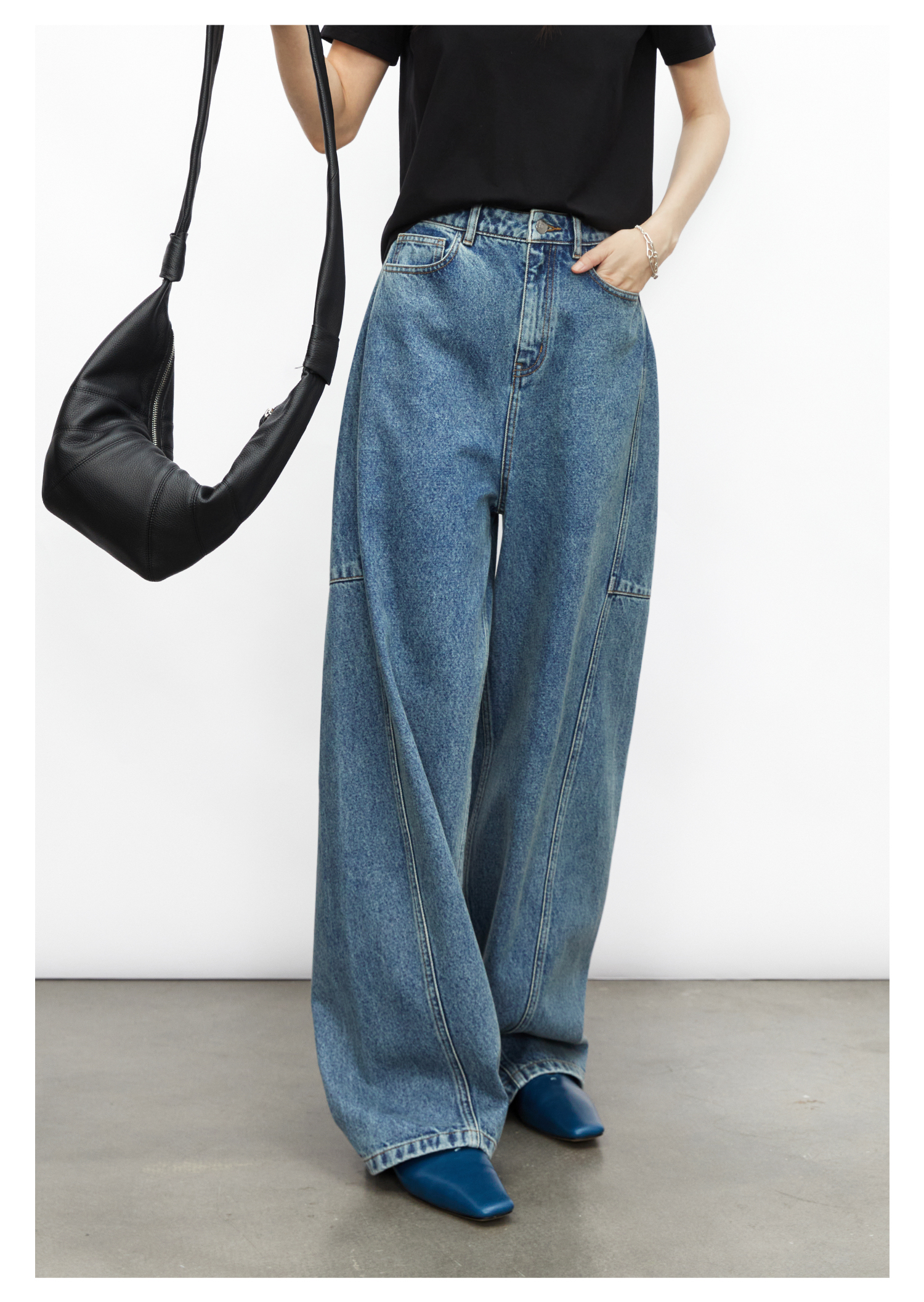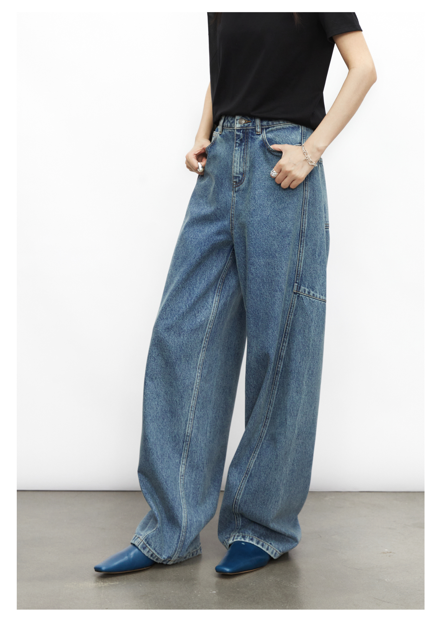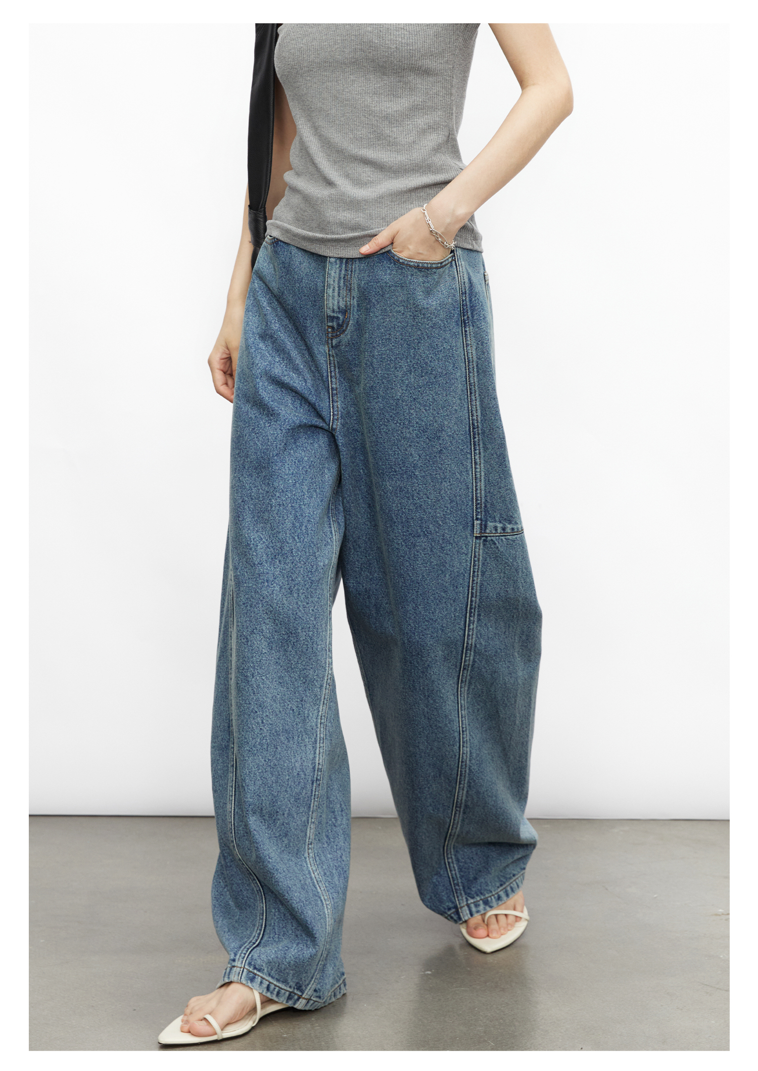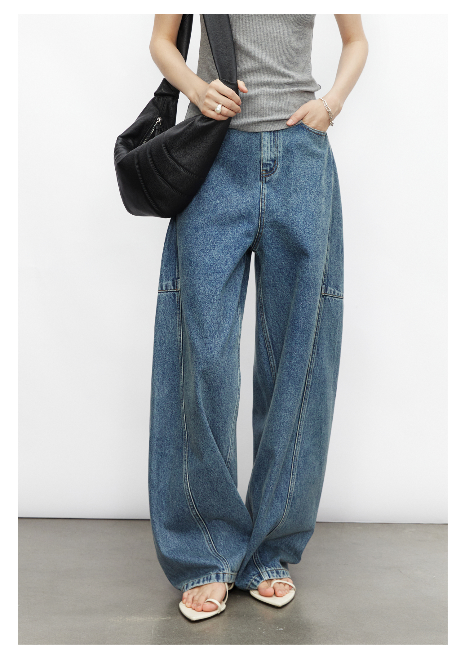 棉仓3531519007-秋季分割切线重设计感气球裤牛仔裤 显瘦宽松阔腿裤女(