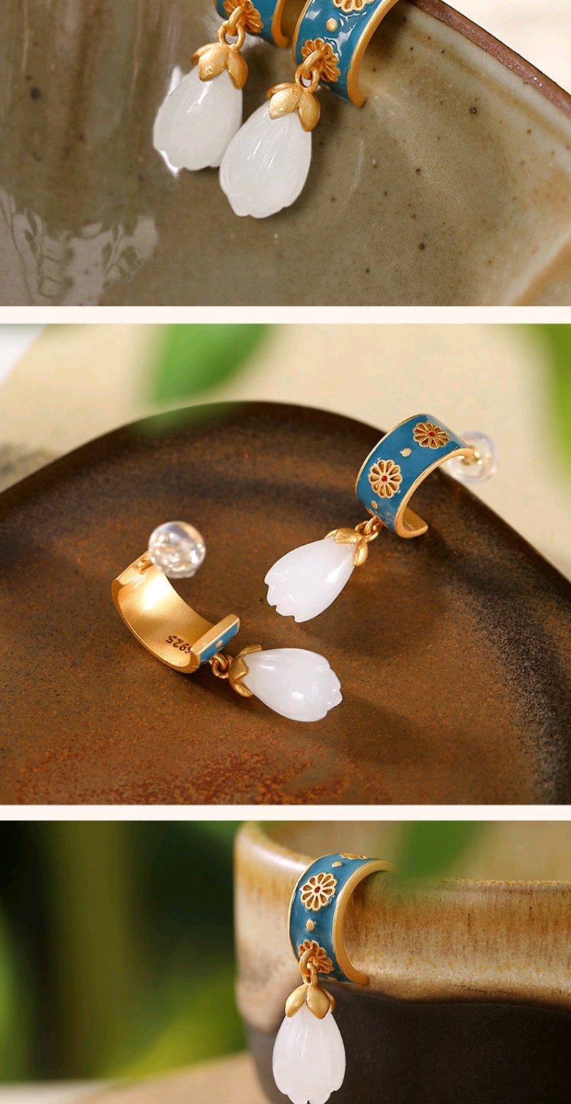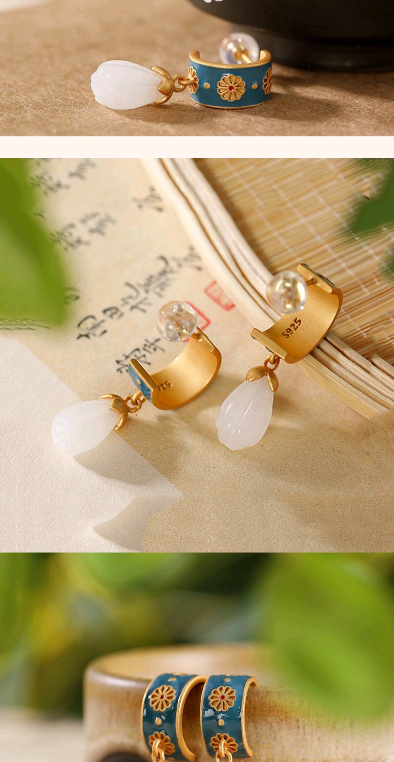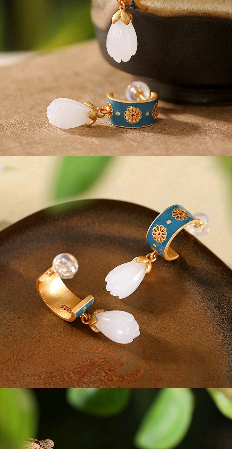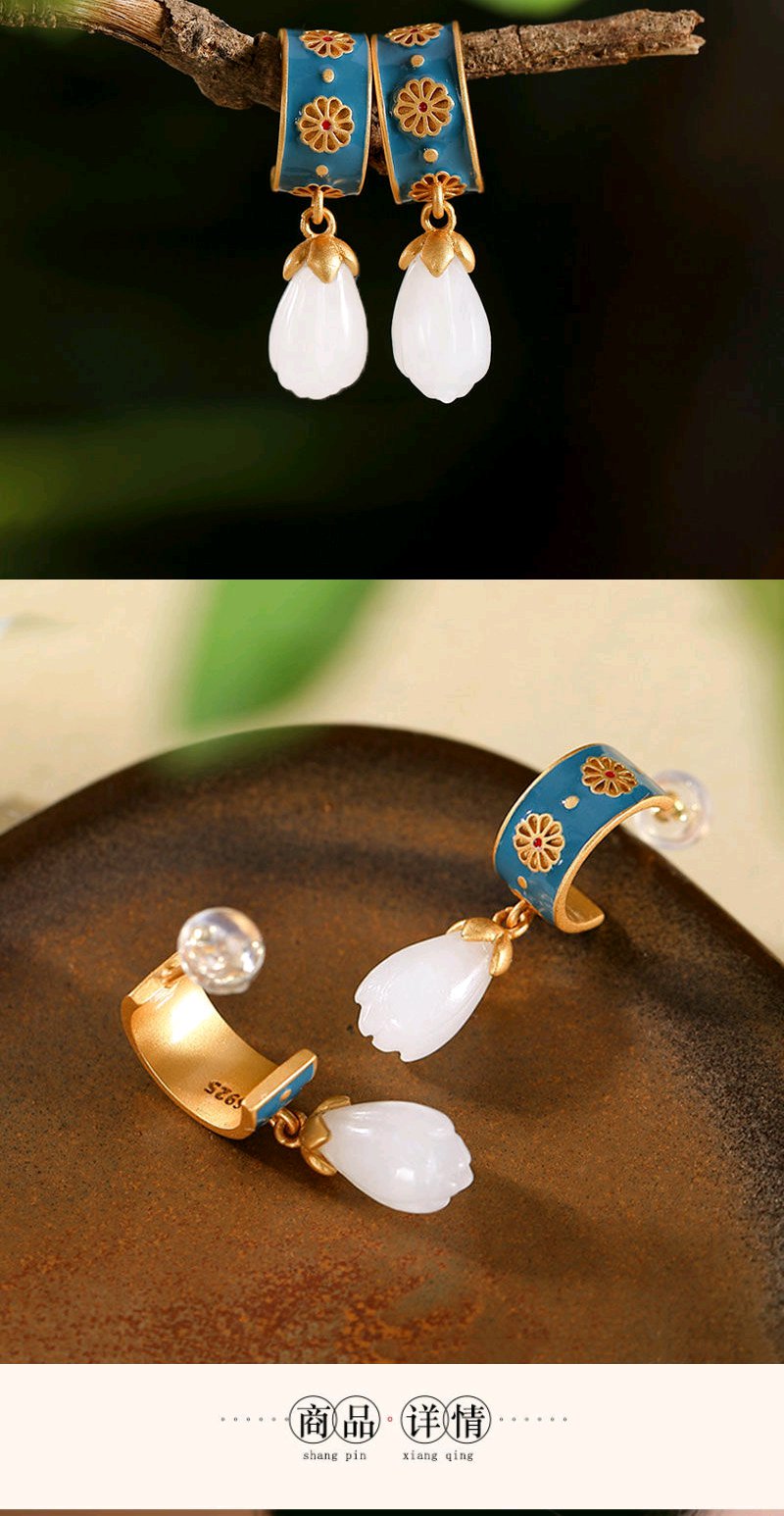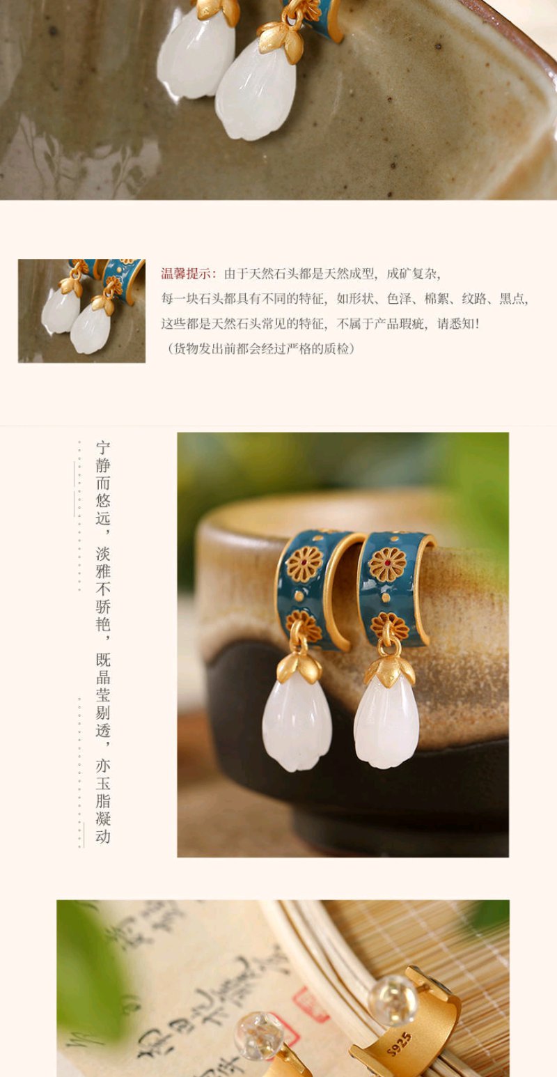925银滴油耳钉仿和田玉古风创意高档个性玉兰花女款耳钉耳坠