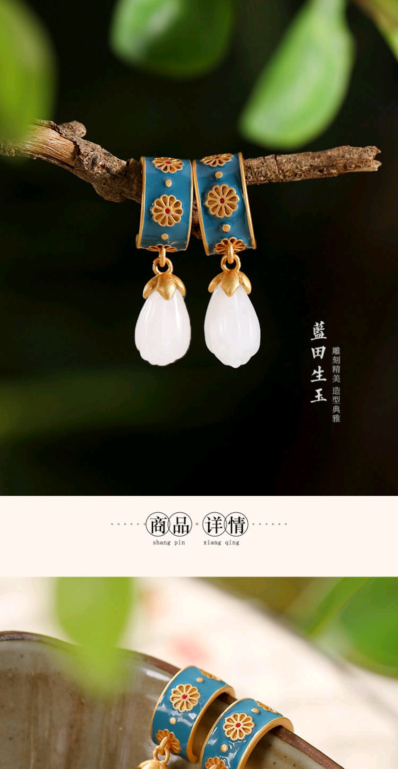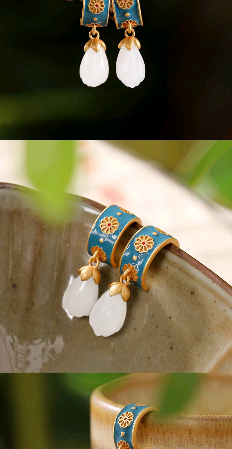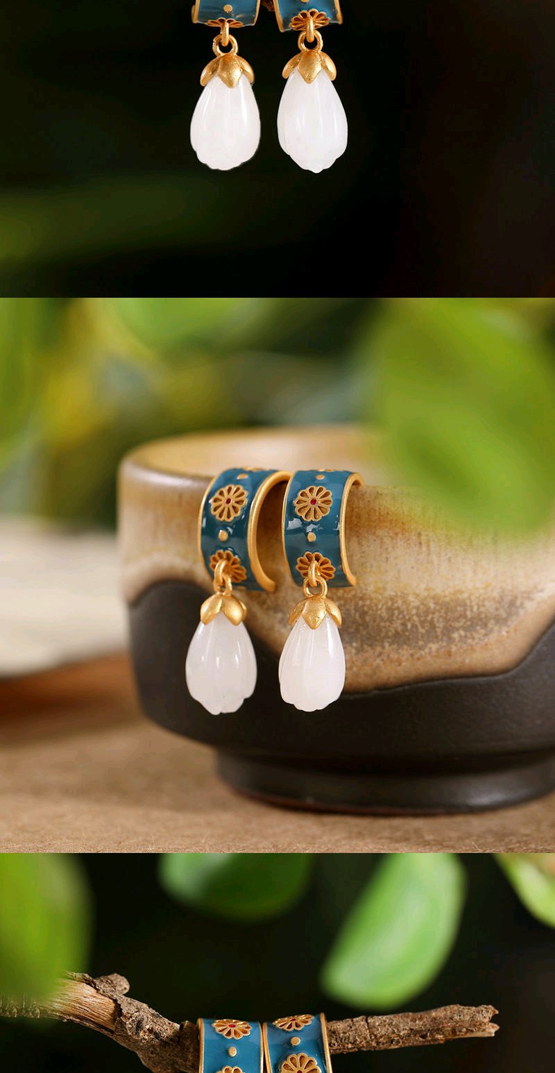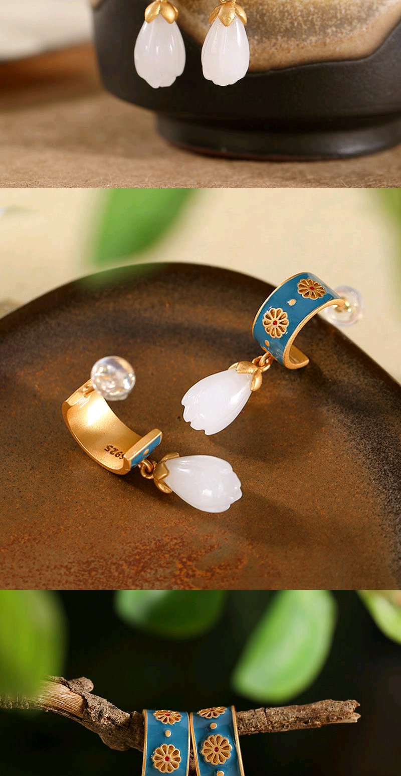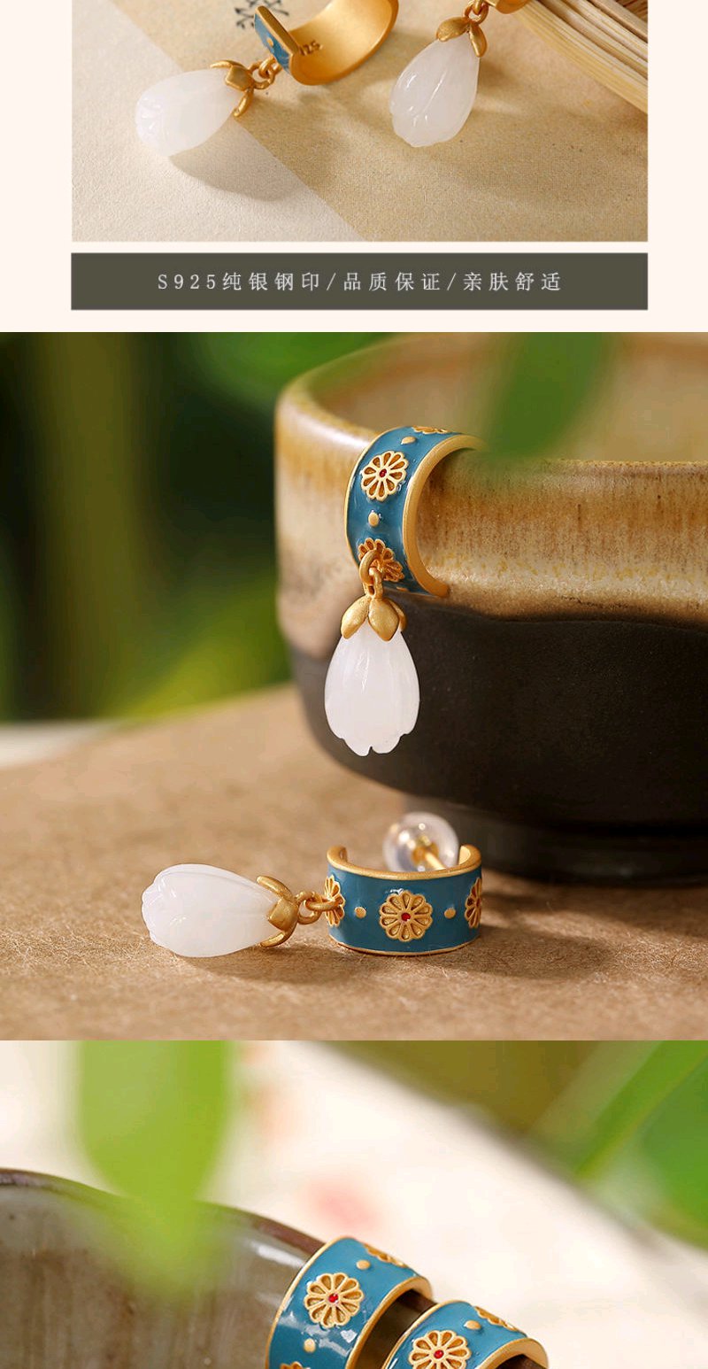 925银滴油耳钉仿和田玉古风创意高档个性玉兰花女款耳钉耳坠
