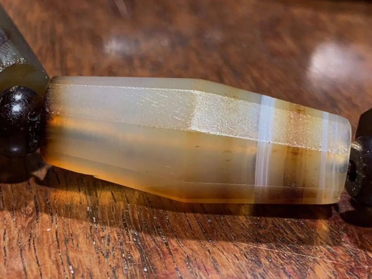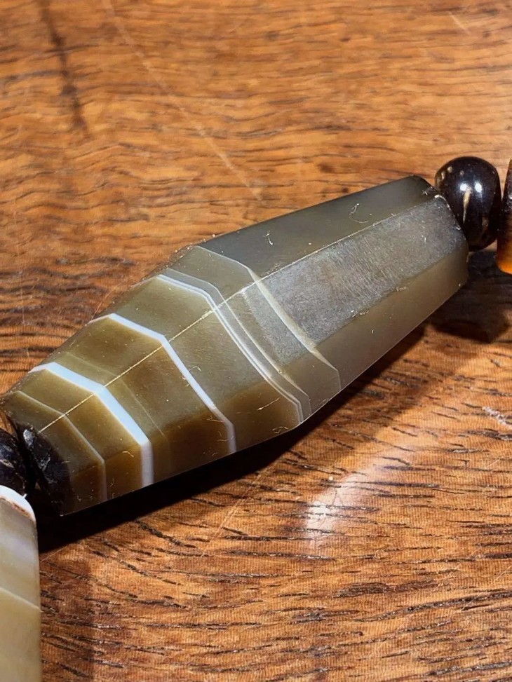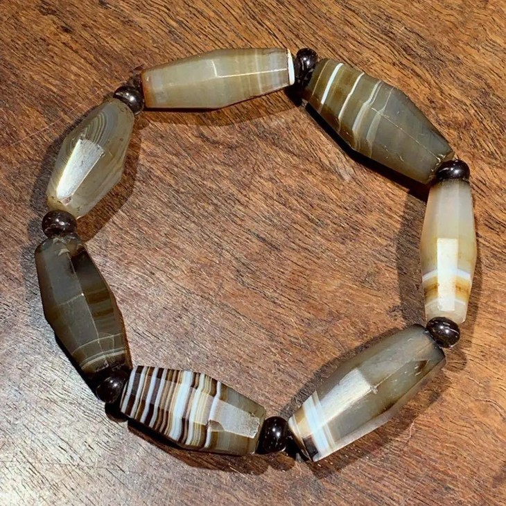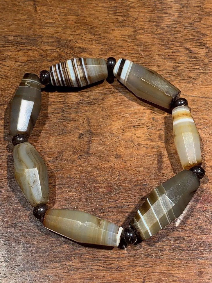 此组老缠丝玛瑙八角橄榄核型珠共七粒,原散珠以伸缩弹性线与琉璃隔珠简易成串,依其钻孔方式、孔道沿磨痕与造型判断,是年代久远的高古老缠丝玛瑙珠。入手可直接当手链佩戴,男女皆宜,典雅贵气。或可融入当代首饰设计,珠型独特简约大气,材质高贵典雅。孔道内与珠表稍有积垢,浸泡肥皂水后可清除。
