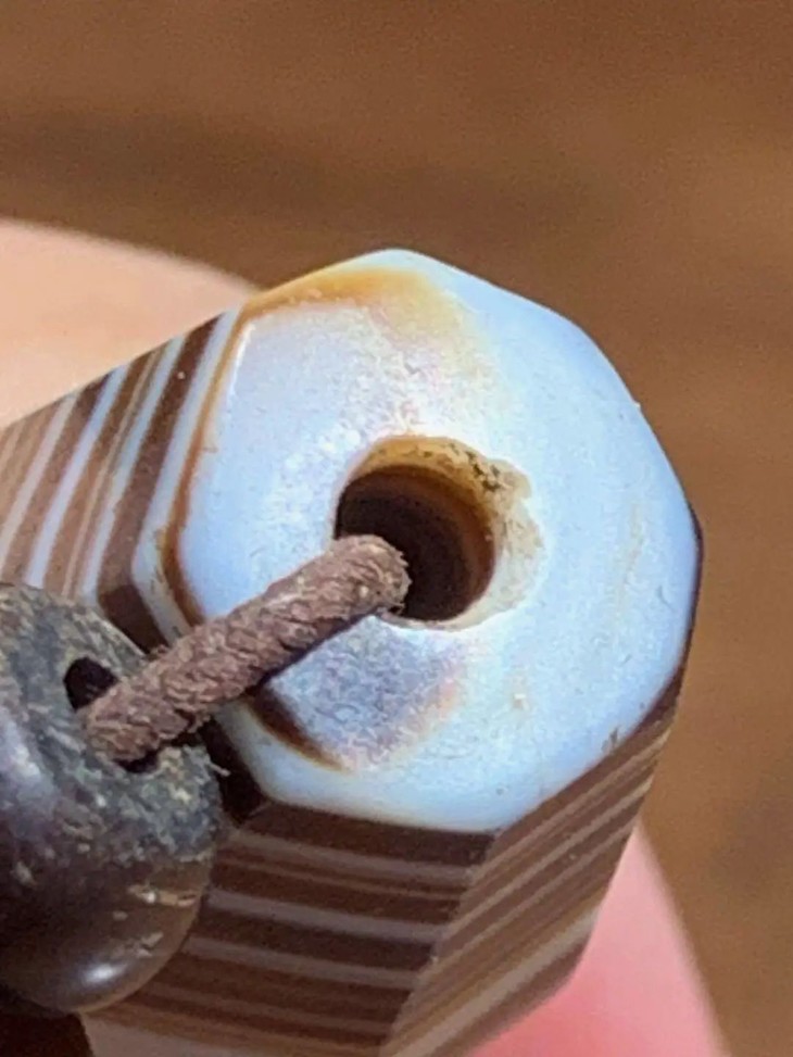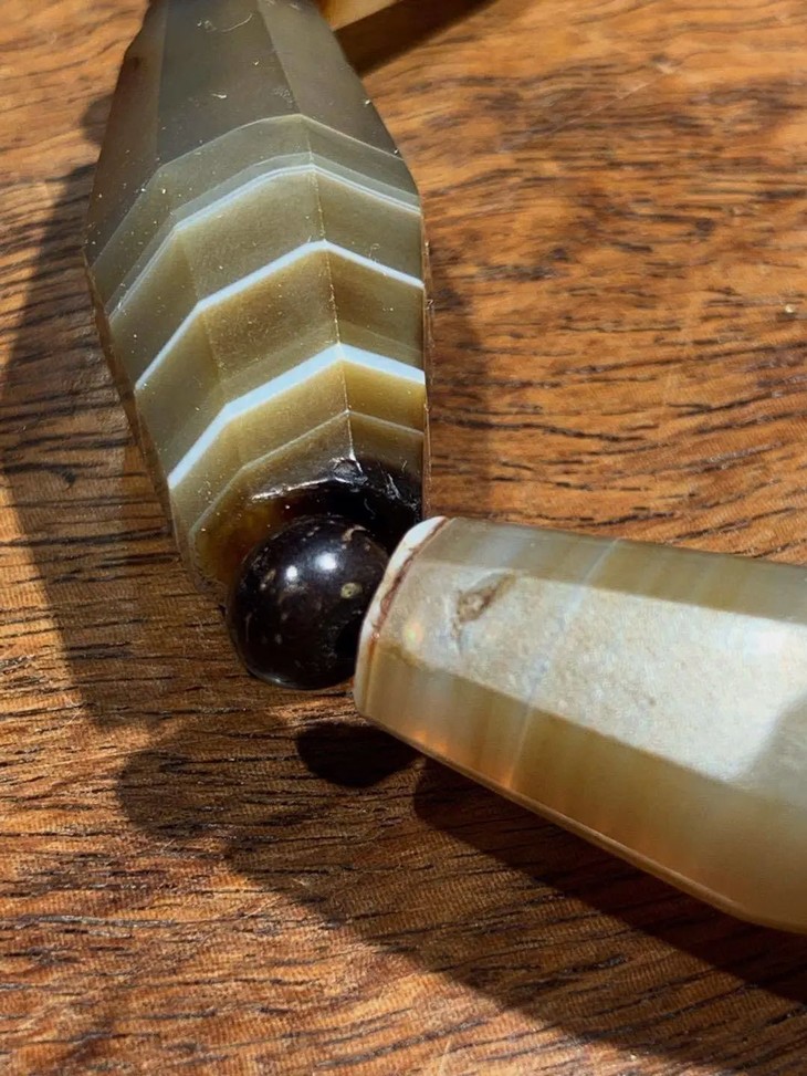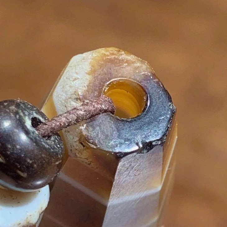 这是一组天然缠丝玛瑙雕刻琢磨而成的老橄榄核形珠,八角型橄榄核珠造型独特,缠丝玛瑙质地堅硬,天然缠丝纹理清晰自然,老包浆皮壳温润细腻,旧时代对孔打眼,孔沿磨损痕清晰可见。